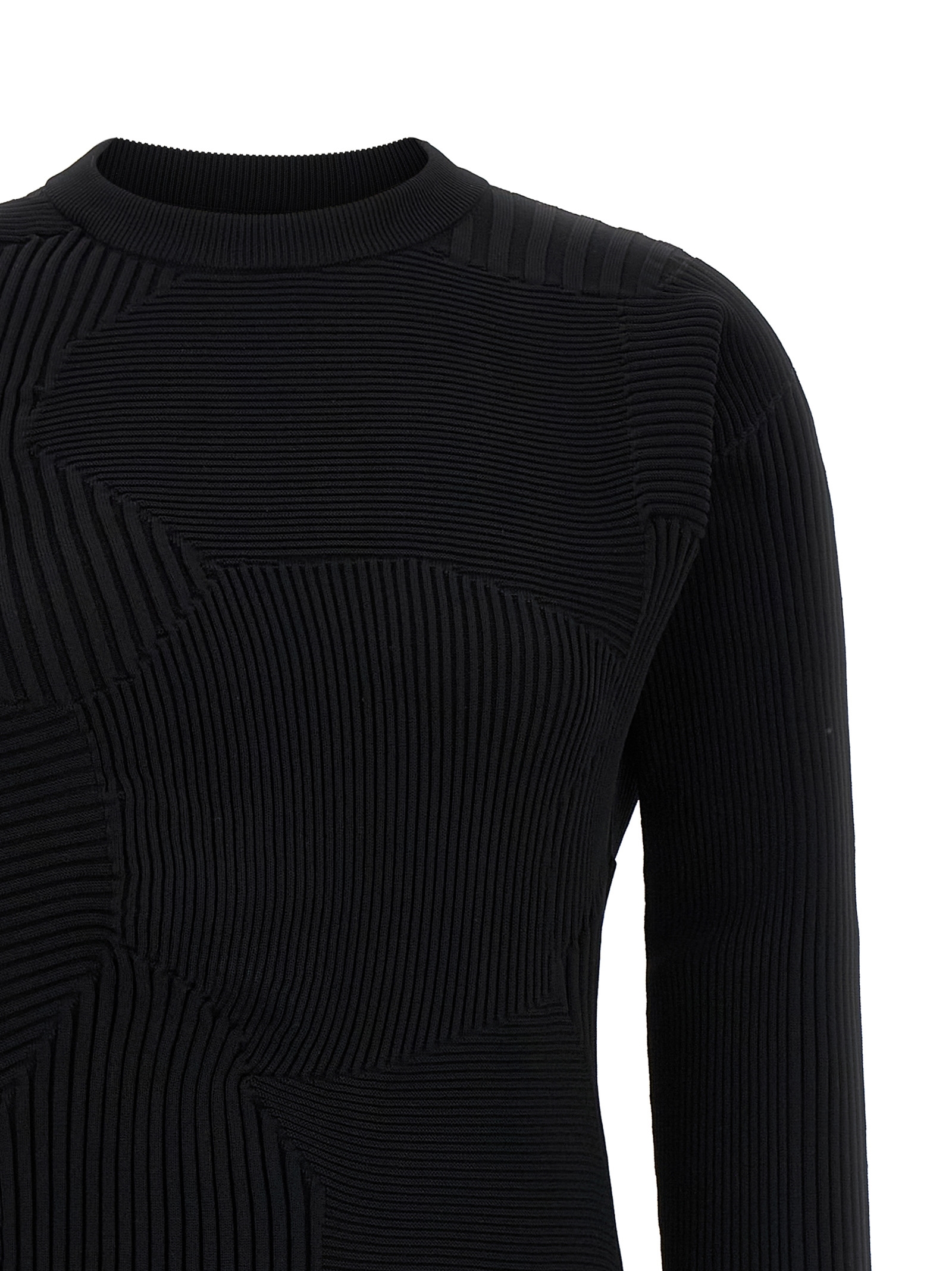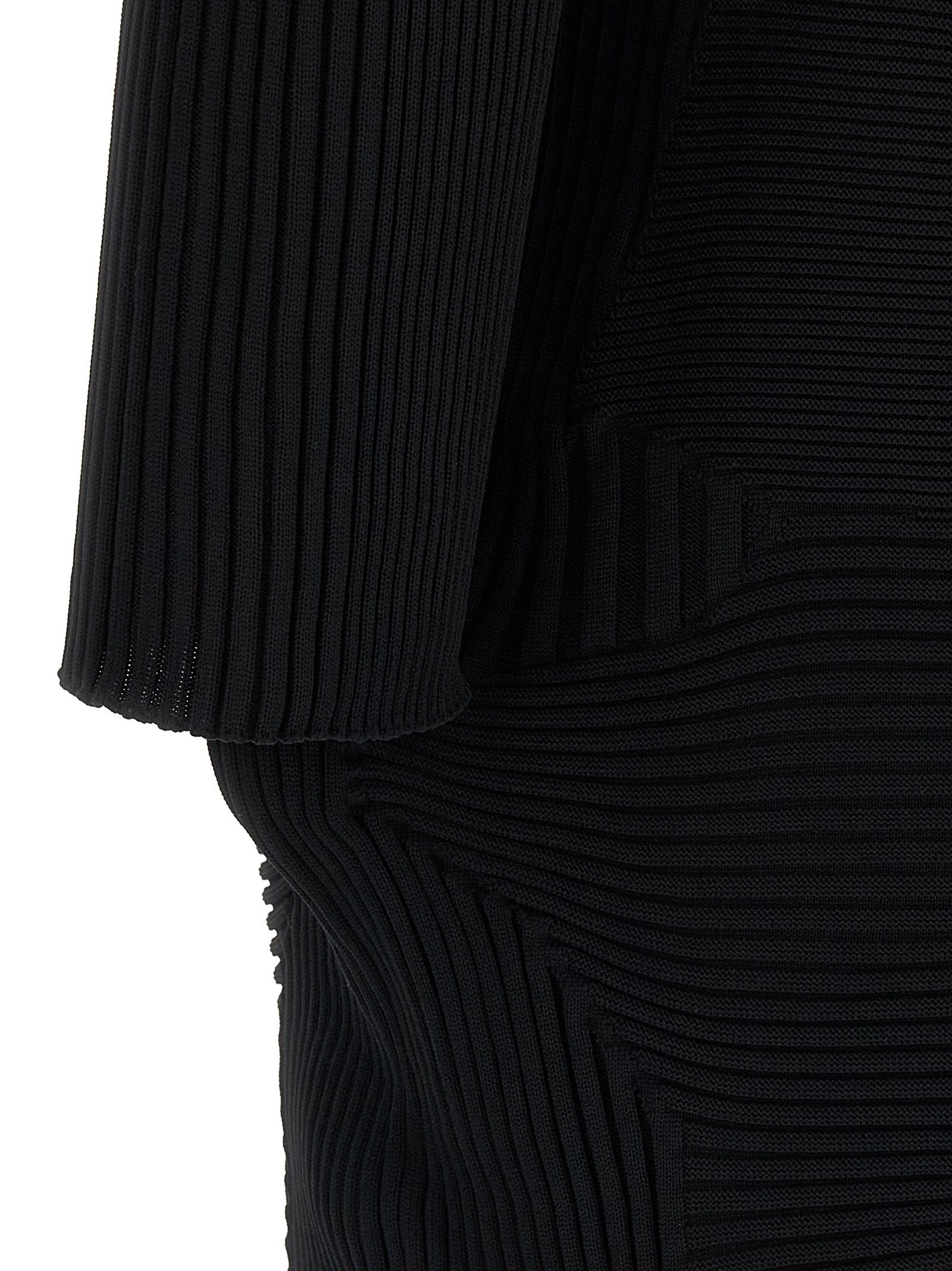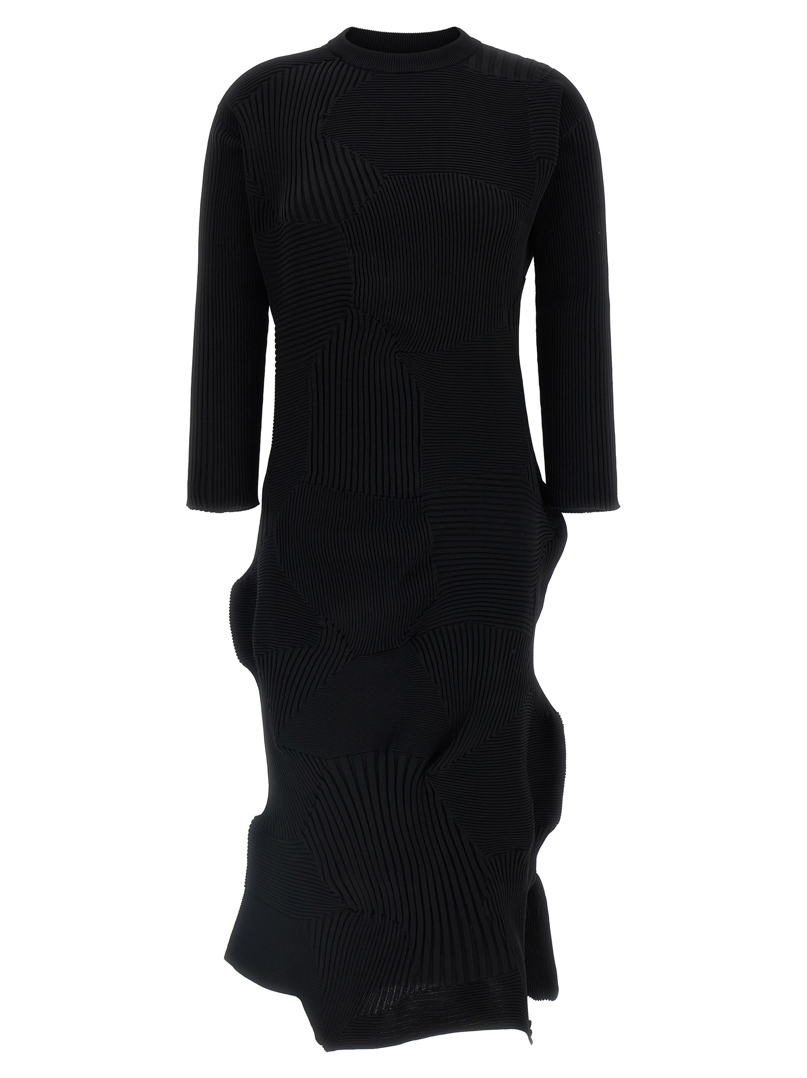 Kone Kone' midi dress in patchwork, seamless pleated fabric, elastic weave structure made with multiple knitted patterns, round neckline, long sleeves, side split, and asymmetrical hem.