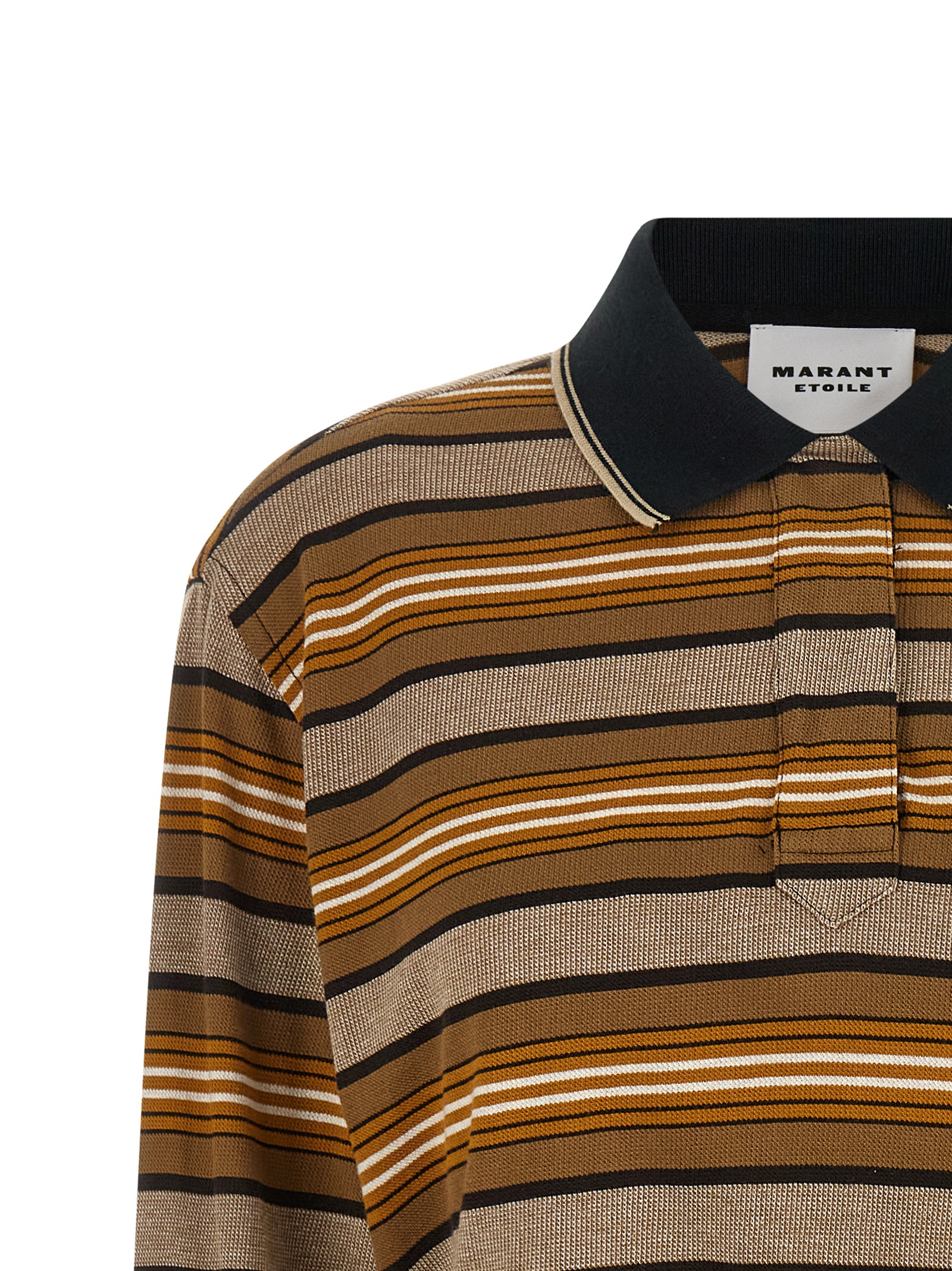 'Isea' striped cotton piquet dress, polo shirt style with contrast collar and 3-button closure, straight cut with side lace and knotted with ring, long sleeves with cuffs and button.