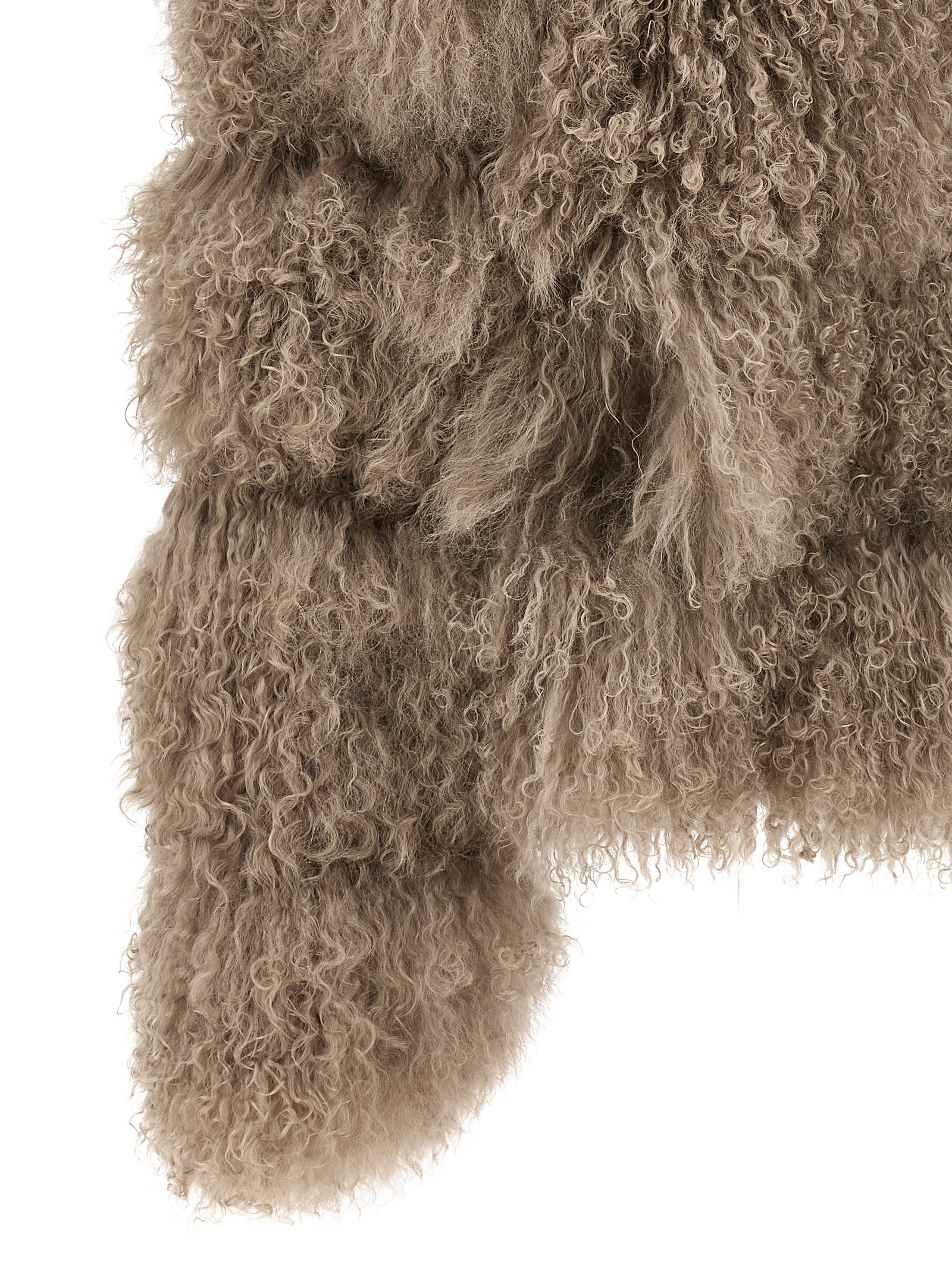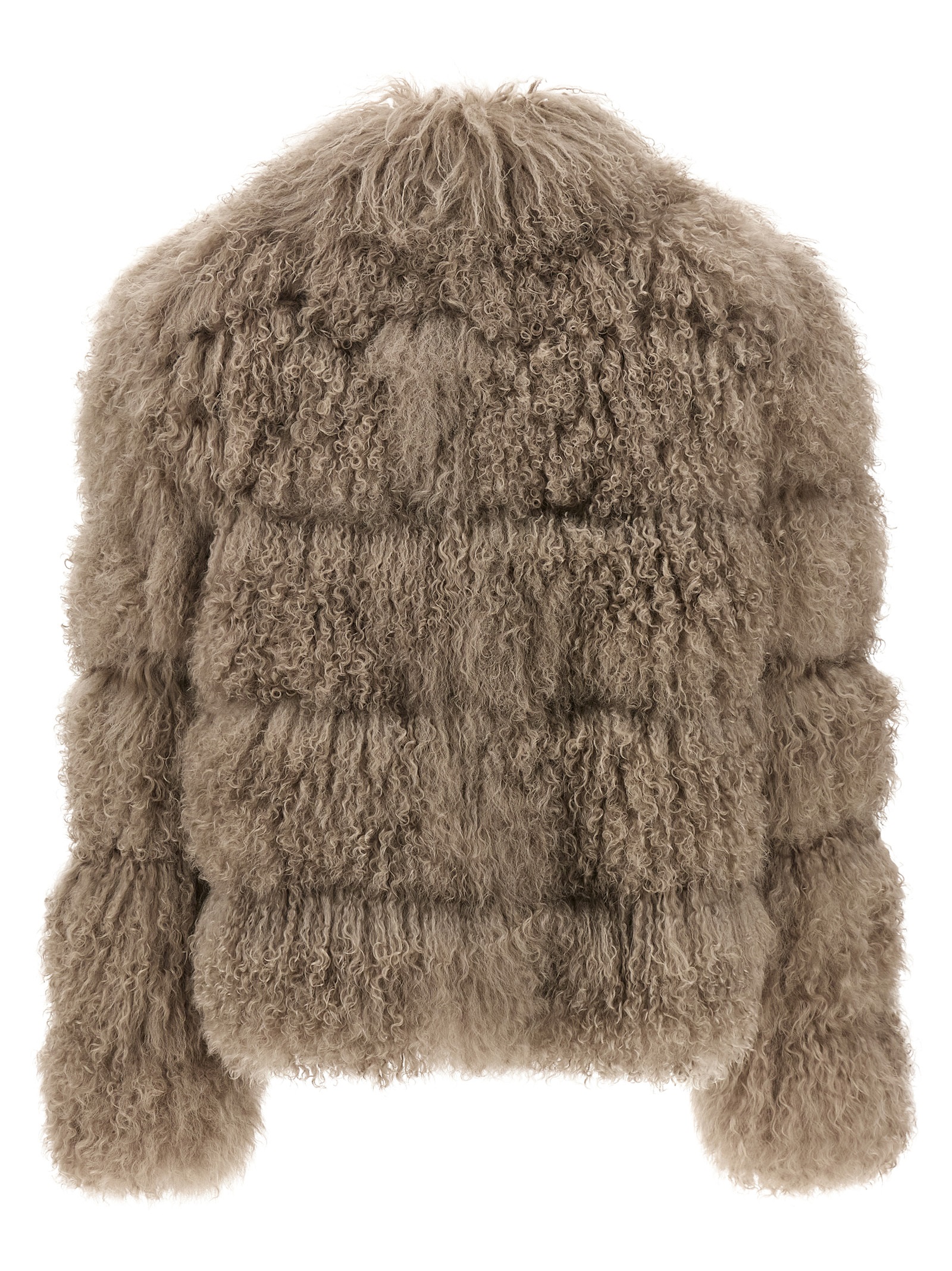 Mongolian fur 'Paris' jacket with front snap button closure, pockets, long sleeves, monogram silk lining.