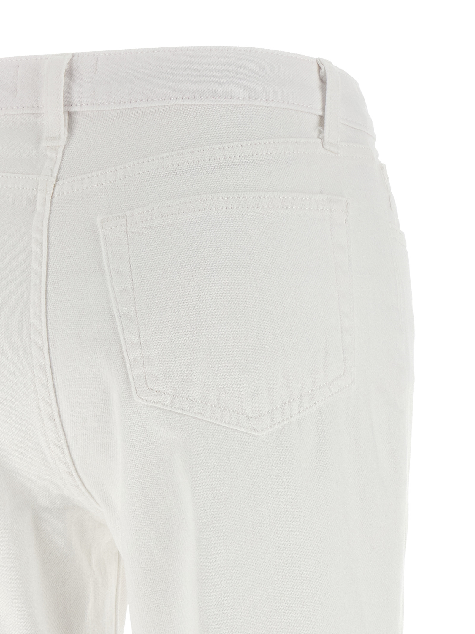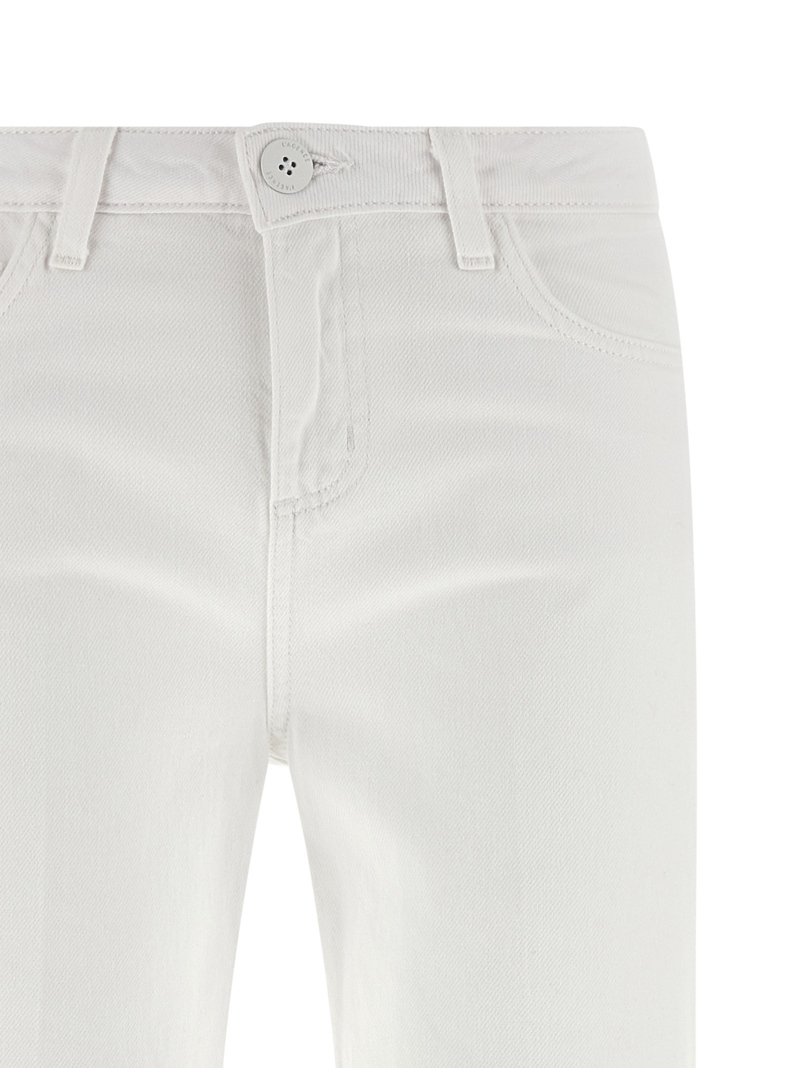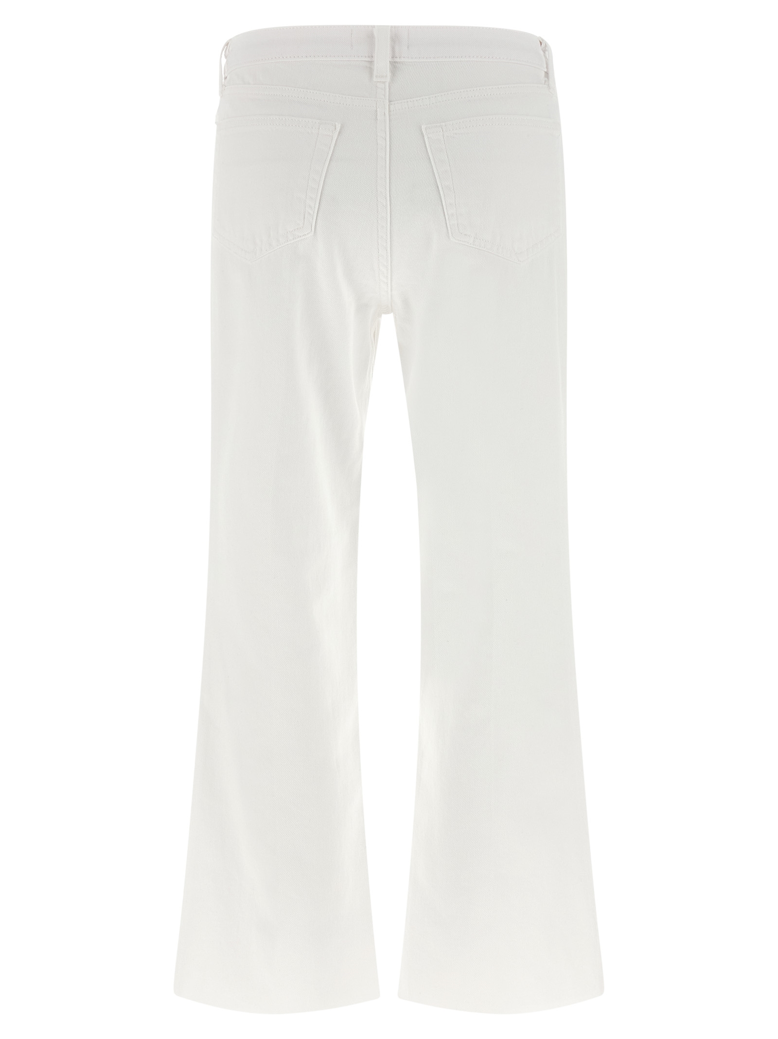 'Wanda' cropped cotton denim jeans with flared leg, low waist, zip and front button closure, five pockets, raw cut hem on the leg bottom.