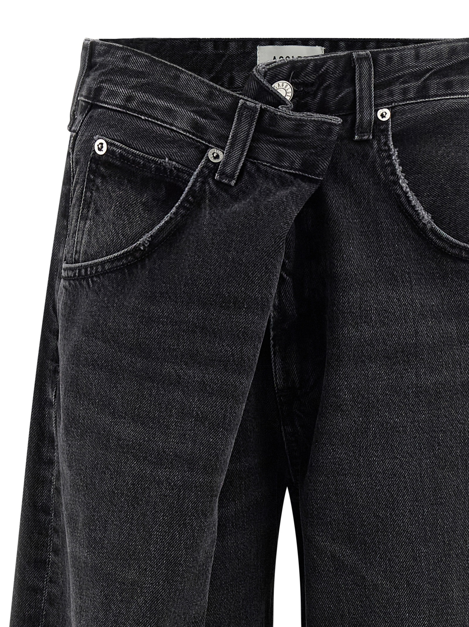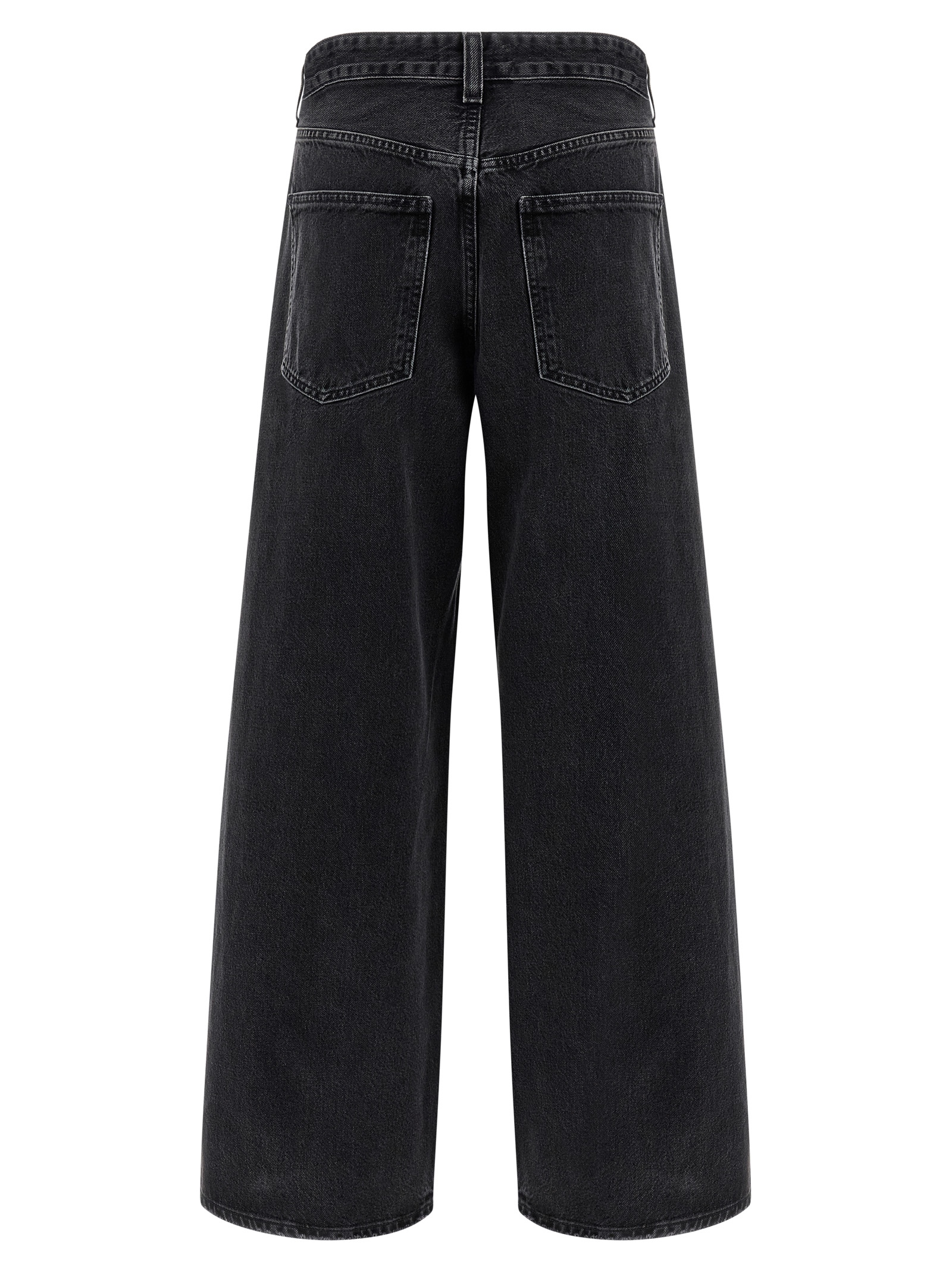 'Vana' stonewashed cotton denim jeans with low crotch and wide leg, book closure with zip, hook and front button, five pockets.