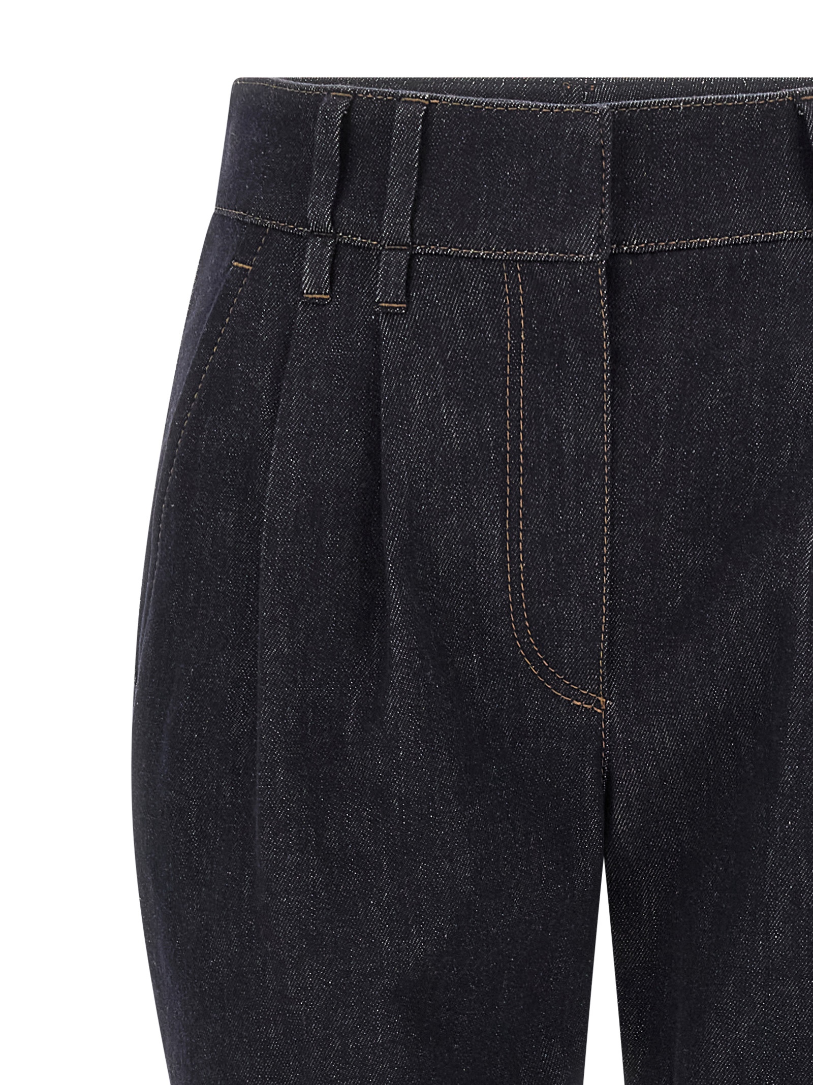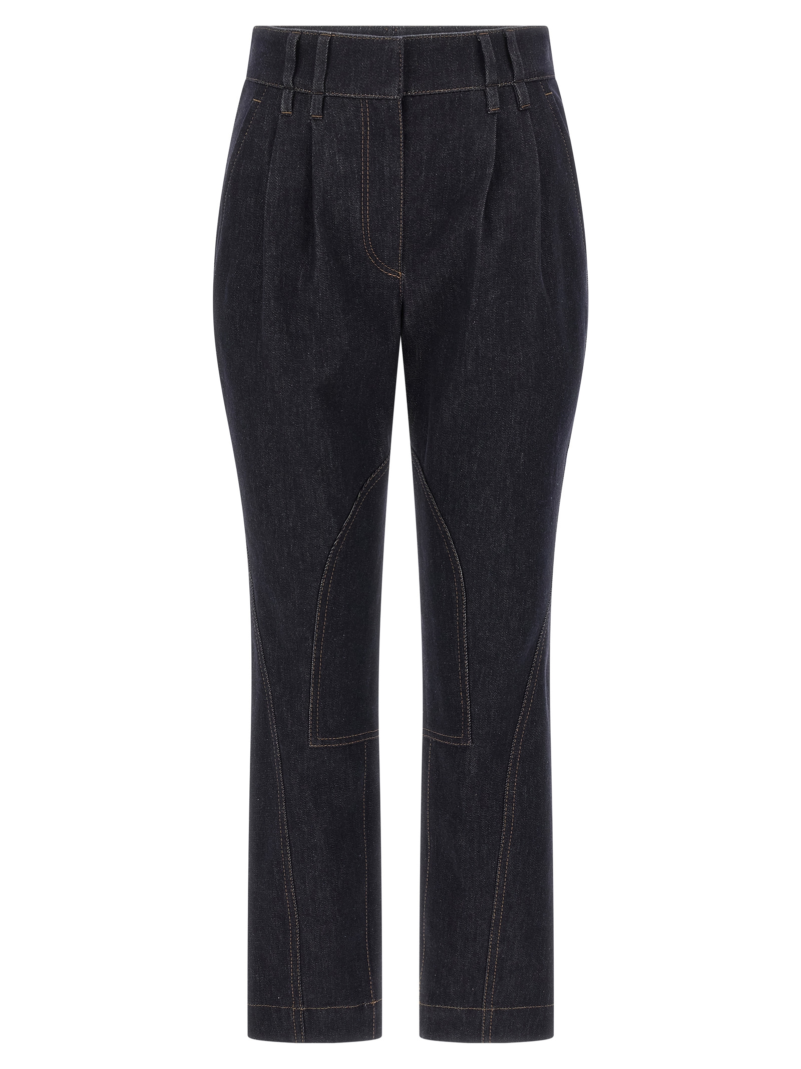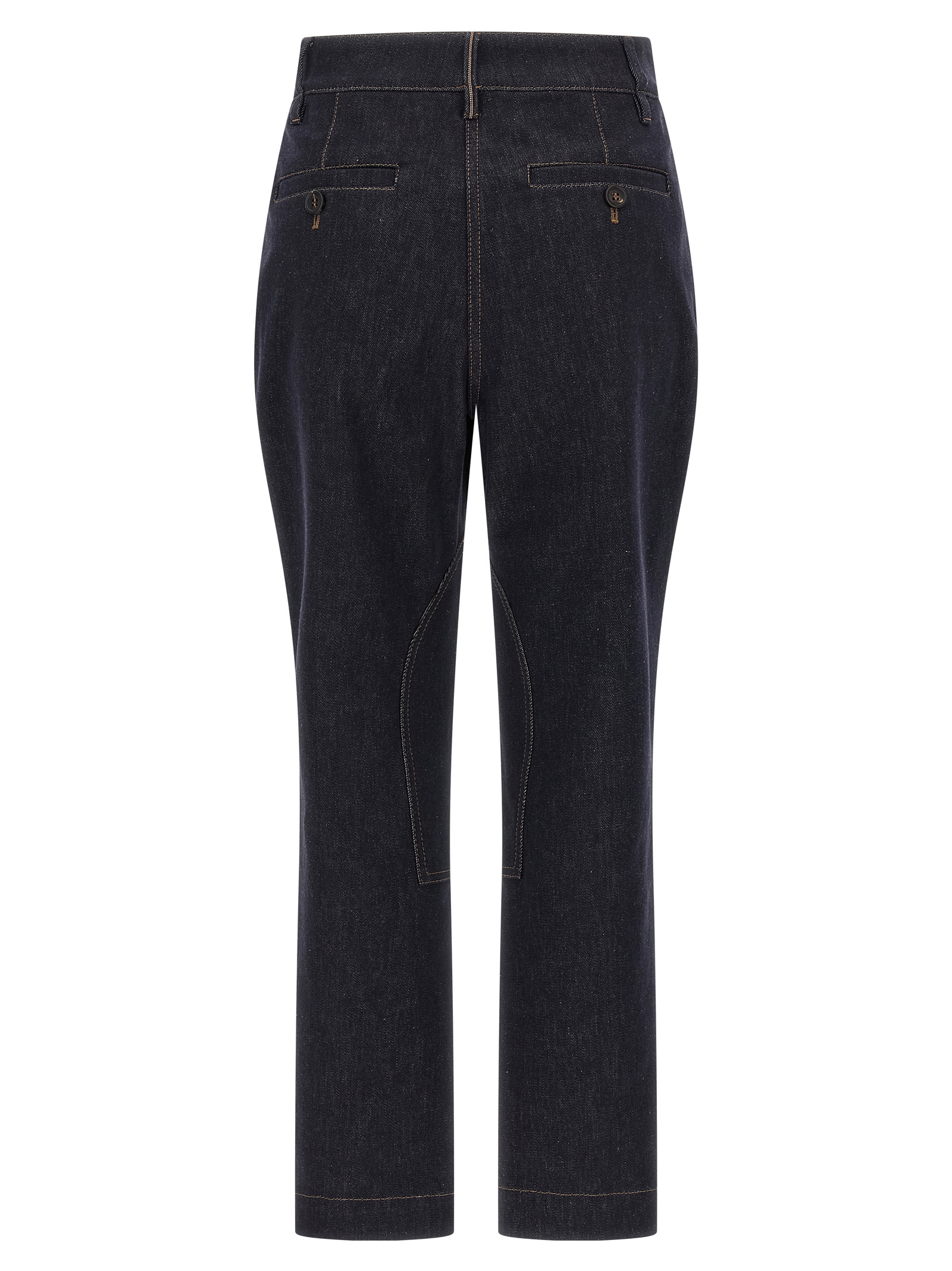 'Equestrian' denim no fade comfort jeans, contrast stitching, double front pincer, hook and button zip closure, leg that tightens at the end, Monile detail at the back.
