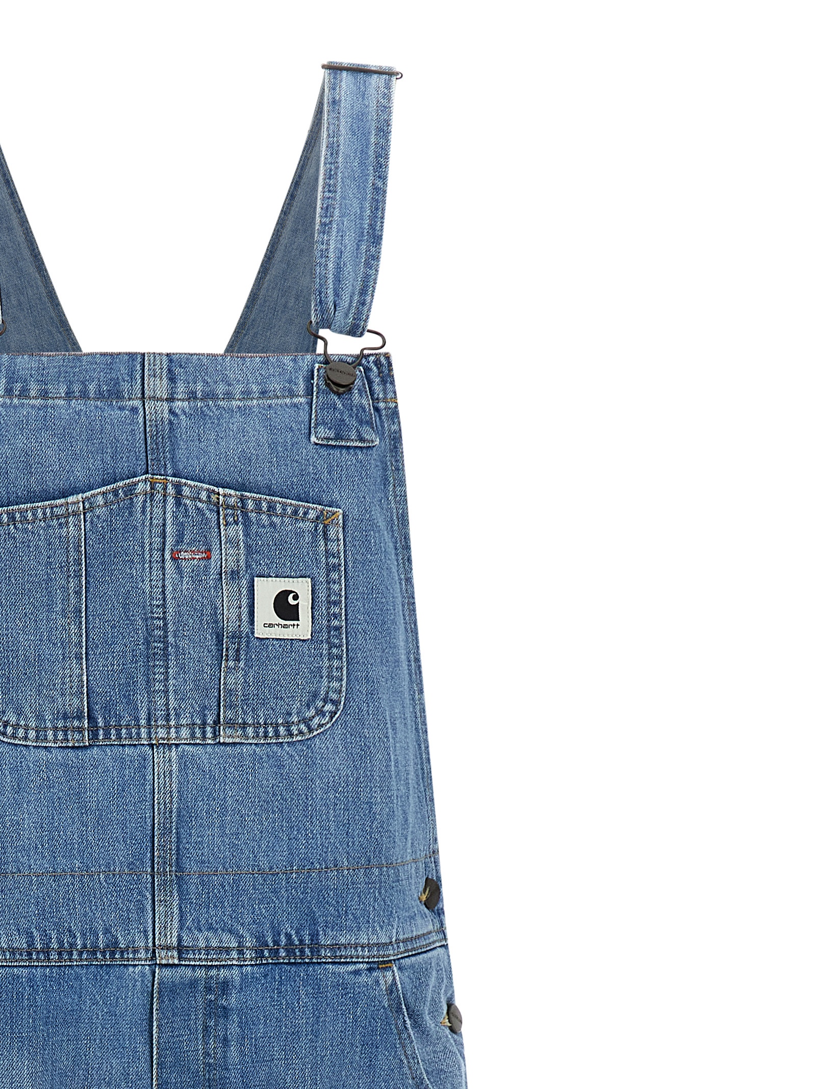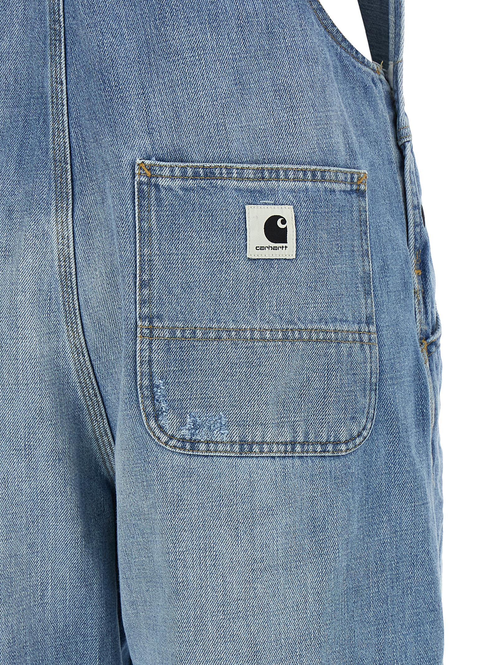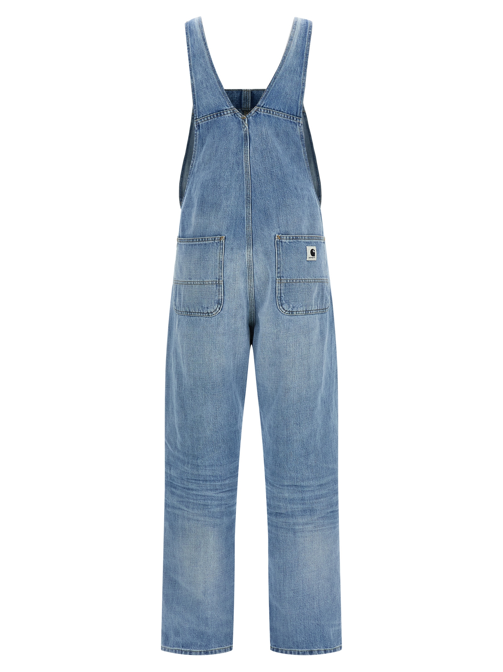 'Bib Overall' jumpsuit in heavy stone-washed cotton denim with contrast stitching, workwear pattern, front logo patch, adjustable braces, trompe l'oeil flap, adjustable side buttons, pockets, wide and straight leg.