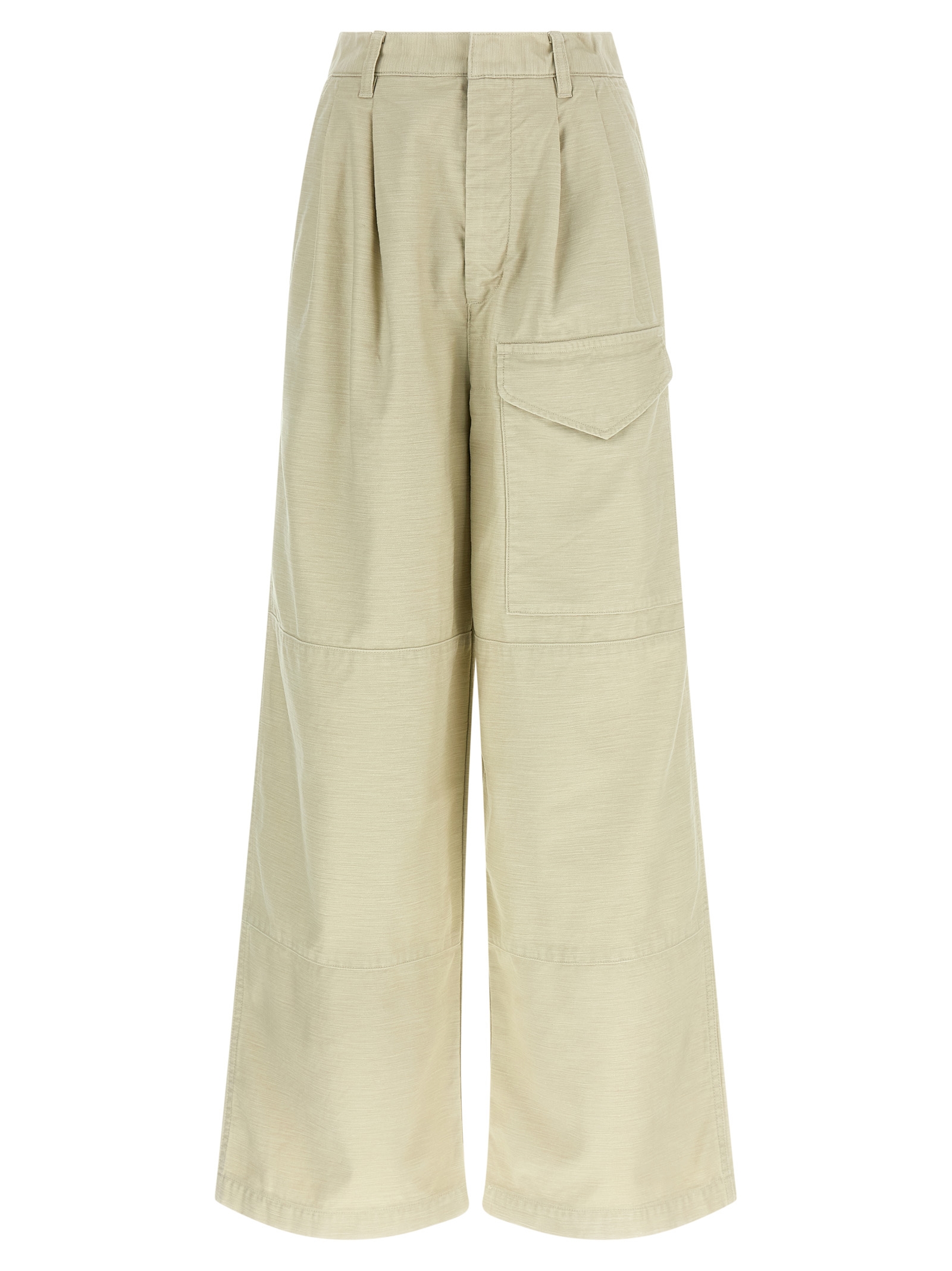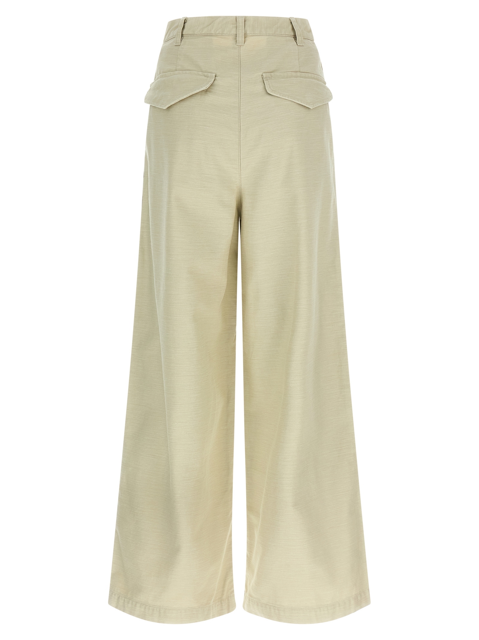 Pants in satin bag fabric made with Egyptian Finx cotton extra-long bow for the warp, twisted into three threads to enhance its fullness and softness and a rough yarn, thick and irregular for the weft, cargo model, pin tucks, wide leg, zip closure and front snap button, pockets.
