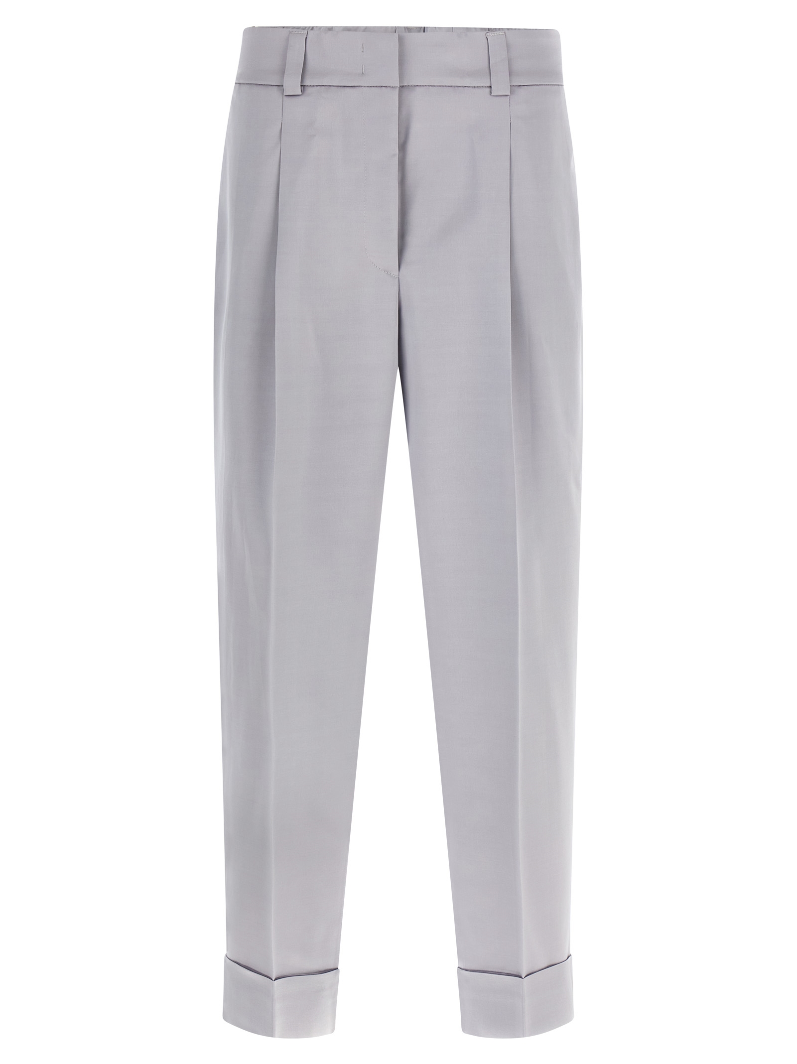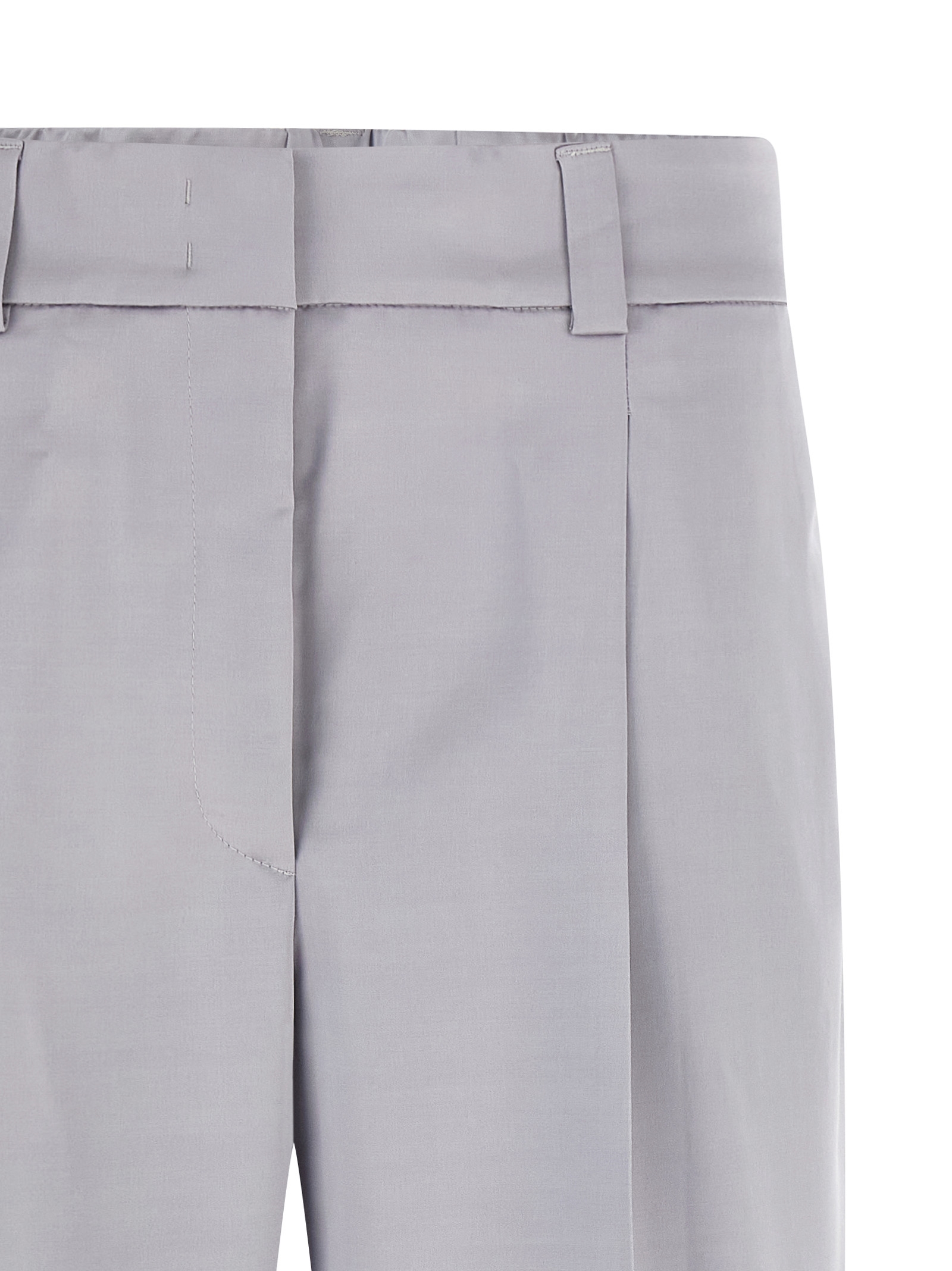 Viscose and wool fluid satin trousers, pince, stretched pleat, zip hook and button closure on the front, pockets, turn-up on the leg bottom.