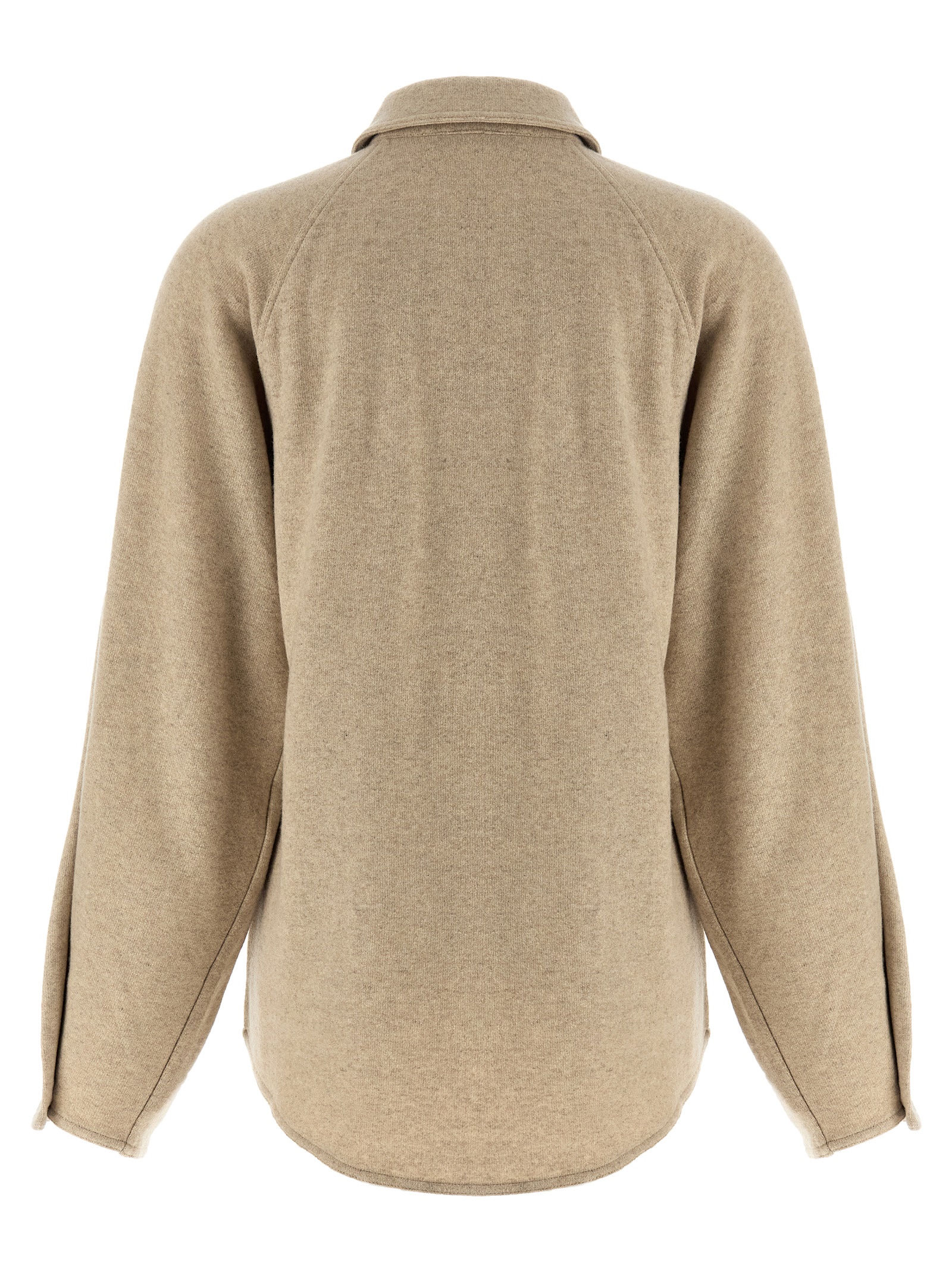 'Ceci' mélange stretch cashmere flannel overshirt, tone-on-tone logo embroidery and front button closure, long raglan sleeves with button and counter pleat on the hem, and asymmetric hem.