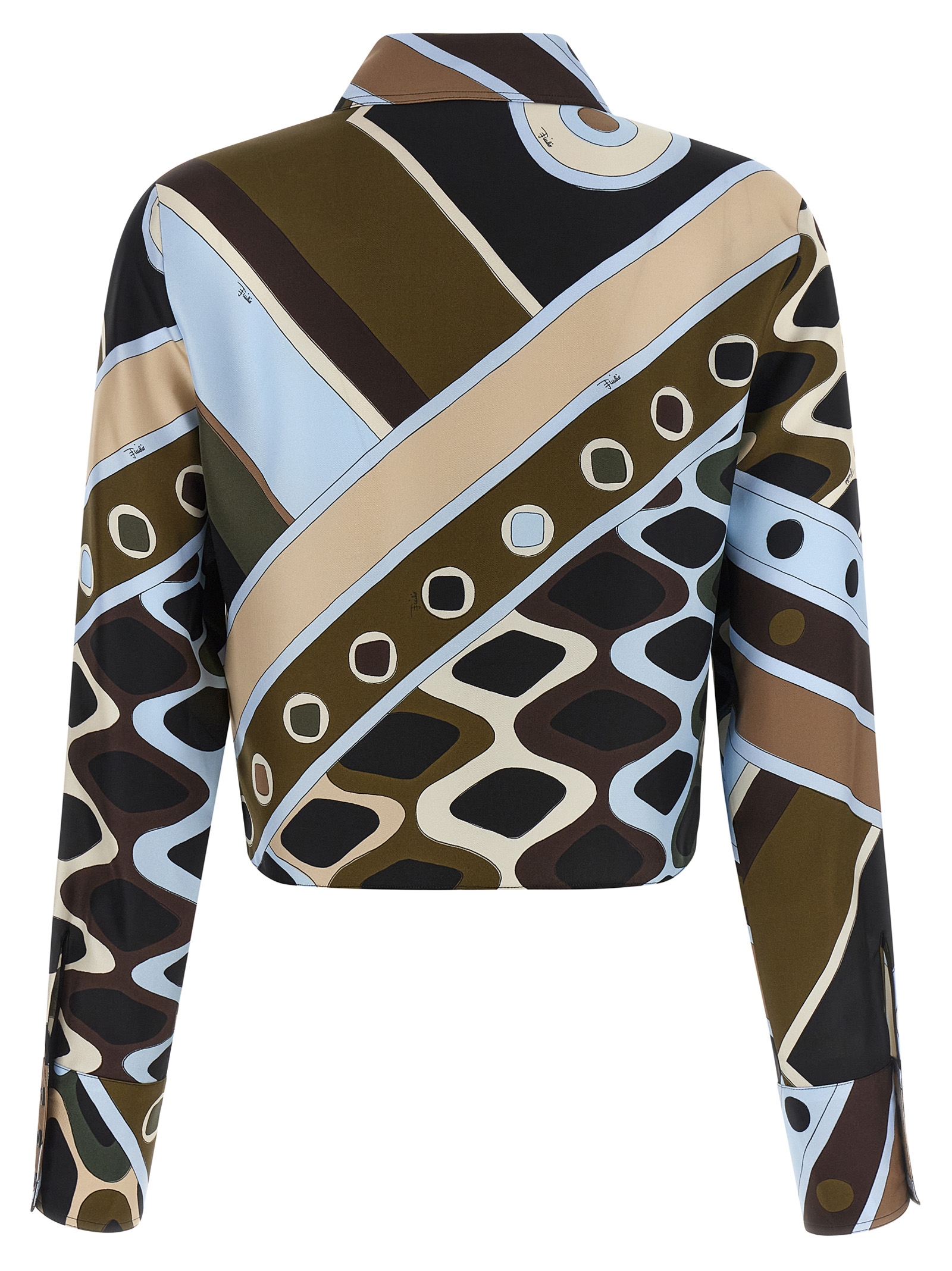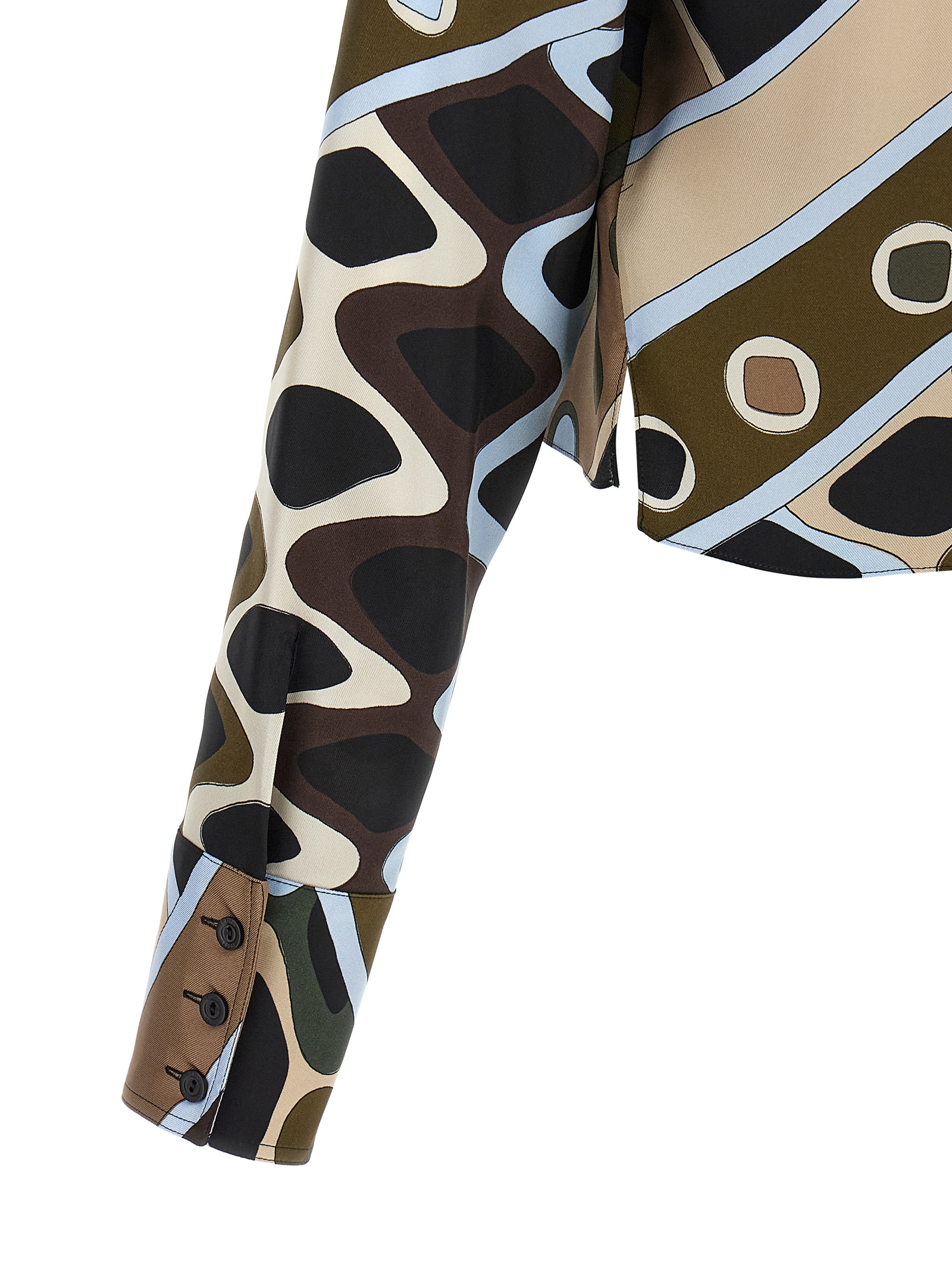 All over 'Vivara' print silk twill shirt, classic collar, crop style, front button closure, side splits, long cuffed sleeves.