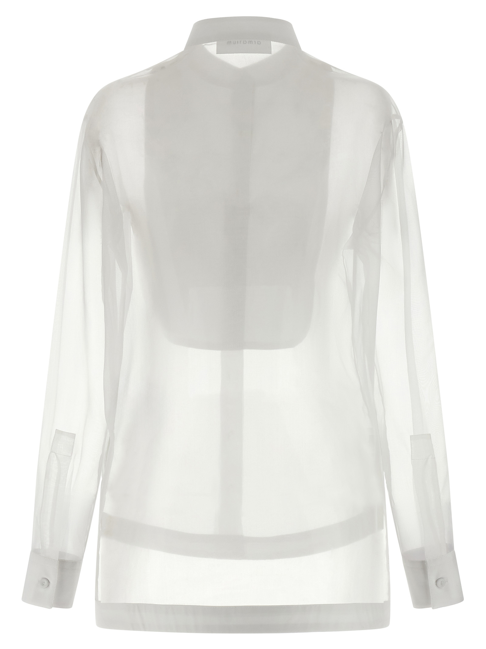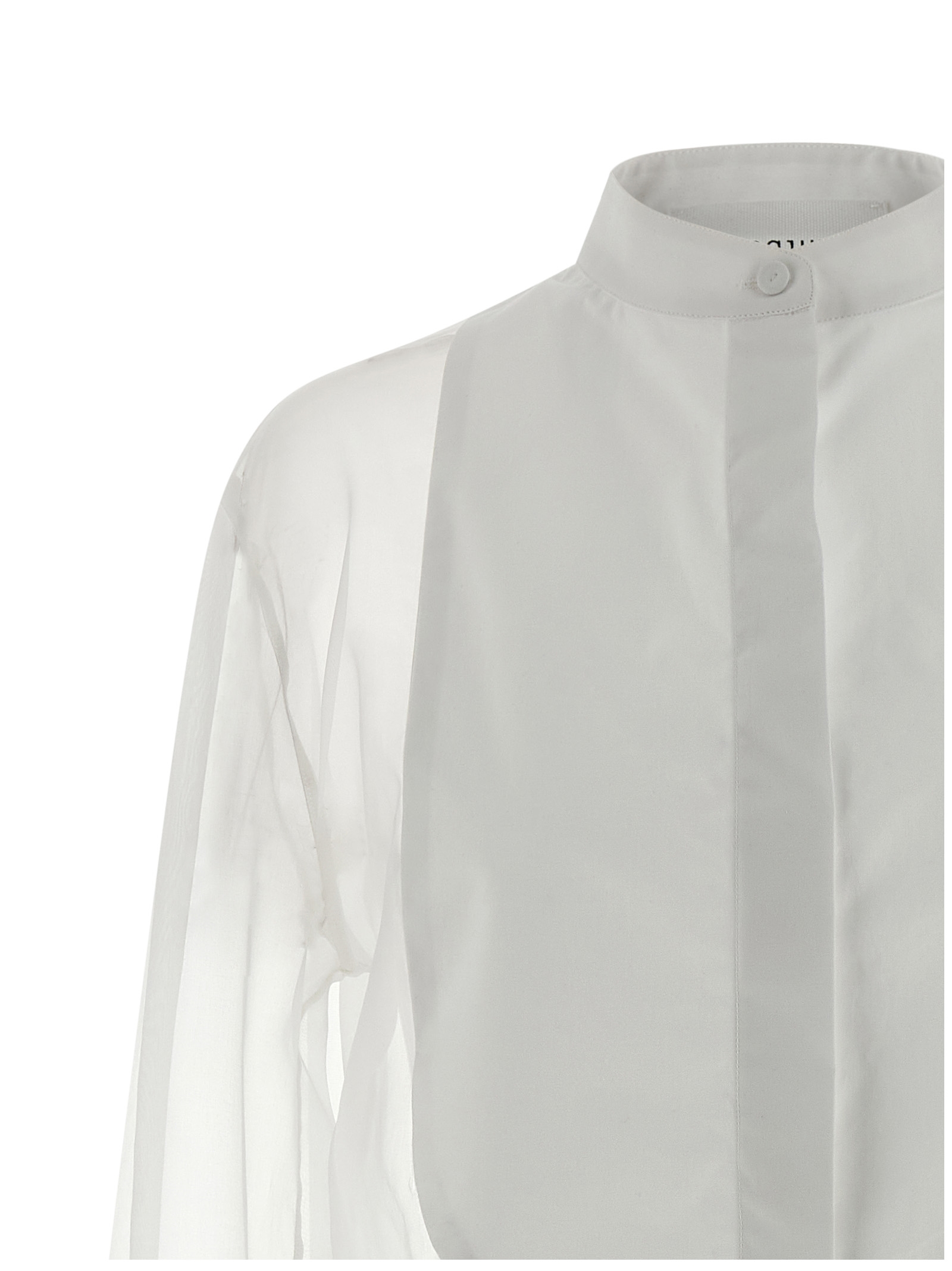 'Prisca' semi-transparent silk organza shirt, tuxedo model, double plastron in cotton poplin, mandarin collar, front button closure, long cuffed sleeves, asymmetric hem, side slits.