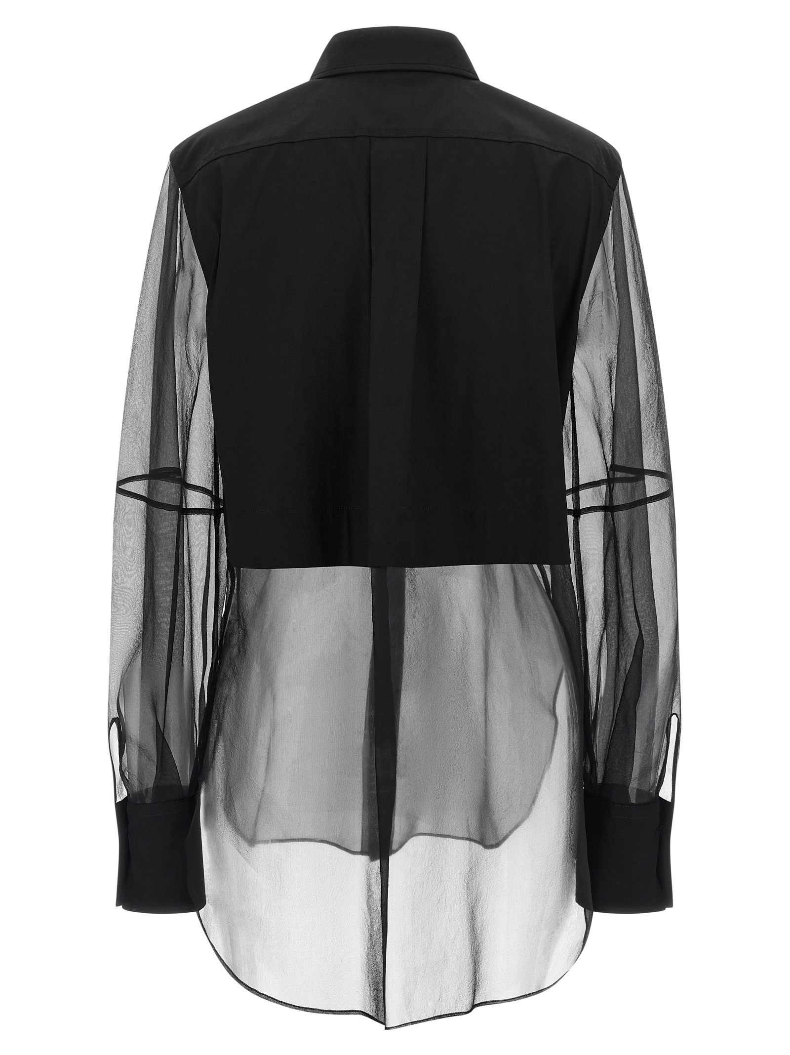 Stretch cotton poplin and semi-transparent crispy silk shirt, concealed front button closure with Monile 'Shiny Trims' detail, long wide sleeves with cuffs.
