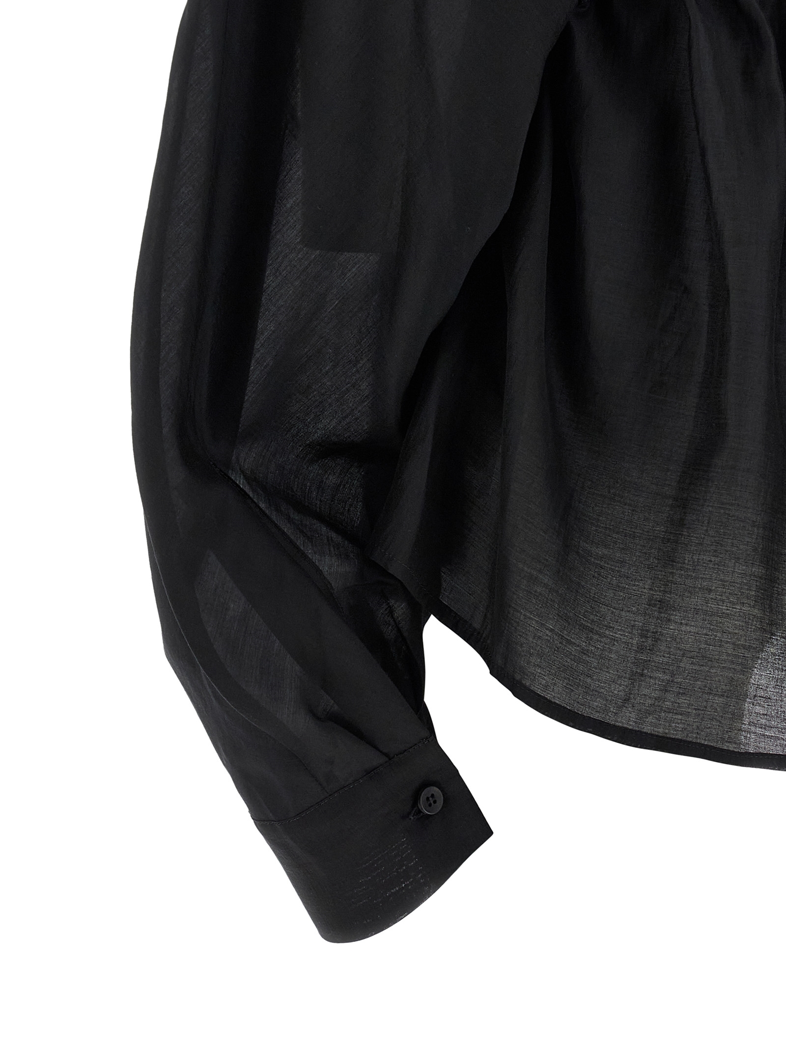 'Dalida' light muslin shirt with front mother-of-pearl button closure, drawstring at the waist, long wide sleeves with cuffs and dropped shoulders, asymmetrical hem.