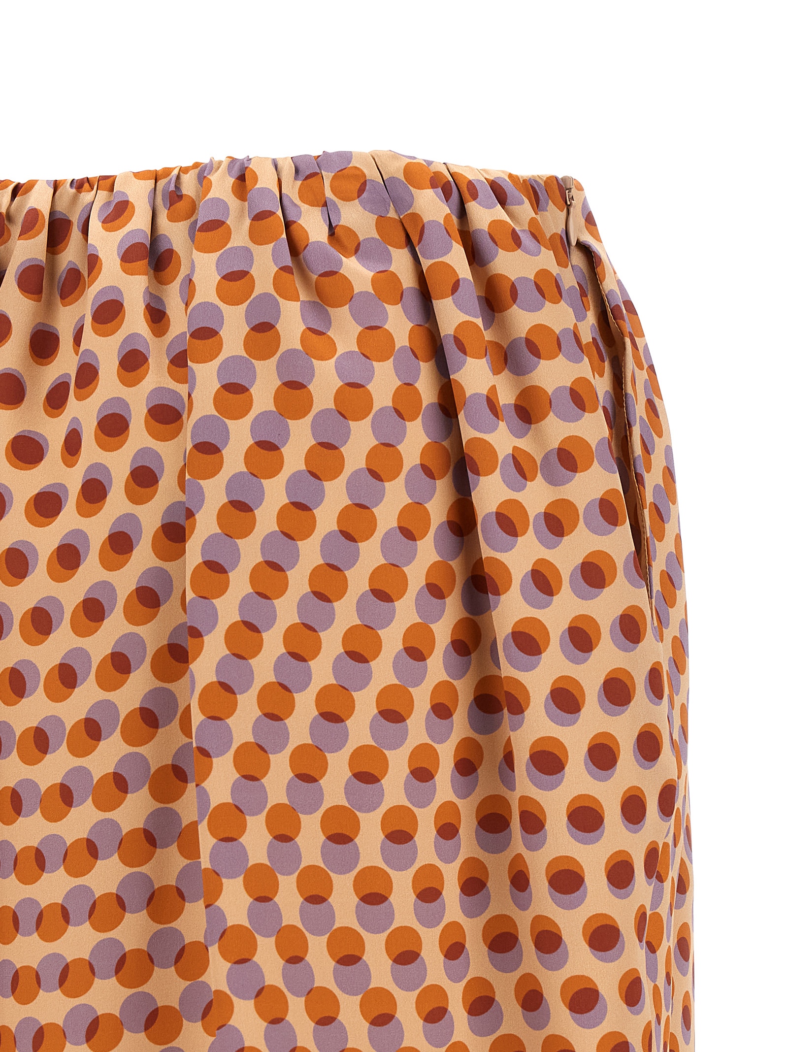 'Saronga Bis' polka dot patterned silk skirt, longuette model, overlapping draping, side zip closure, asymmetrical hem, lining.
