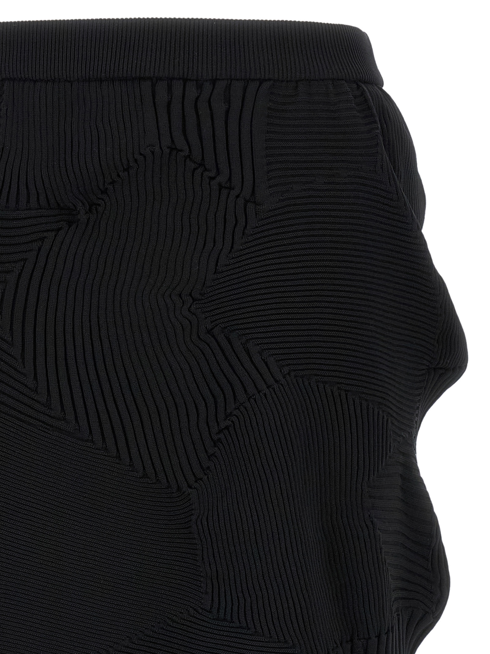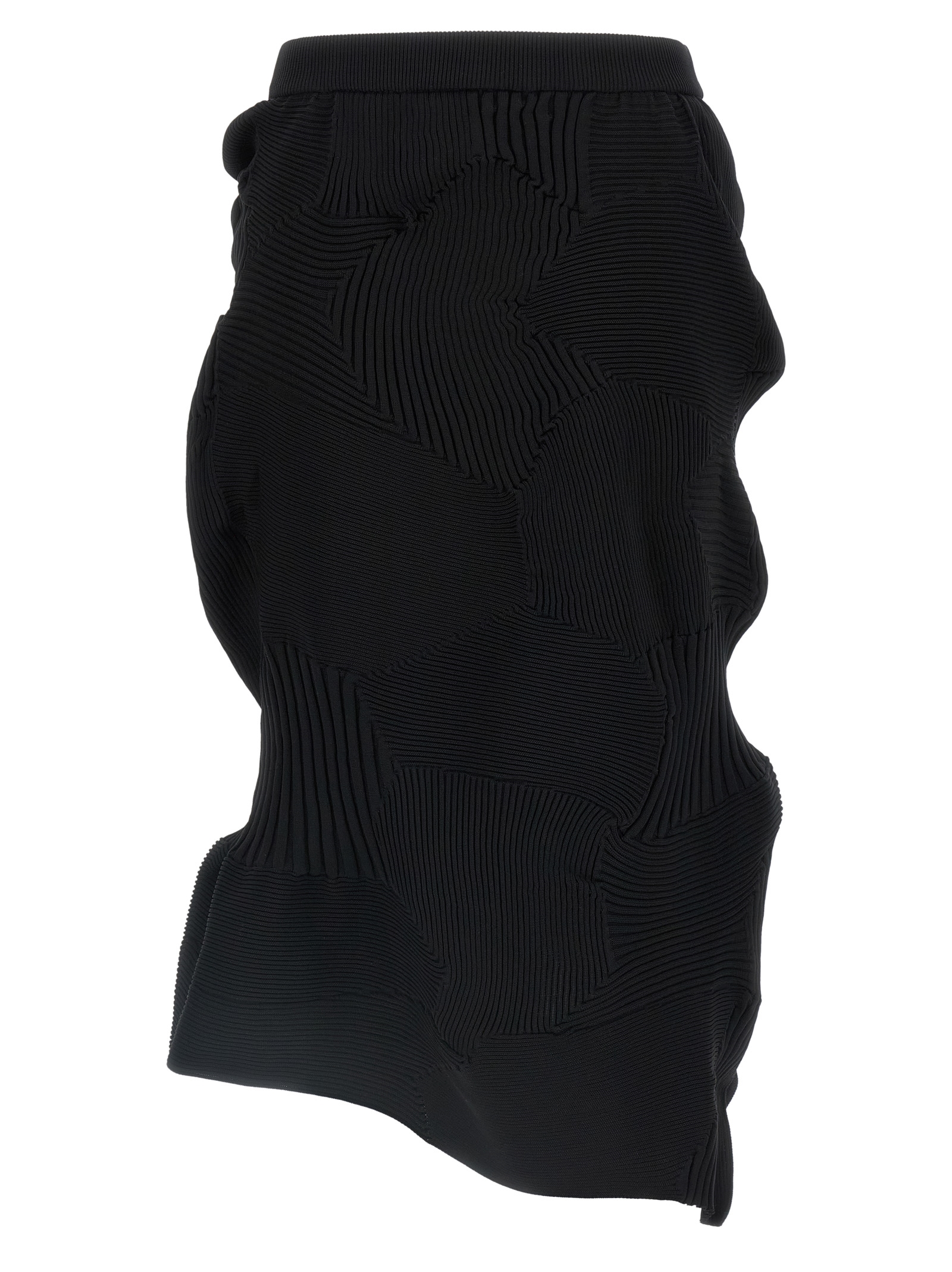 Kone Kone' midi skirt in patchwork, seamless pleated fabric with elastic weave structure made with multiple knitted patterns, elastic waistband, side split, and asymmetrical hem.
