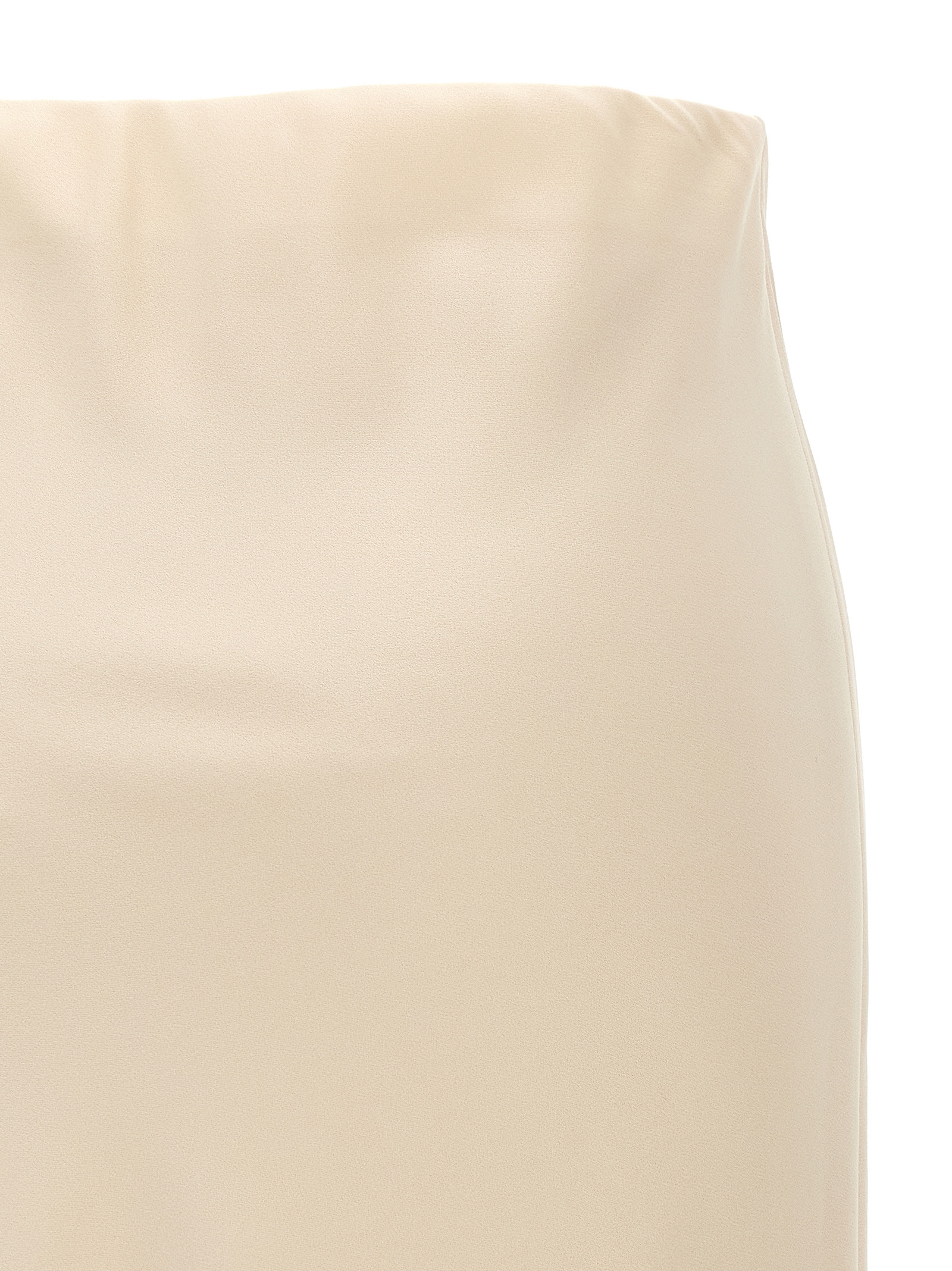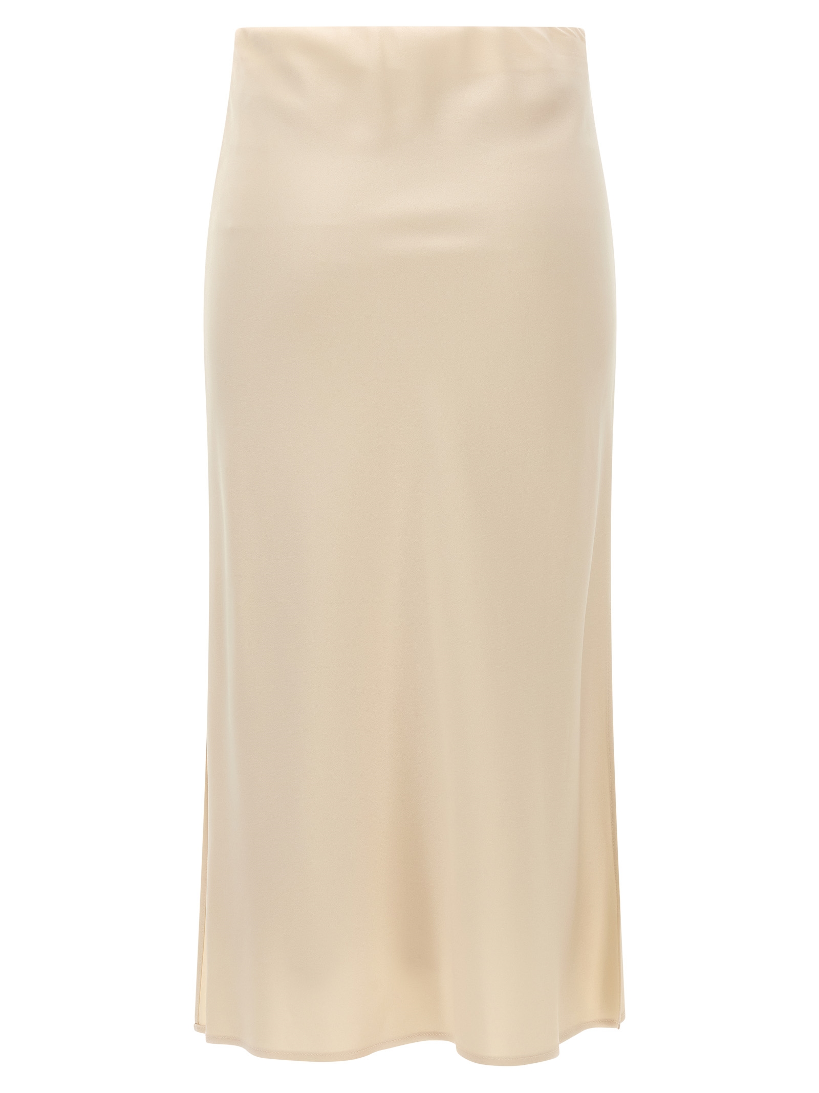 'Pencil Fluid' midi skirt in cady satin, pull-up model, elastic waistband, side slits, silk blend crepe lining.