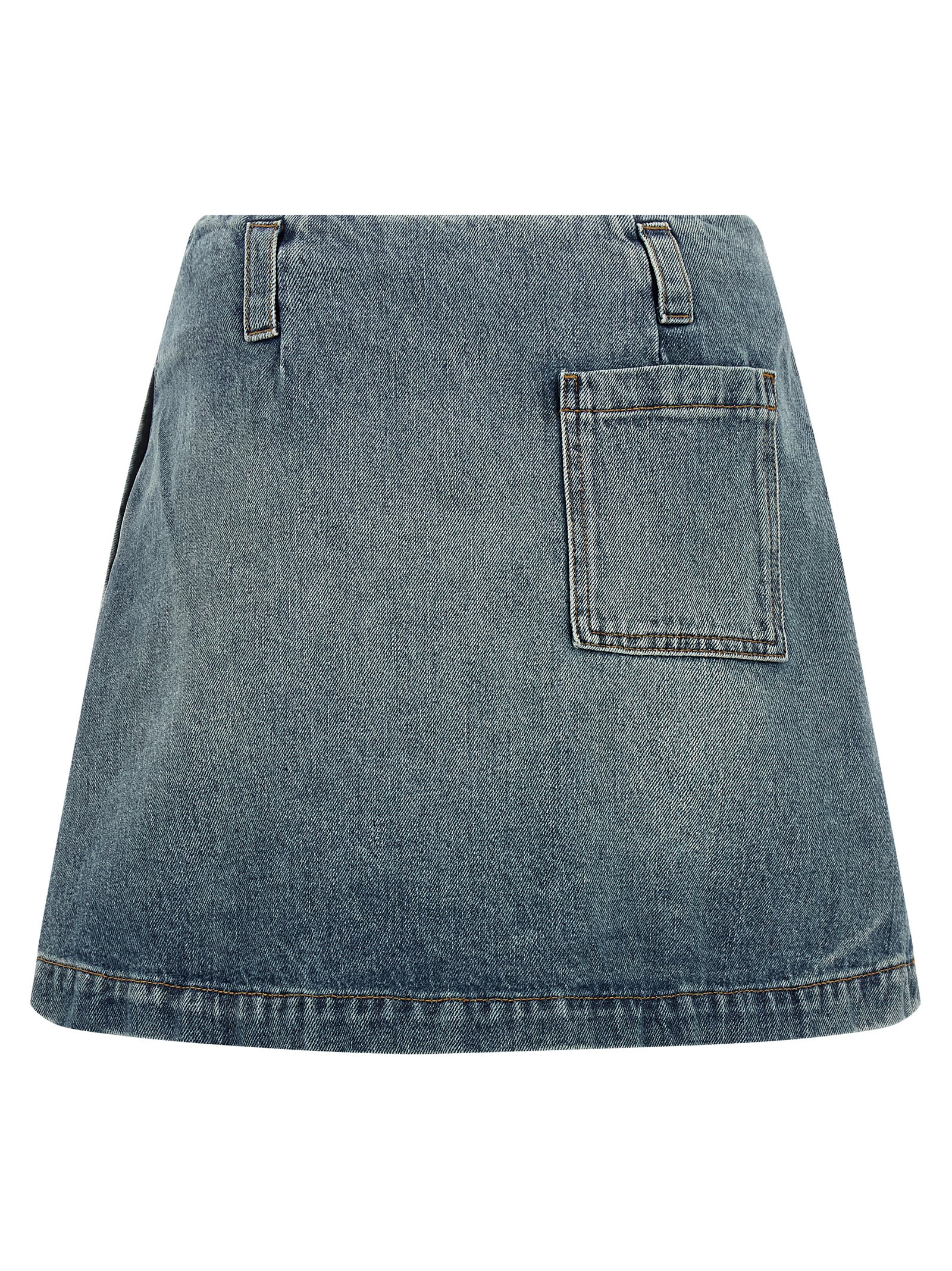 Mini skirt in washed cotton denim of medium weight, medium waist, pleats and front leather logo tag, pockets, side zip closure.