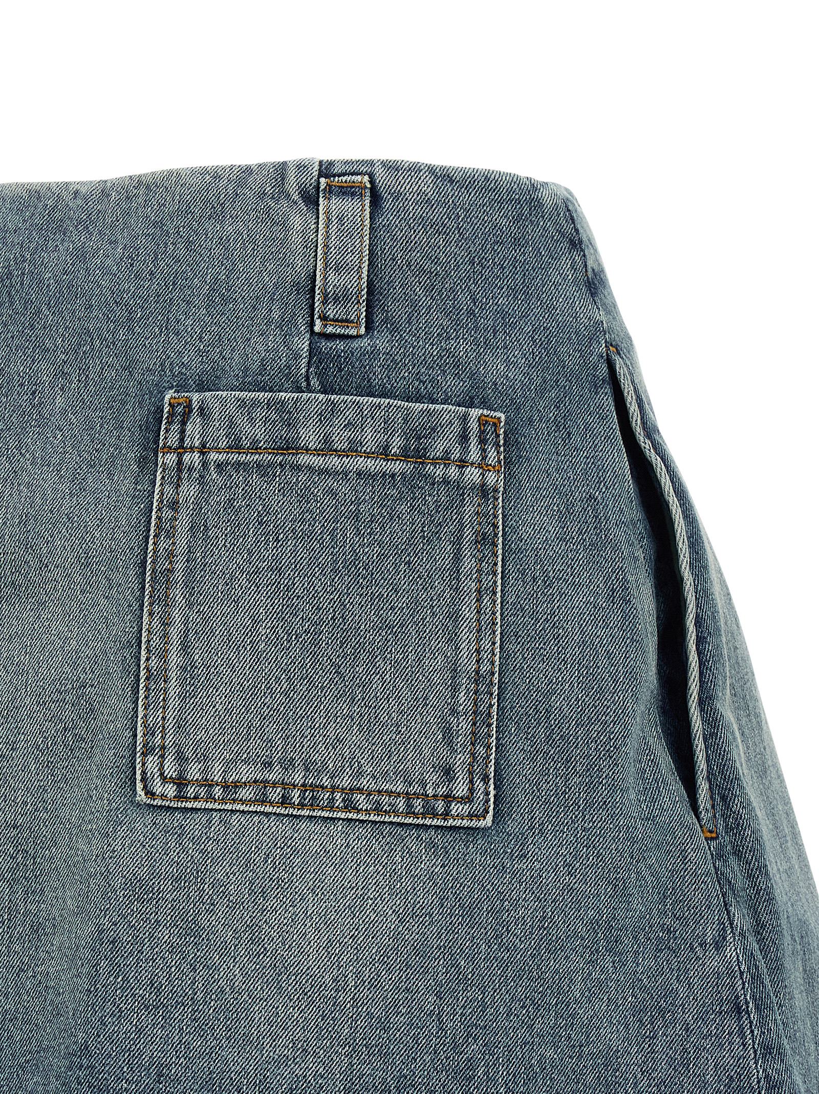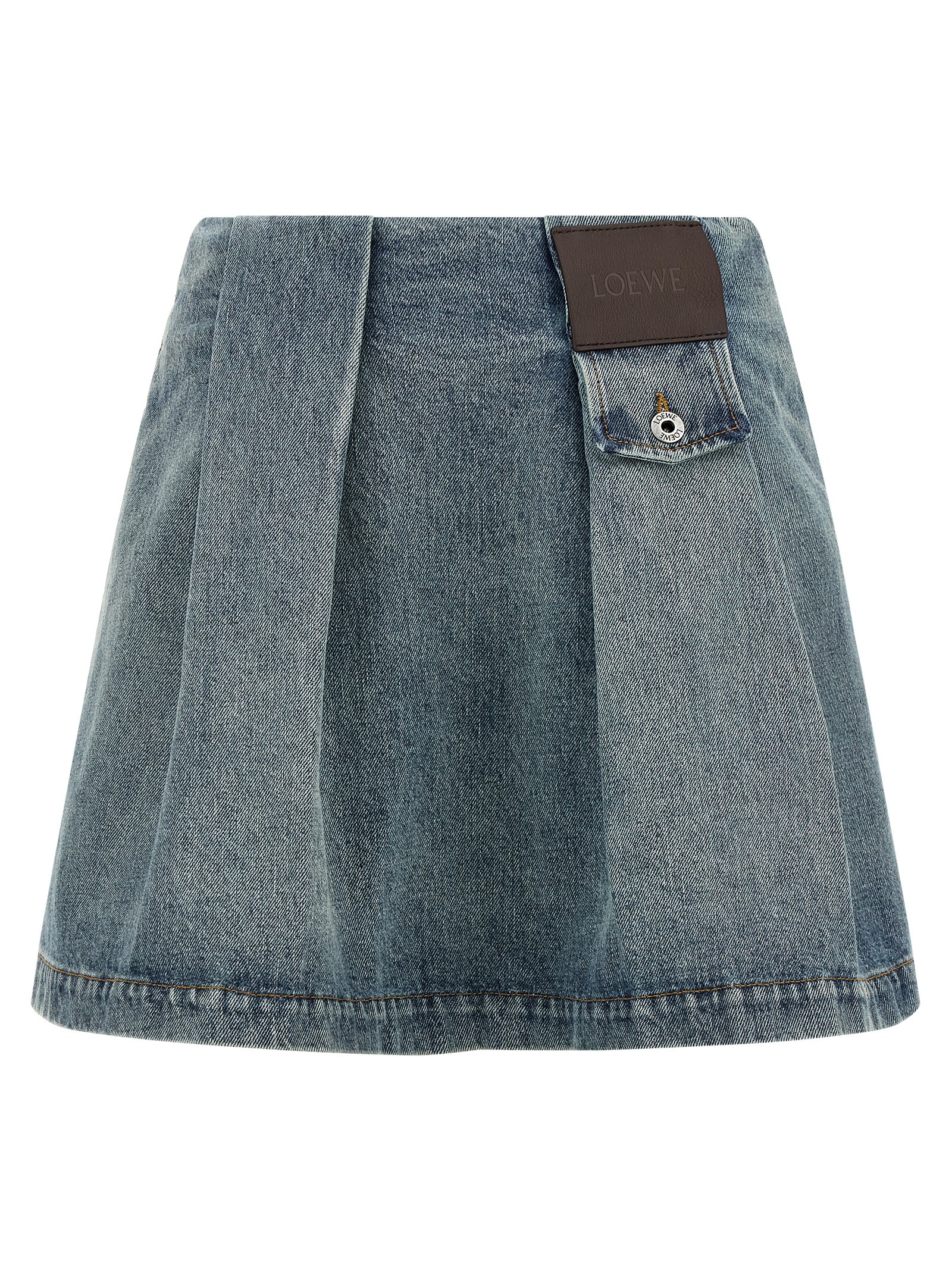 Mini skirt in washed cotton denim of medium weight, medium waist, pleats and front leather logo tag, pockets, side zip closure.