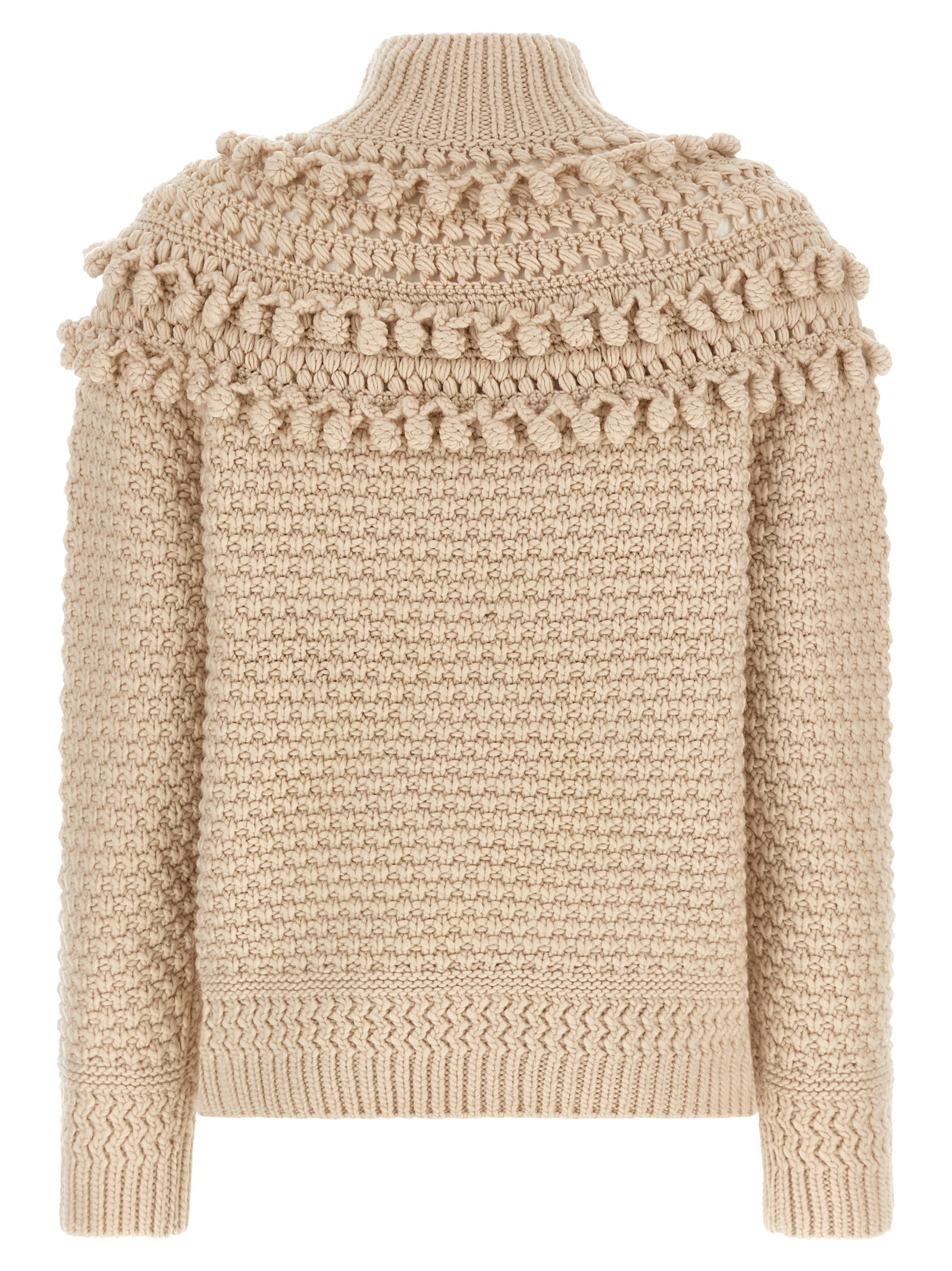 'Hypnotic Bauble' knitted wool sweater with pompom, high neck, long sleeves with cuffs and dropped shoulders.