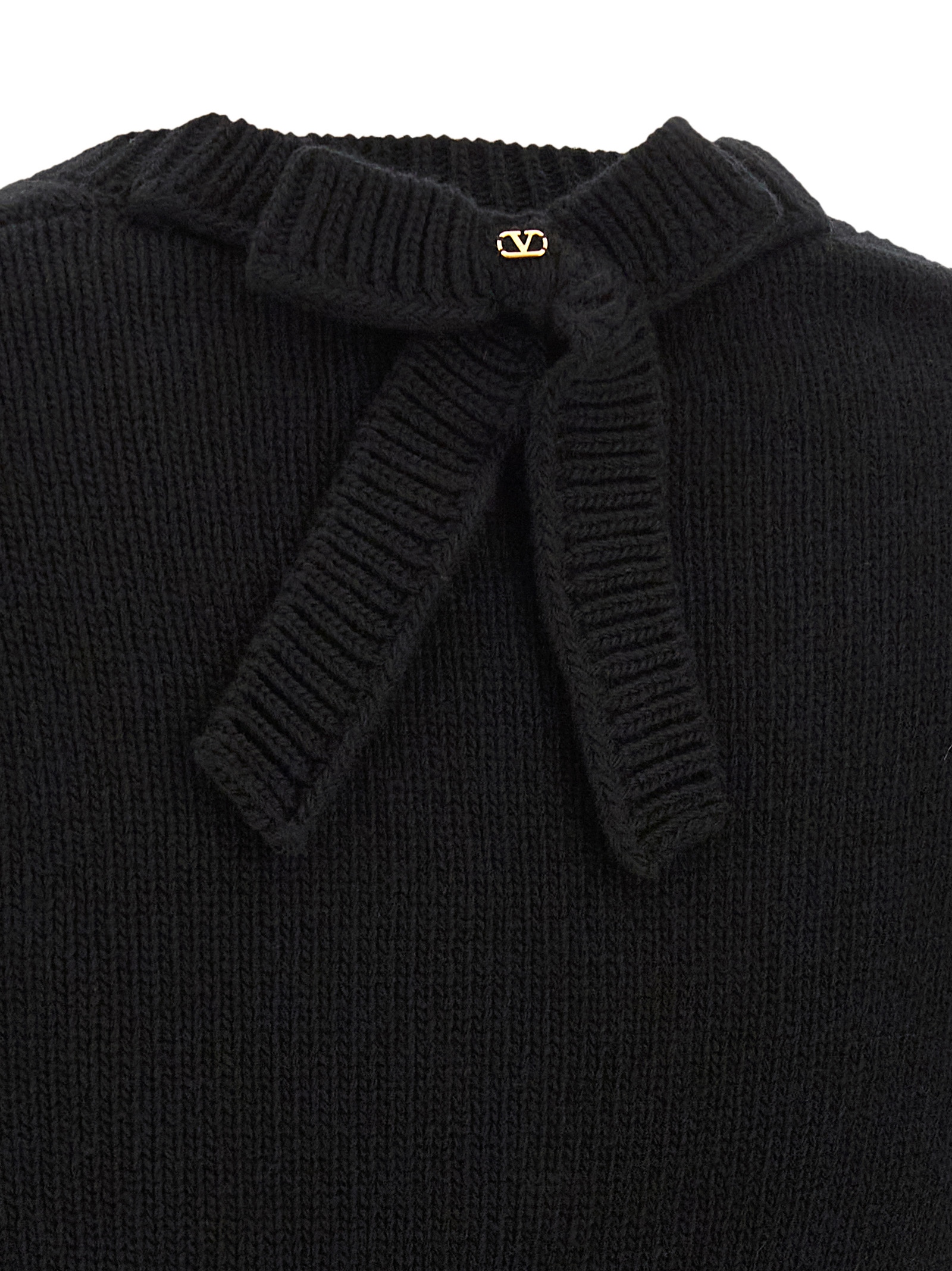 Virgin wool sweater with VLogo Signature contrast intarsia, V-neck, bow detail with VLogo Signature metallic on the back, long cuffed sleeves.