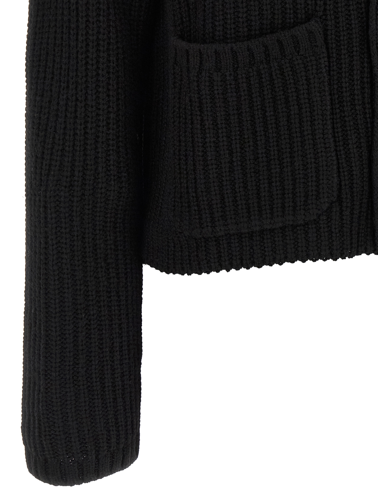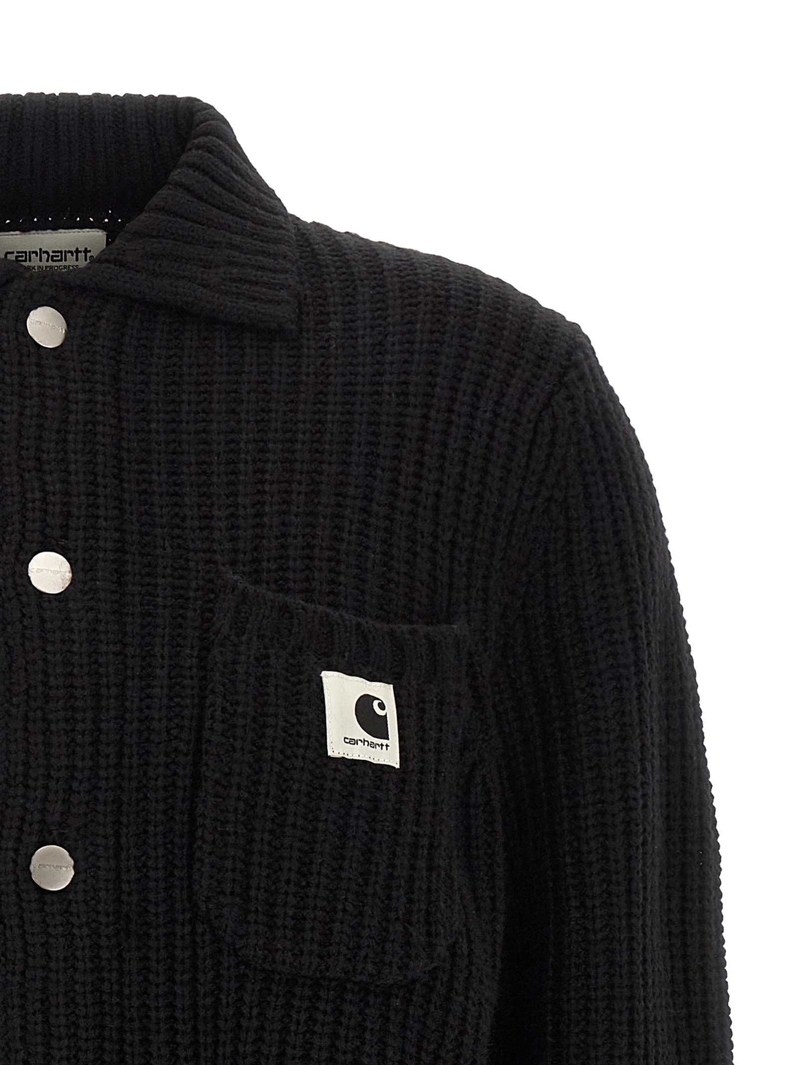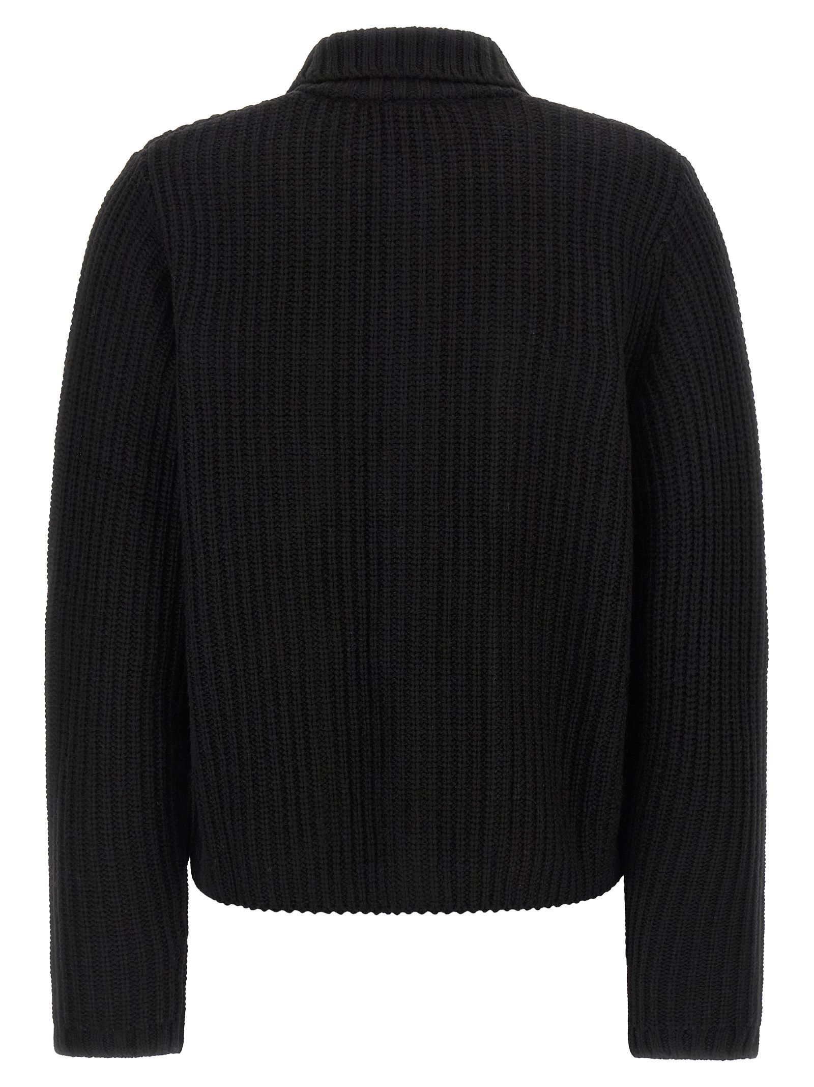 'Michigan Sweater' thick-weave ribbed wool blend cardigan, collar, snap buttons, front pockets, front logo patch, long cuffed sleeves.