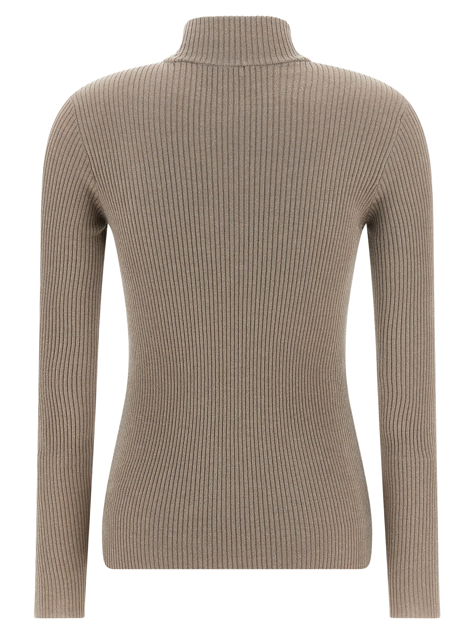Sparkling ribbed lightweight stretch cashmere knit turtleneck sweater with half zip with Monile detail, high neck, long sleeves.