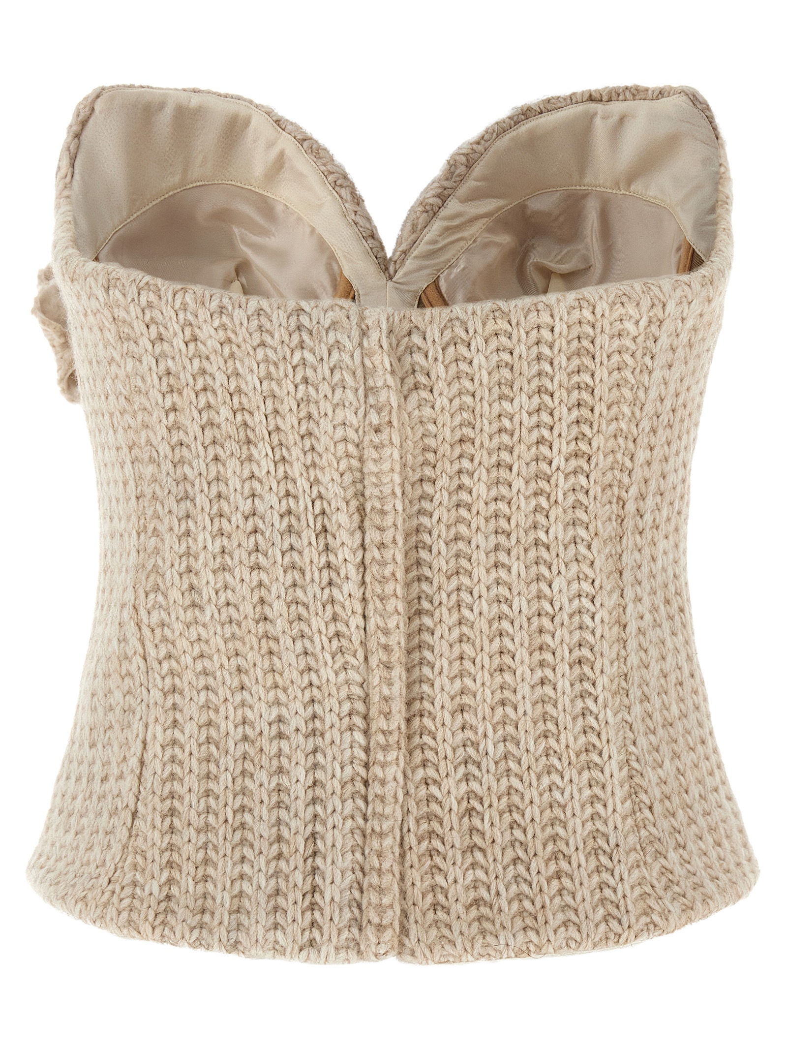 Viscose, wool and tricot alpaca blend top, off-the-shoulder bustier style with preformed cups and inner splints, removable matching brooch, sweetheart neckline, sleeveless, back zip closure.