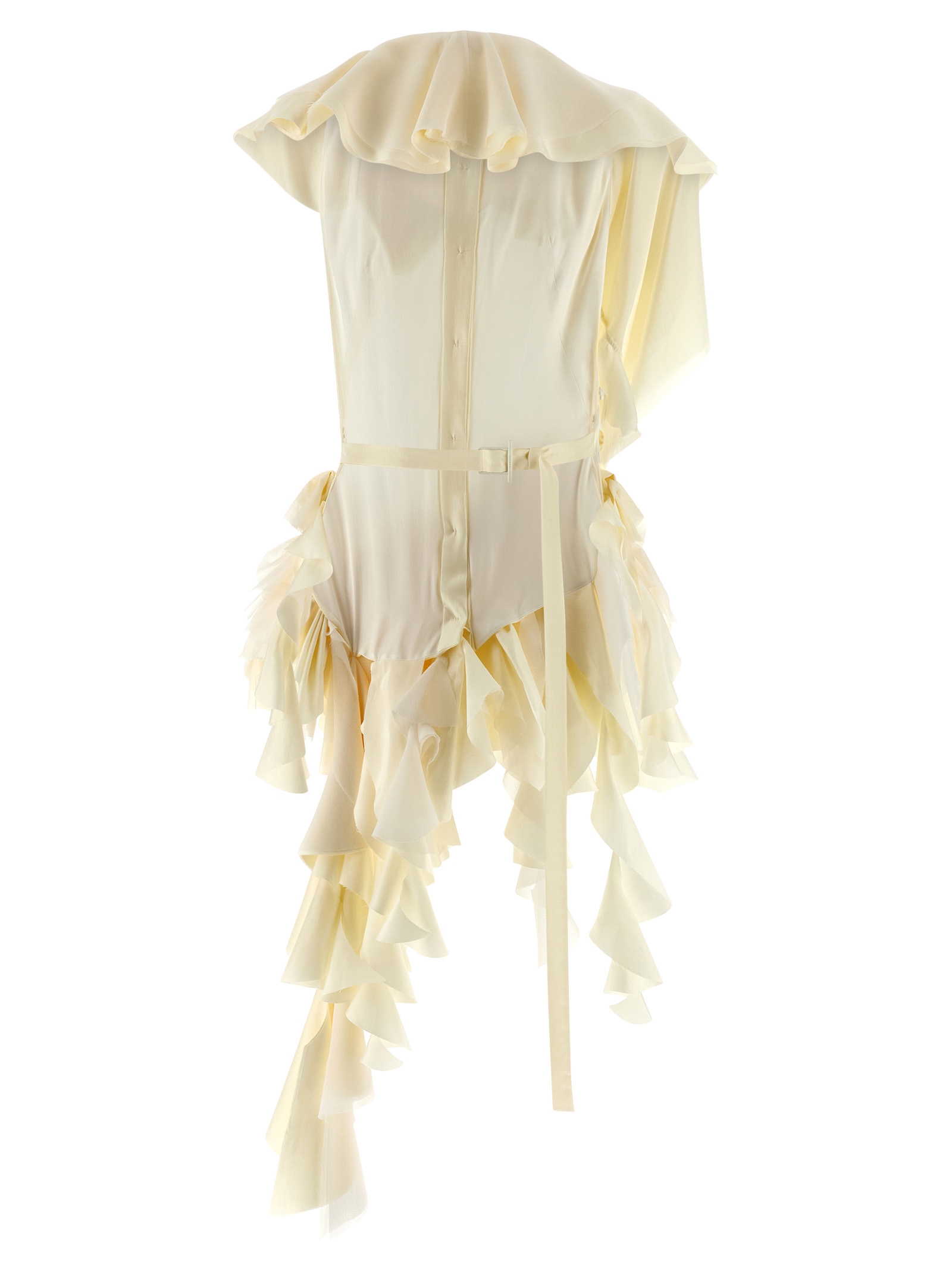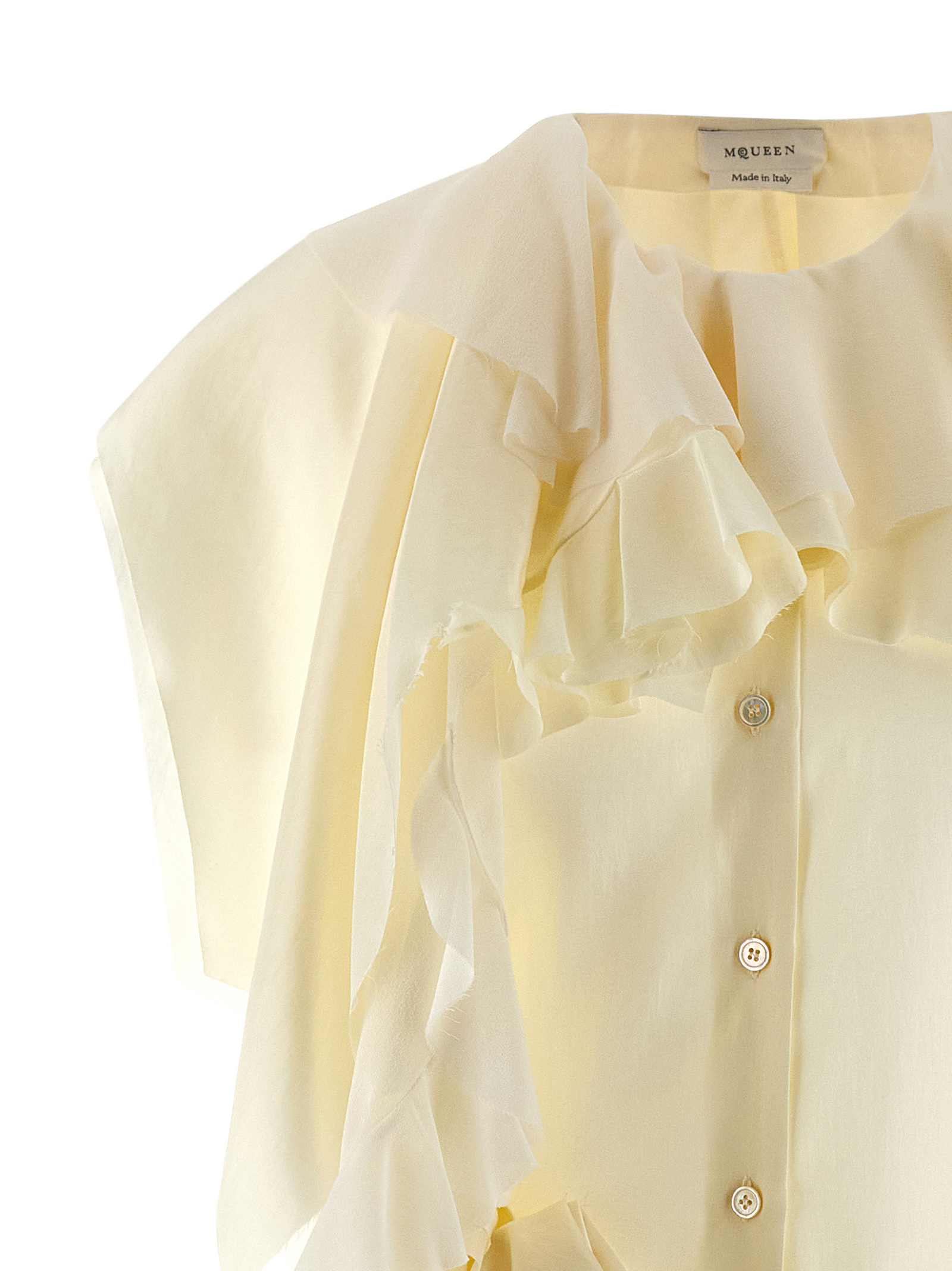 'Oyster' silk georgette top with ruffles, crew neck with bare back with strap detail with adjustable buckle, front button closure.
