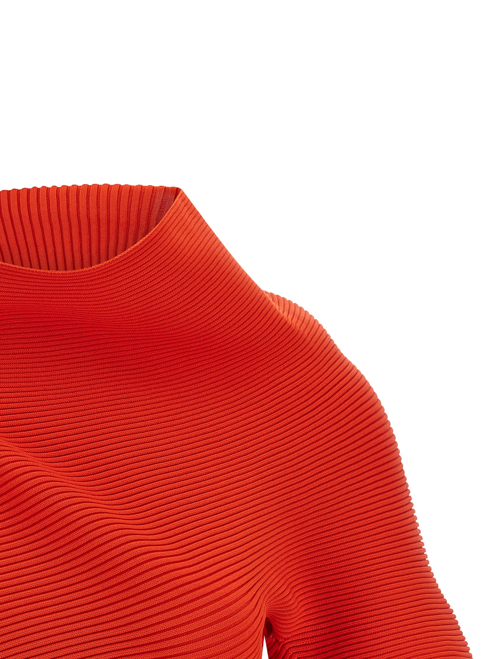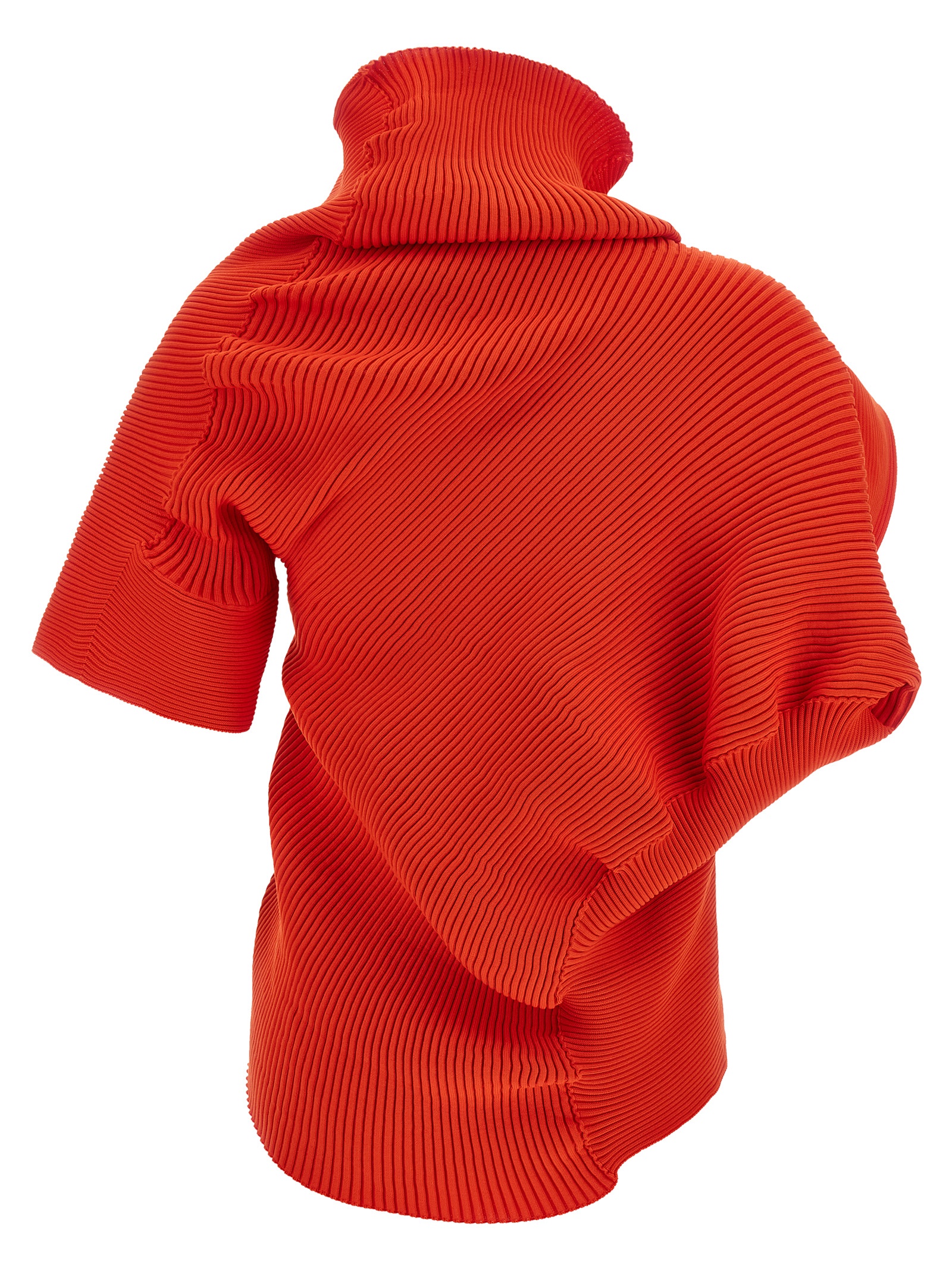 'Life form' stretch knit top with ribbed pattern, tubular shapes, asymmetric, wide high neck and beveled short sleeves.