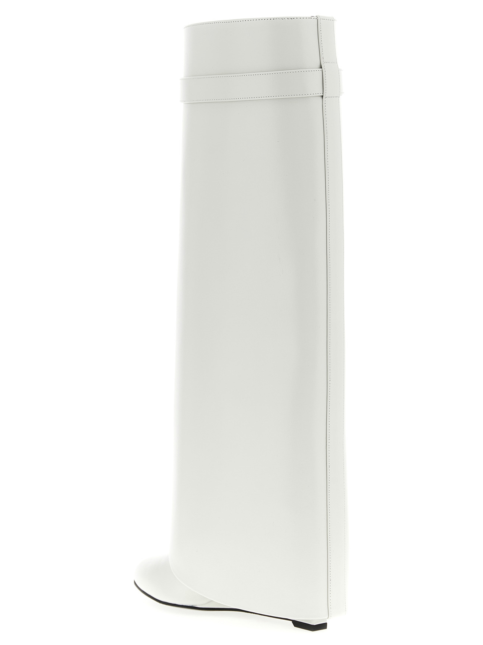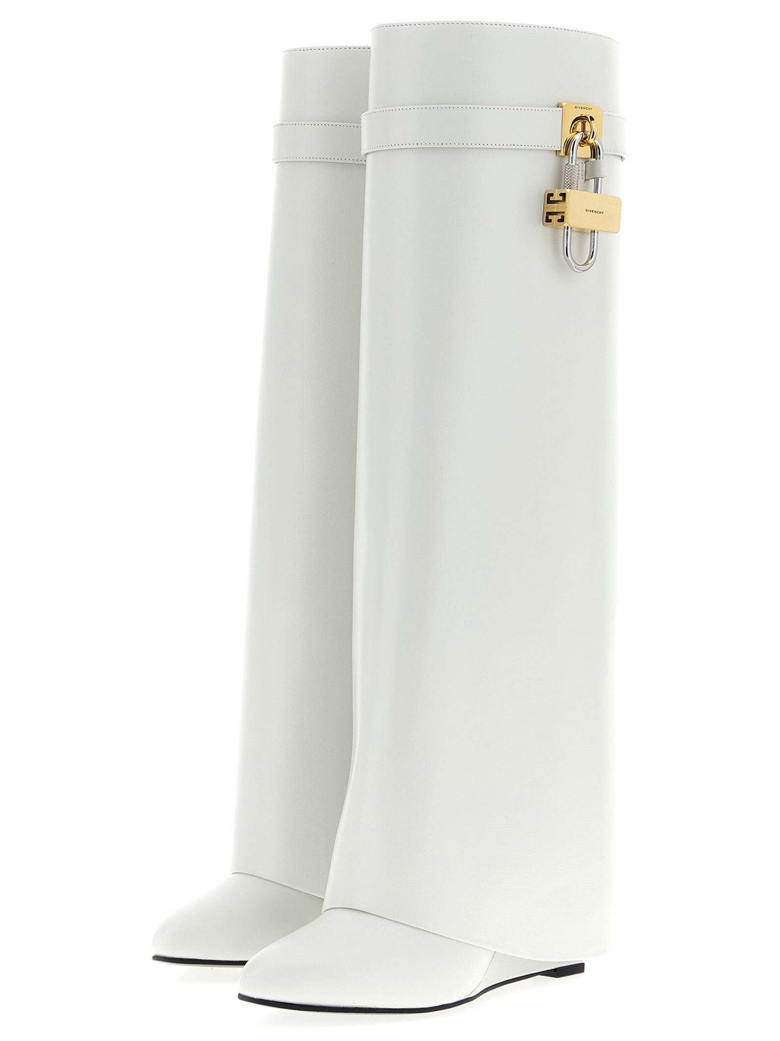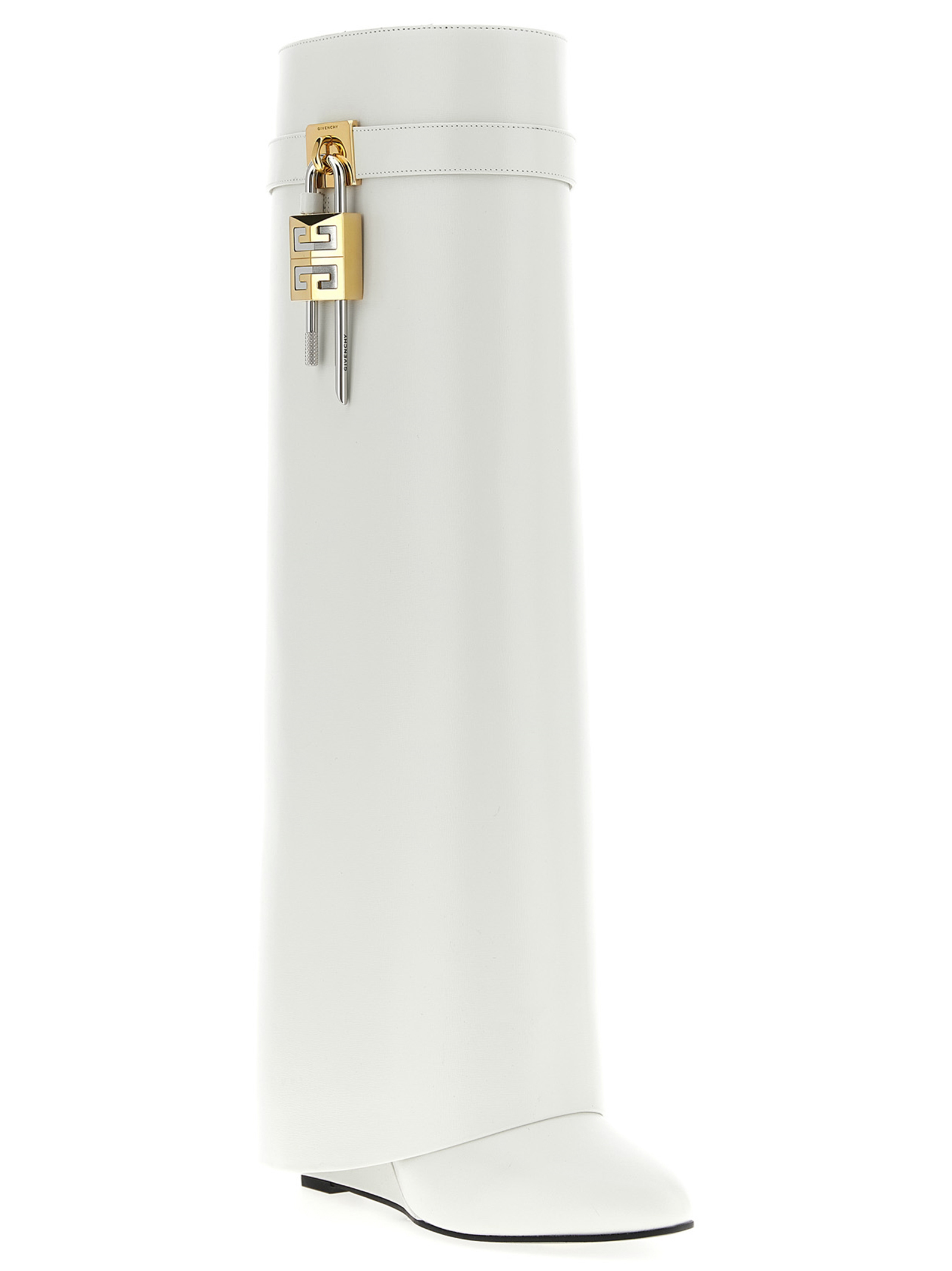 Shark Lock' leather tube boots with rounded toe, leather band with GIVENCHY metal closure, silver finish 4G Lock padlock on the right side and GIVENCHY gold and silver metal padlock on the left side, covered wedge heel, leather sole.