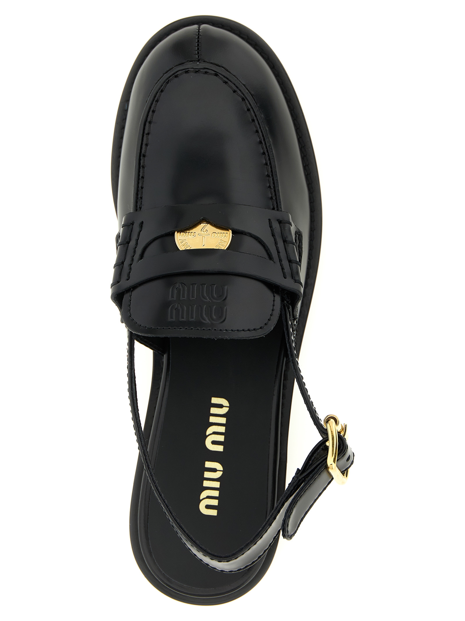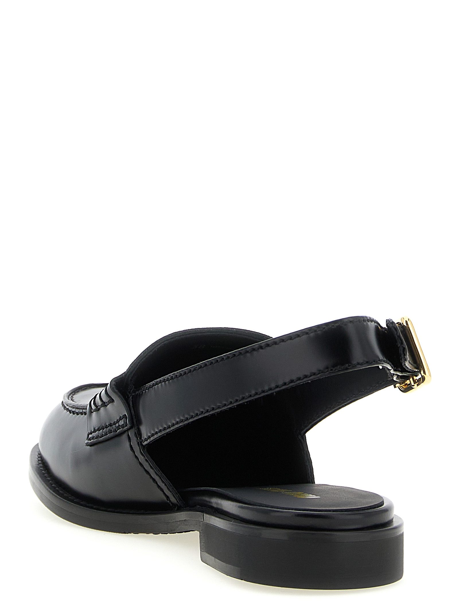 'Penny Loafers' leather mules with metal penny detail and embossed logo on the front, adjustable strap, rubber sole.