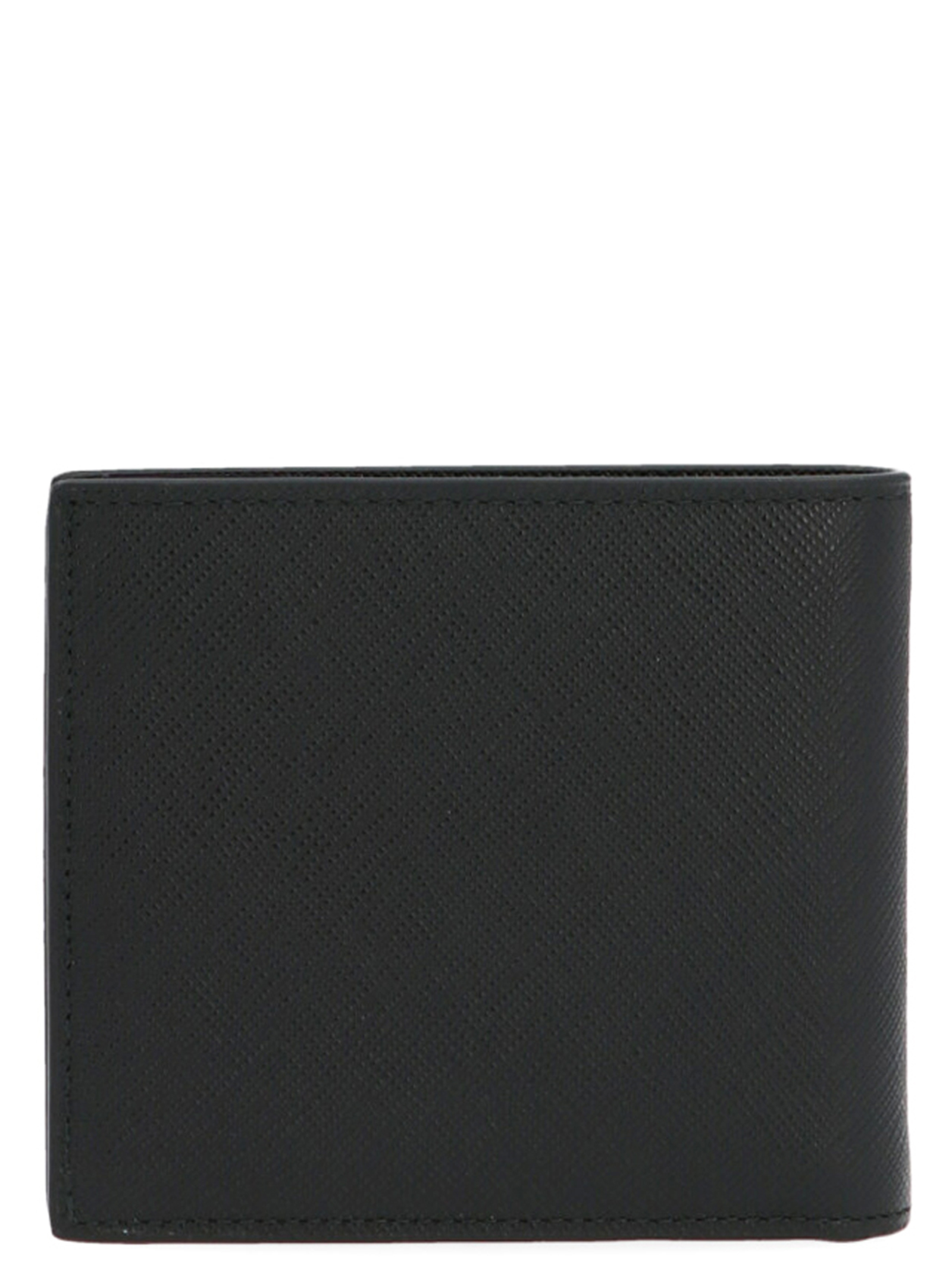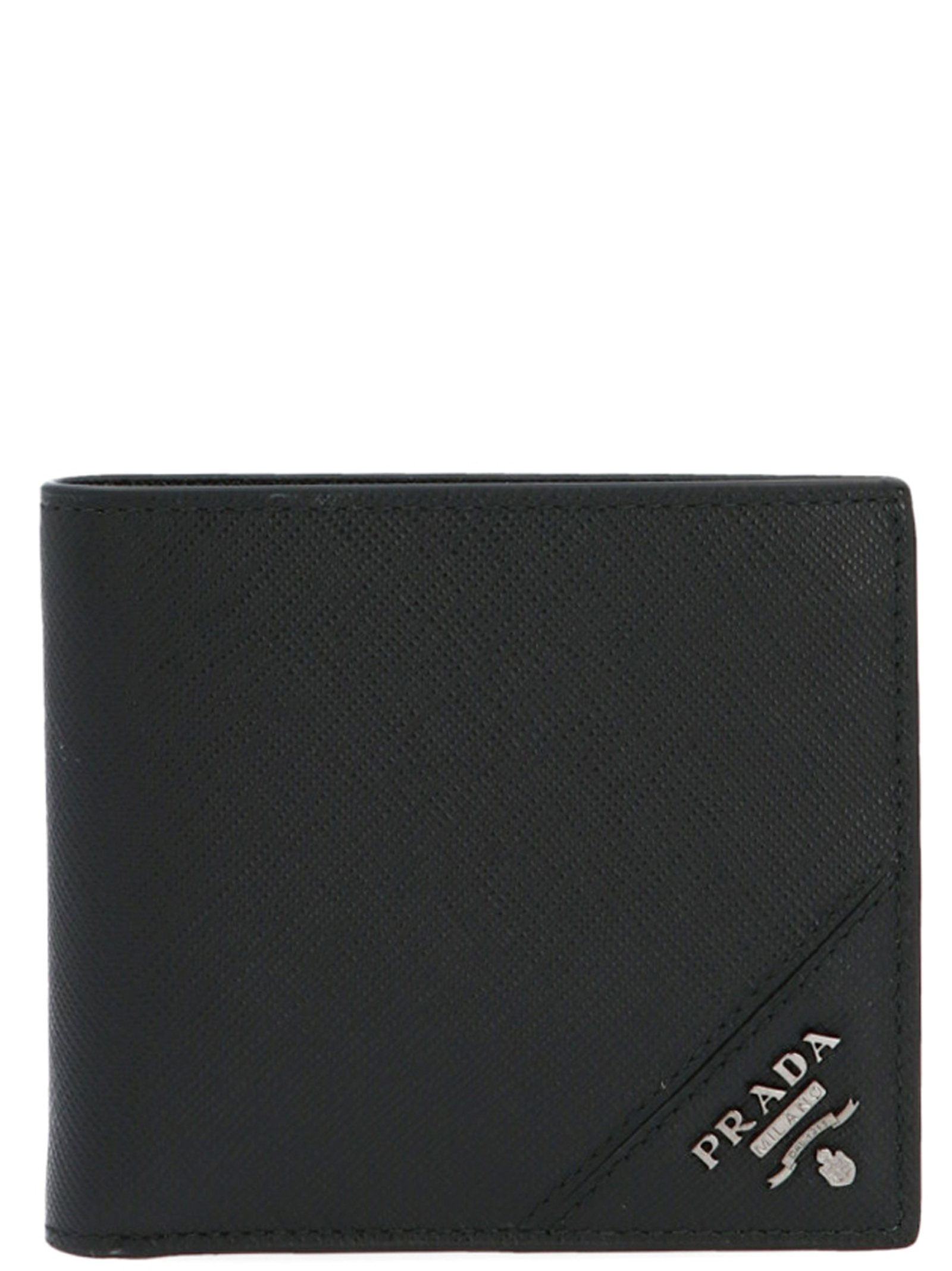 Prada saffiano leather wallet with cartouche metal logo lettering.