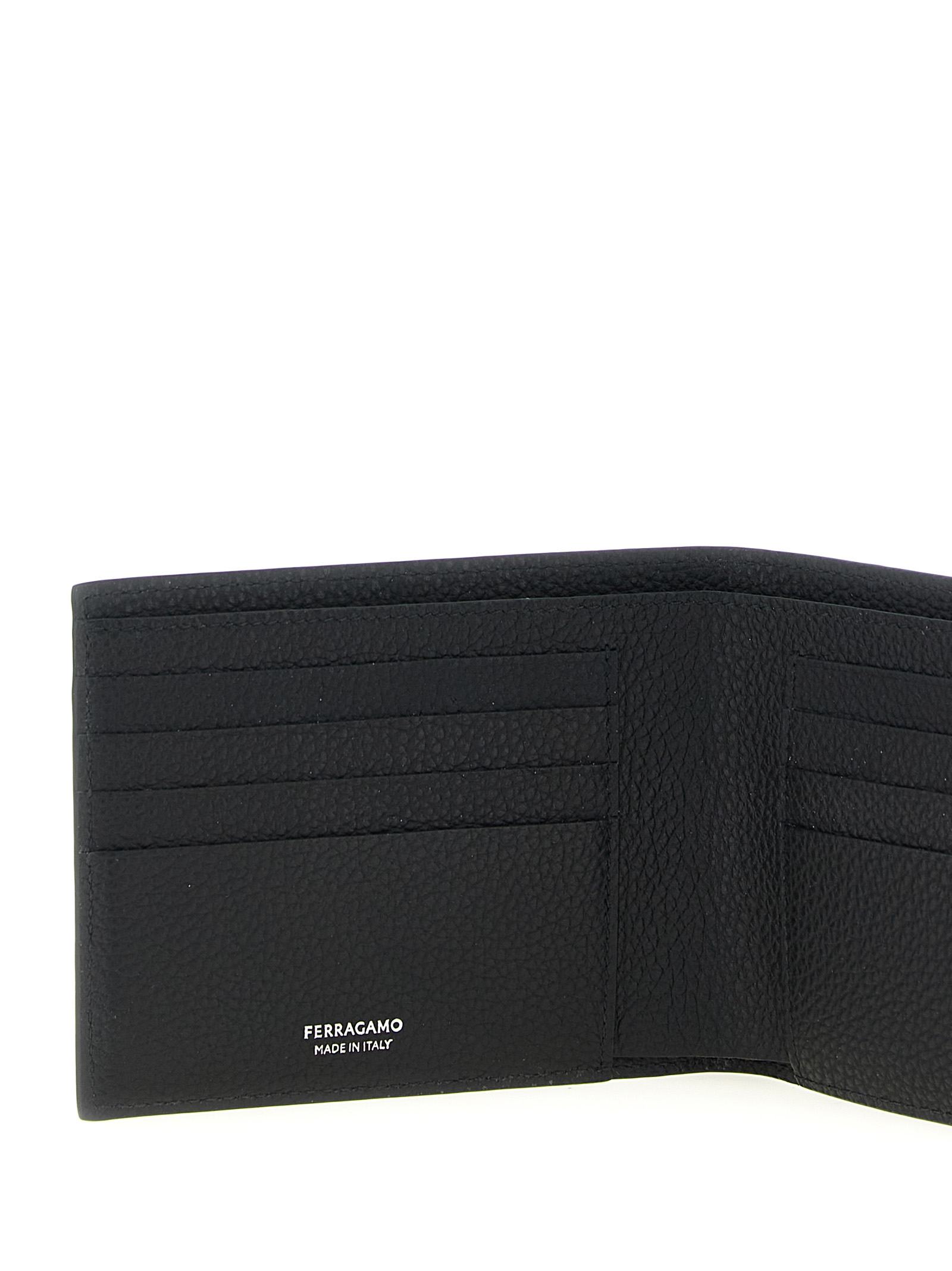 Hammered calf leather wallet with embossed embossed 'Gancini' pattern, metal 'Gancini' logo on the front, and a book opening.