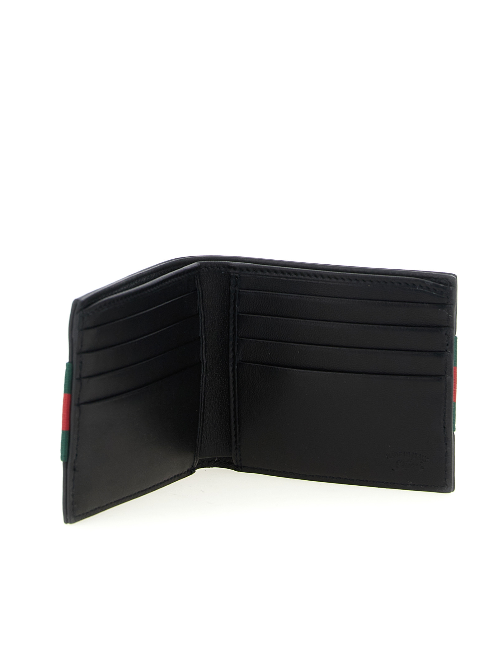 'Web Trademark' leather wallet with grosgrain 'Nastro Web', bi-fold model, book opening.