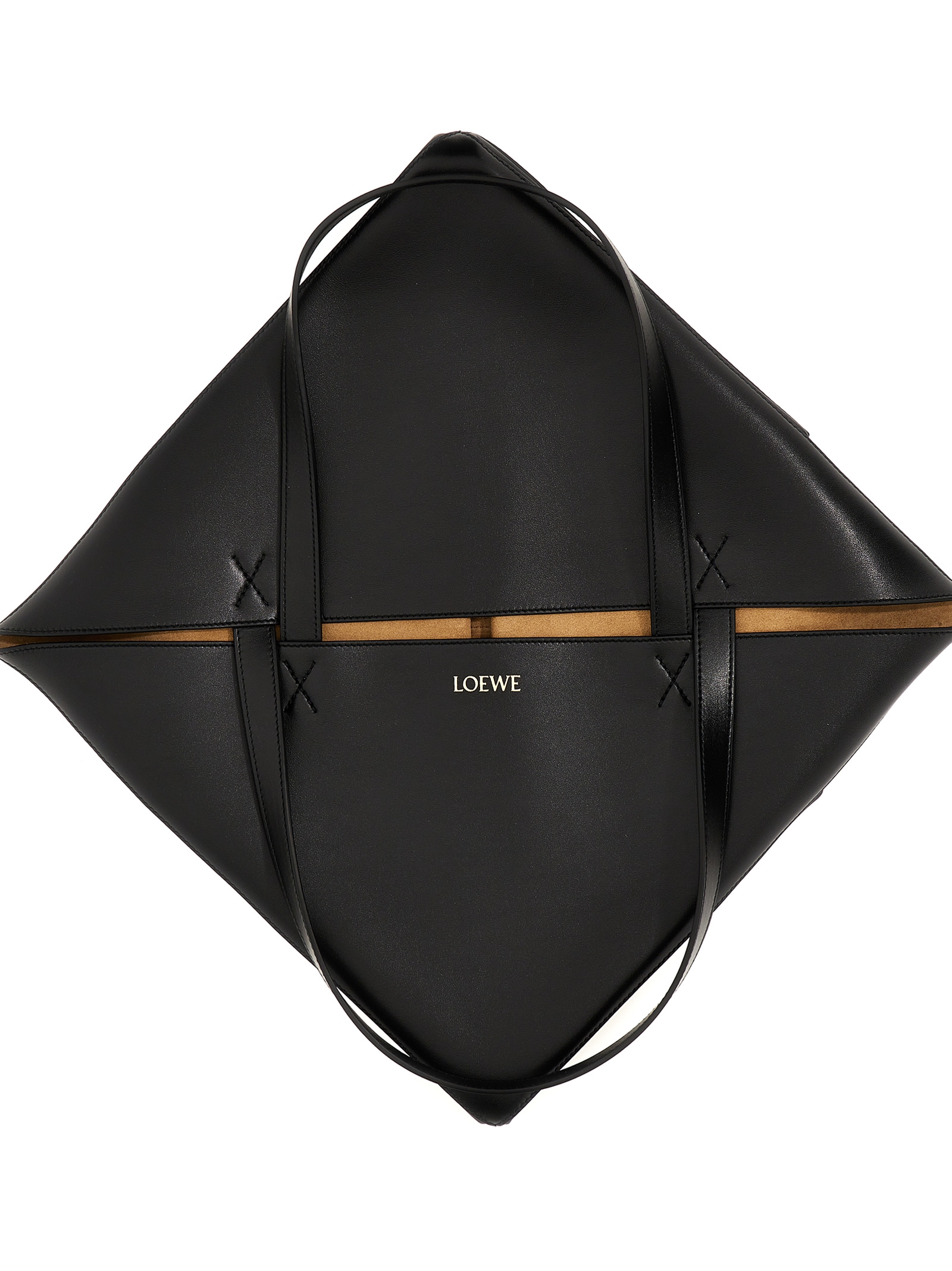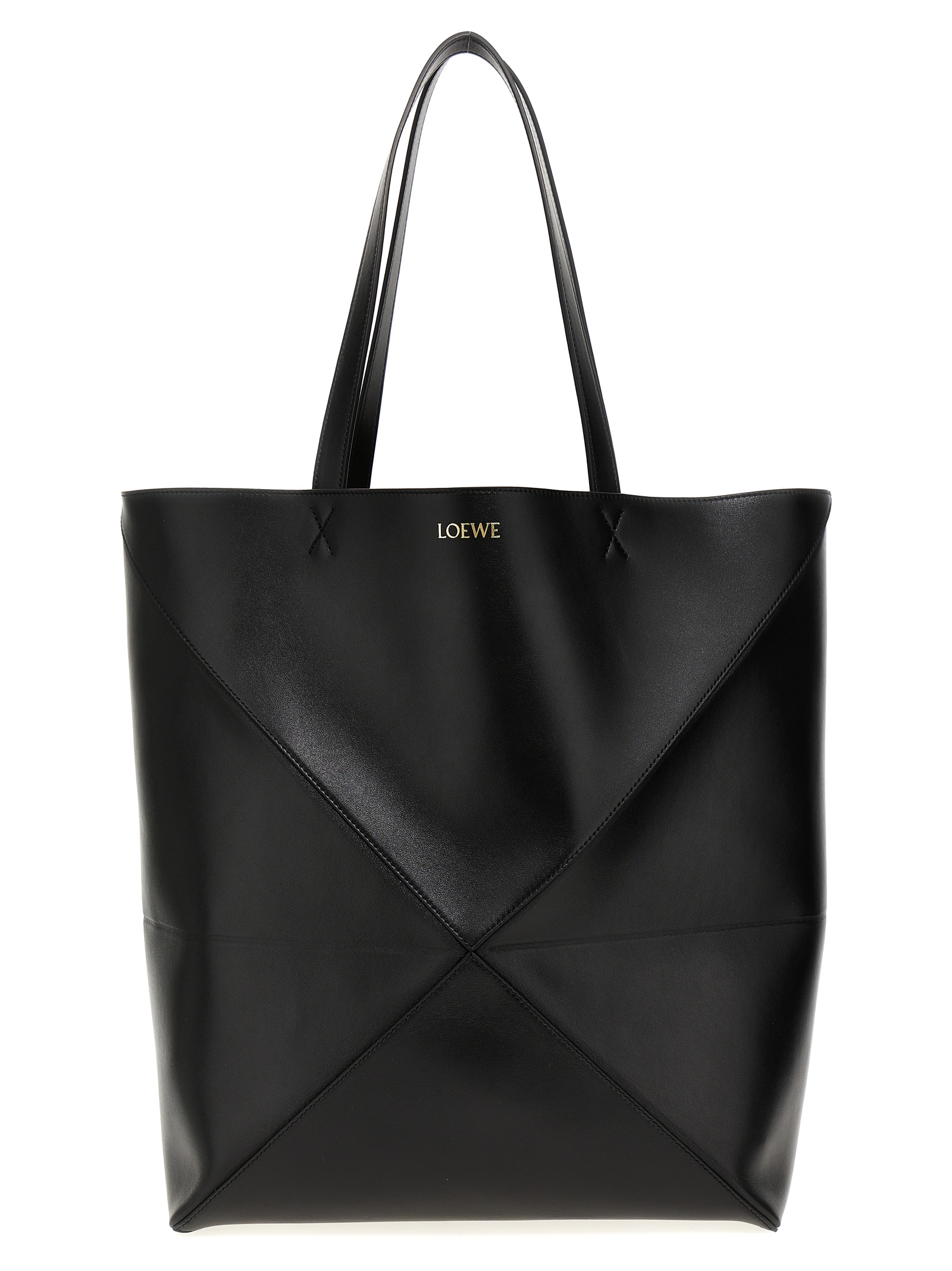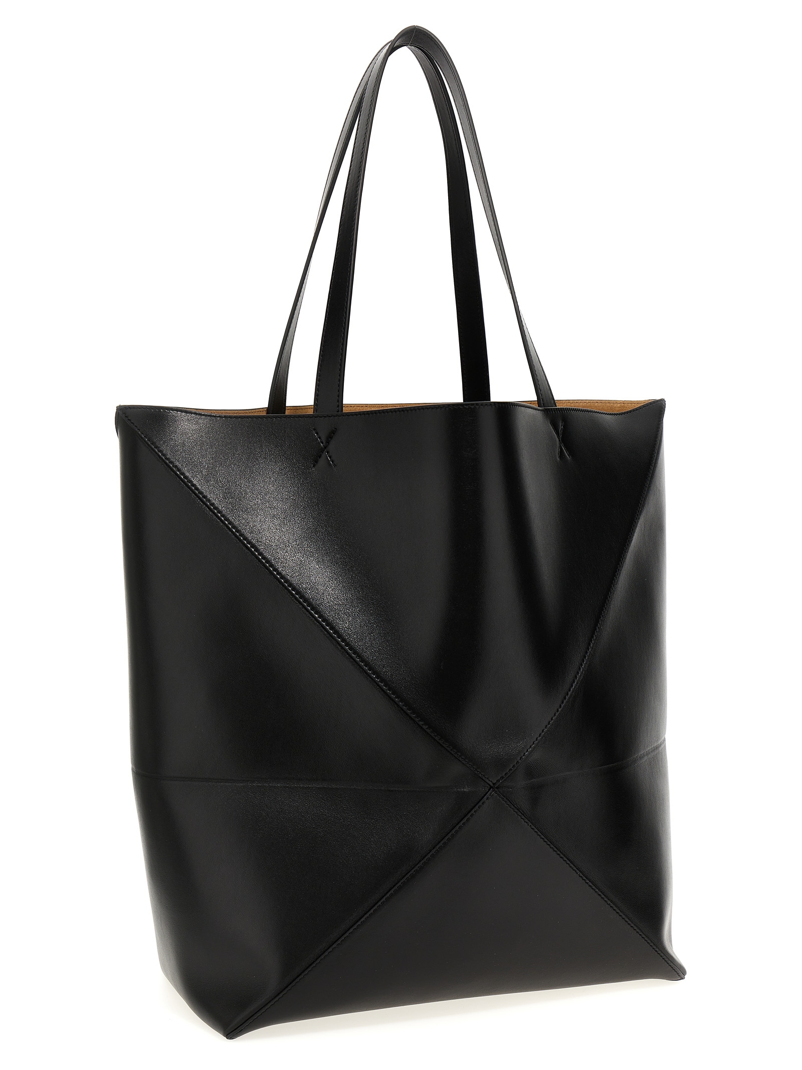 Сумка для покупок «Puzzle Fold Tote XL» из блестящей телячьей кожи с геометрической строчкой, двойными фиксированными ручками, тисненым логотипом на передней части, замшевой подкладкой, складывается пополам.