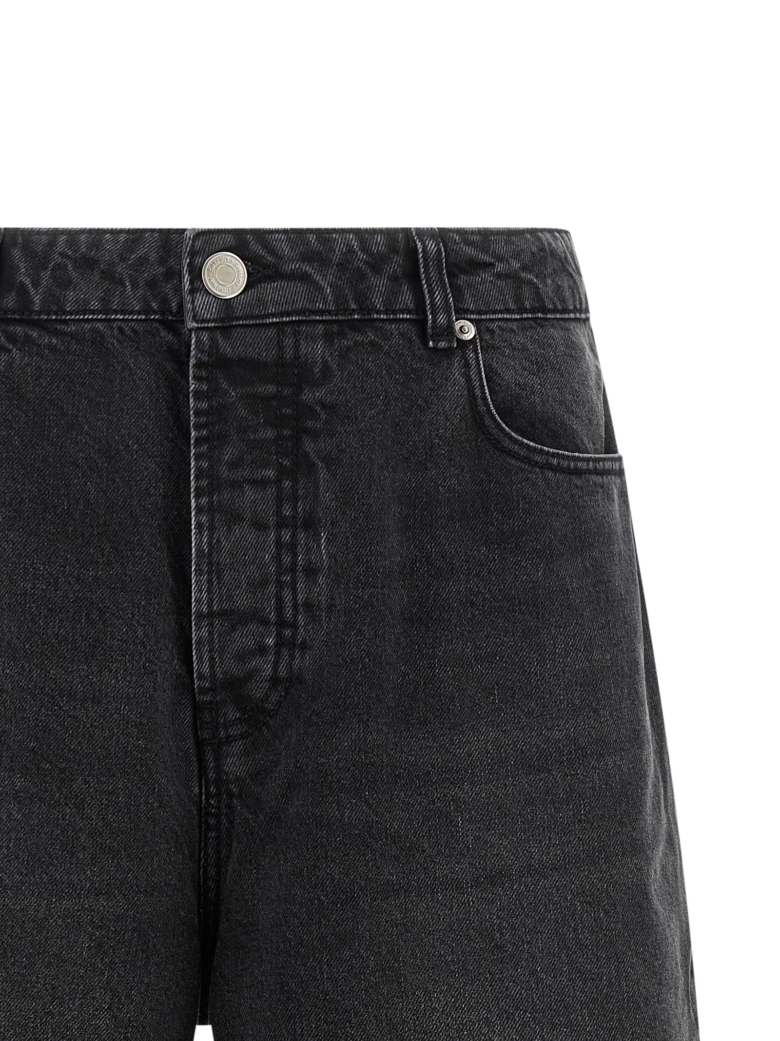 Garment-dyed cotton denim bermuda shorts with flared wide leg, front button closure, five pockets, and leather logo label at the back.