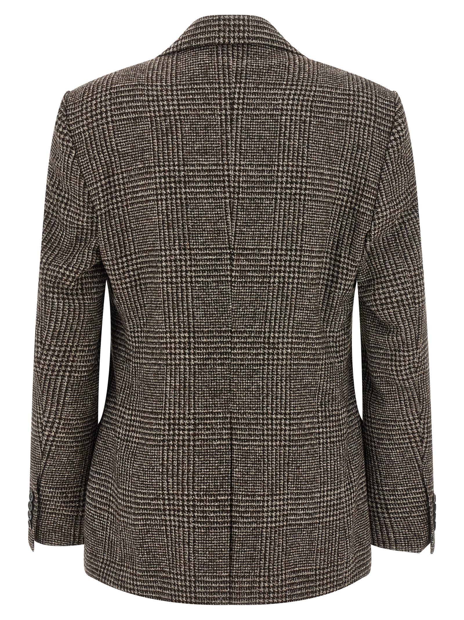 Однобортный блейзер из альпаки, шерсти и хлопка с узором «Принц Уэльский», застежкой на пуговицах спереди, обратным лацканом, нагрудным карманом, карманами с клапанами, структурированными плечевыми лямками, манжетами с открытыми петлями, разрезом сзади, шелковой подкладкой.