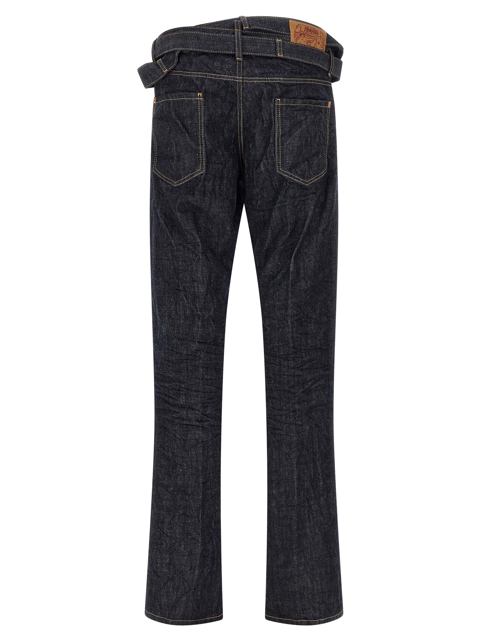 Джинсы Magliano x Dsquared2 из окрашенного в массе хлопкового денима с эффектом морщин, контрастной отстрочкой, прямыми брючинами, застежкой на пуговицах спереди с ремешком, который продевается через пояс, пятью карманами и логотипом на задней части.