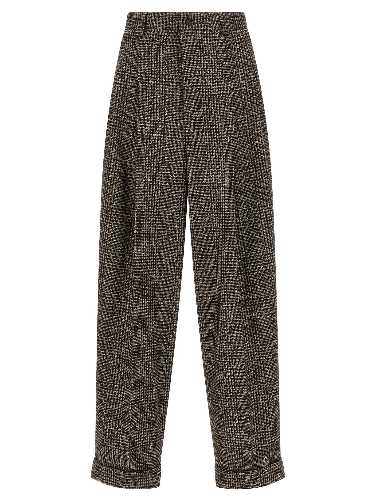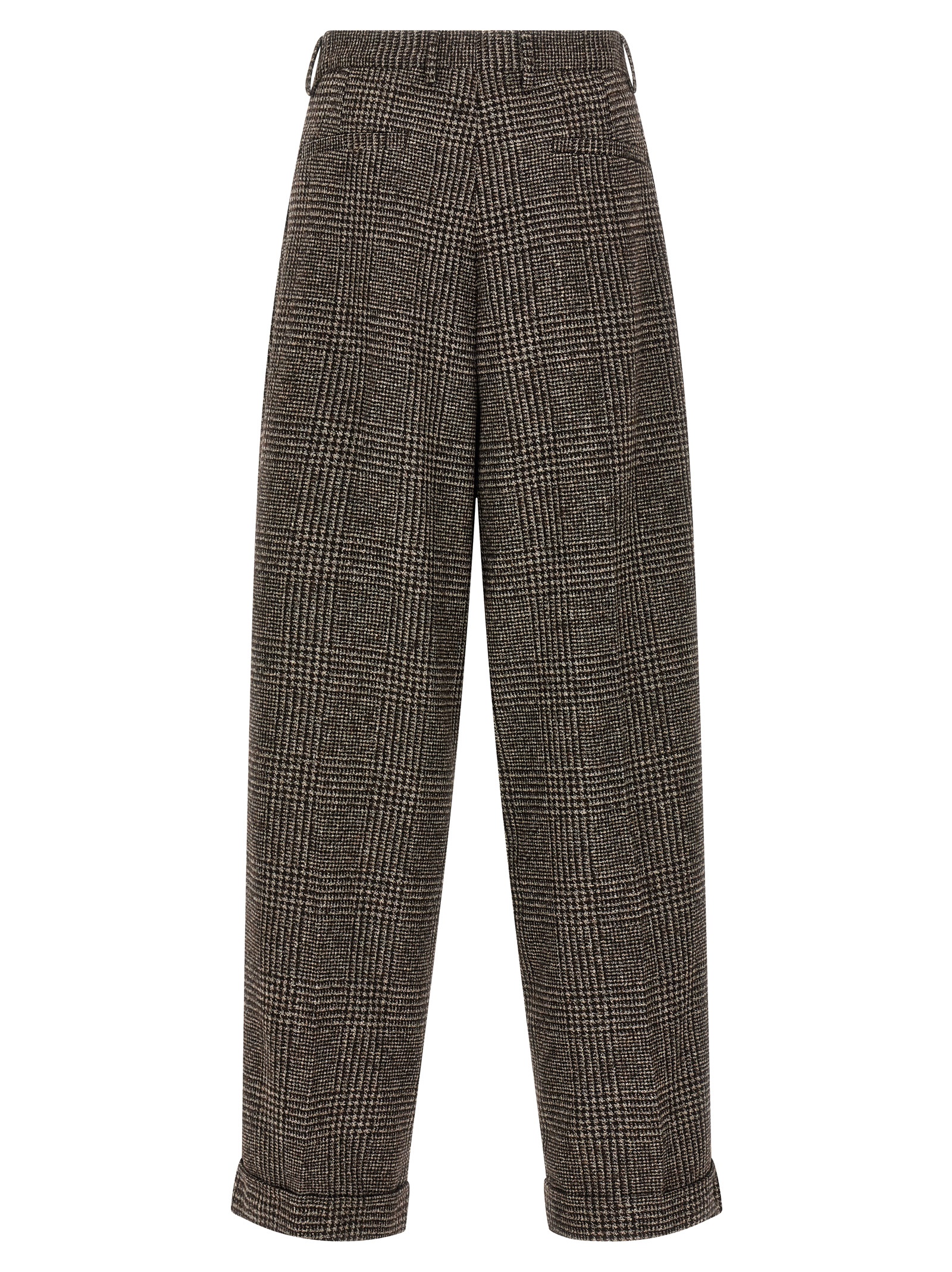 Брюки Prince of Wales из смеси альпаки, шерсти и хлопка, с складками, расширенными складками, застежкой на крючке и кнопке спереди, широкими и прямыми брючинами, карманами, отворотом на нижней части брючин.