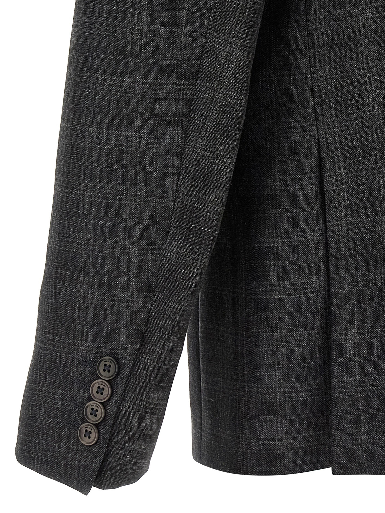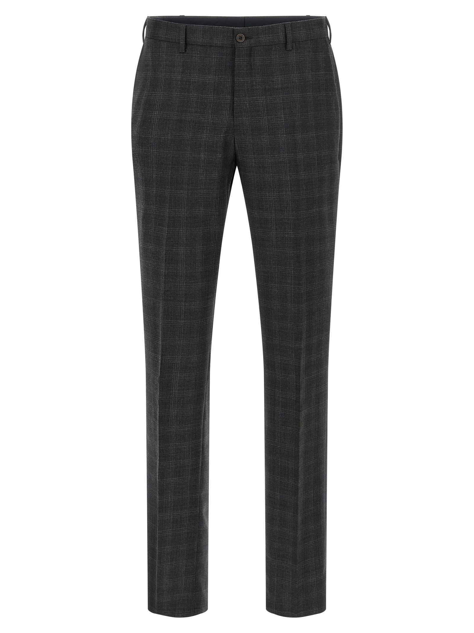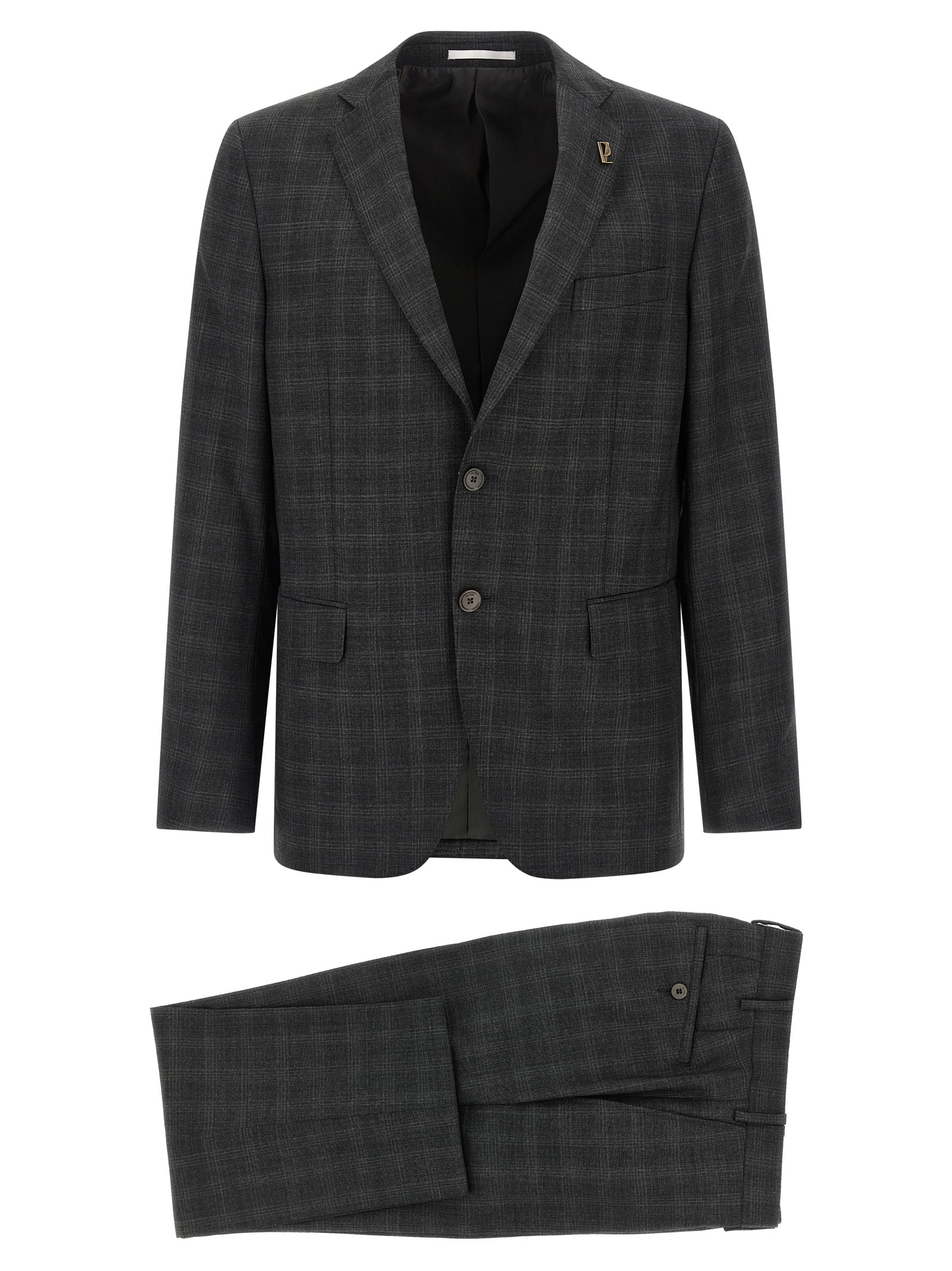 Шерстяное платье «Lord» с узором «Принц Уэльский», состоящее из однобортного блейзера с застежкой на пуговицах спереди, зеркальных лацканов со съемной металлической брошью, нагрудного кармана, карманов с клапанами, подкладки из купро, двух внутренних карманов, манжет с пуговицами, разрезов сзади и брюк с отутюженными складками, передних карманов «американе», задних карманов с отворотом, застежки на молнии и пуговицах спереди, вискозной подкладки.
