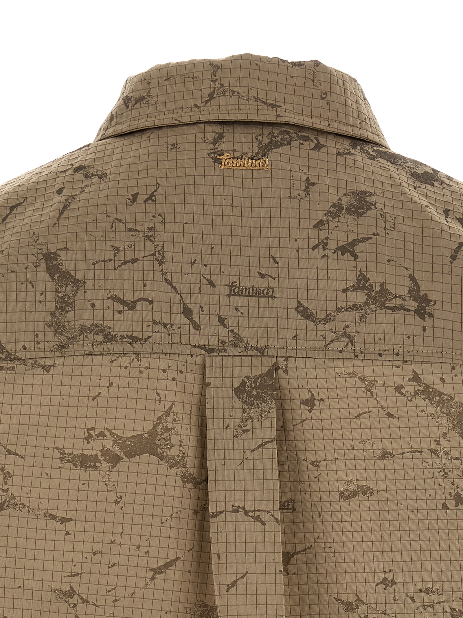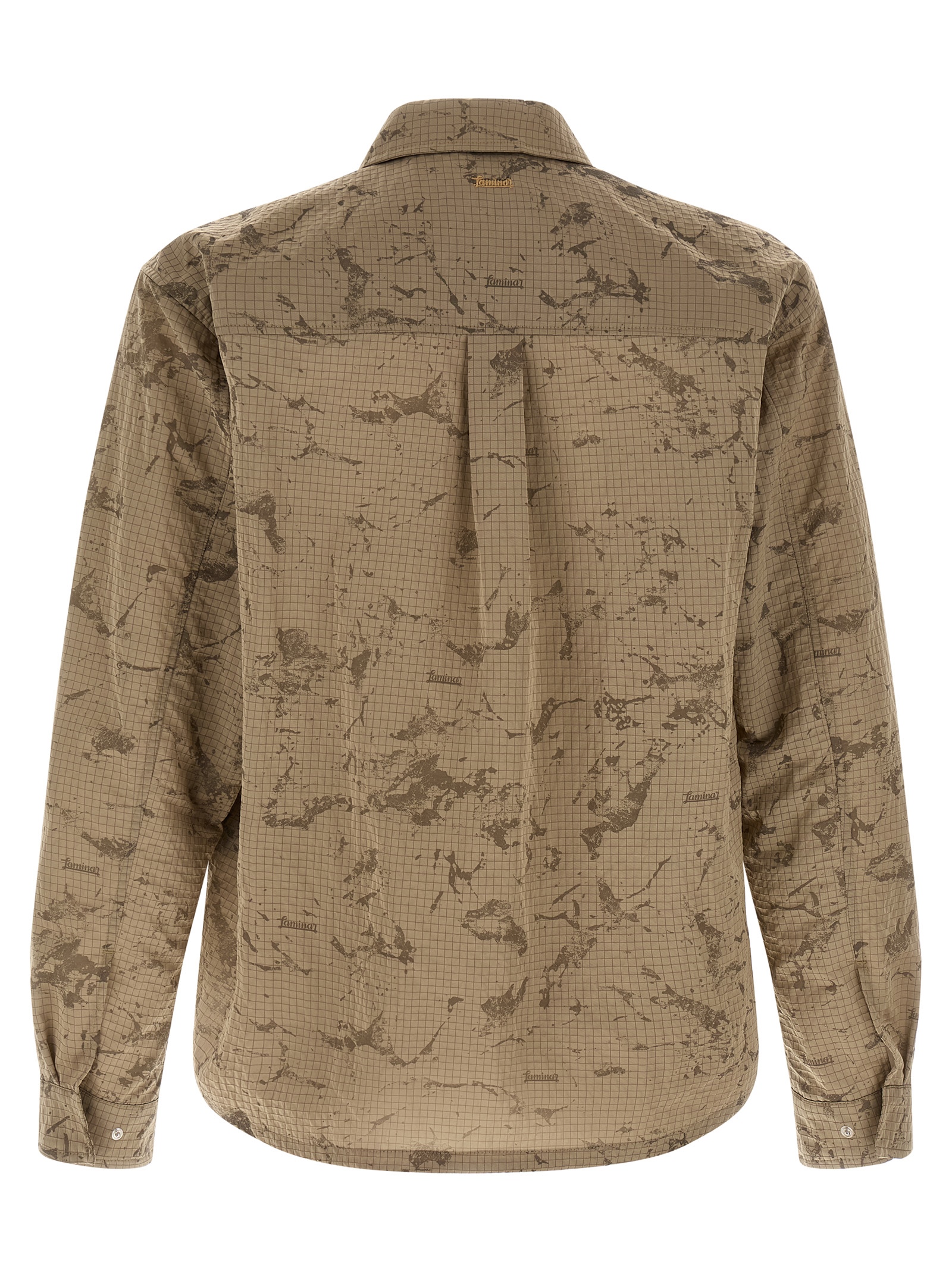 Camouflage patterned ripstop overshirt with logo print, pointed collar, front snap button closure, breast pocket, long cuffed sleeves, and asymmetric hem.
