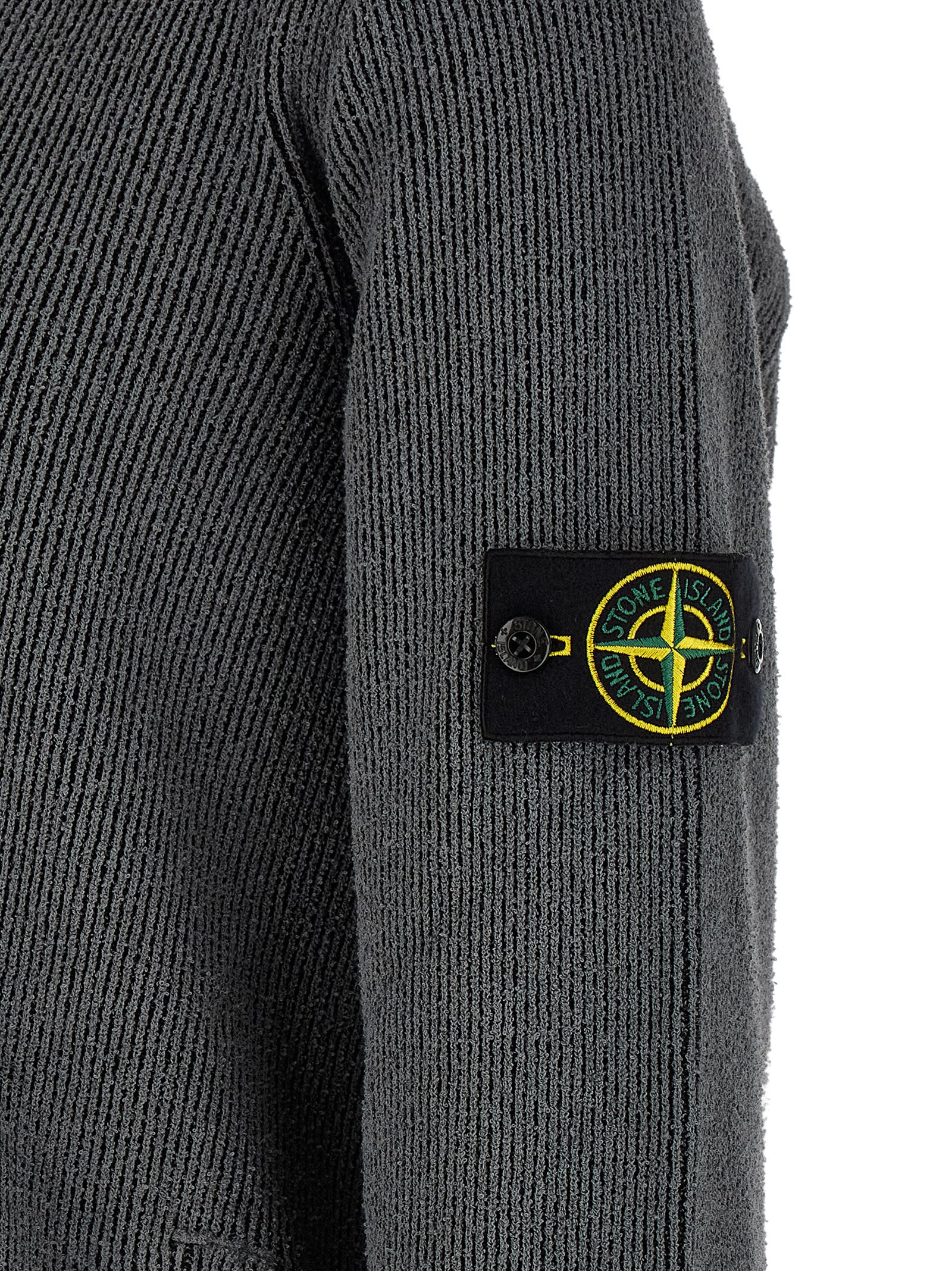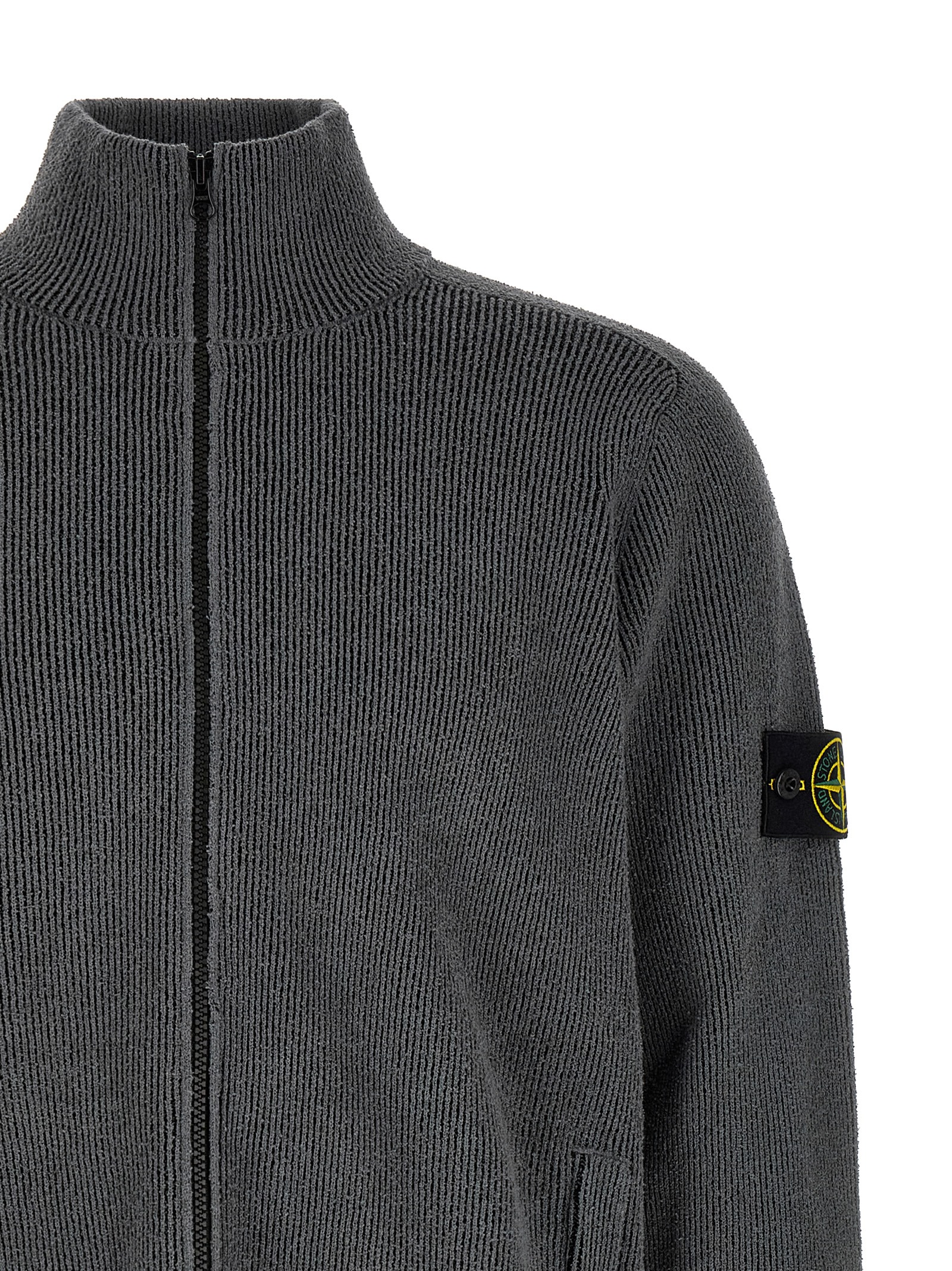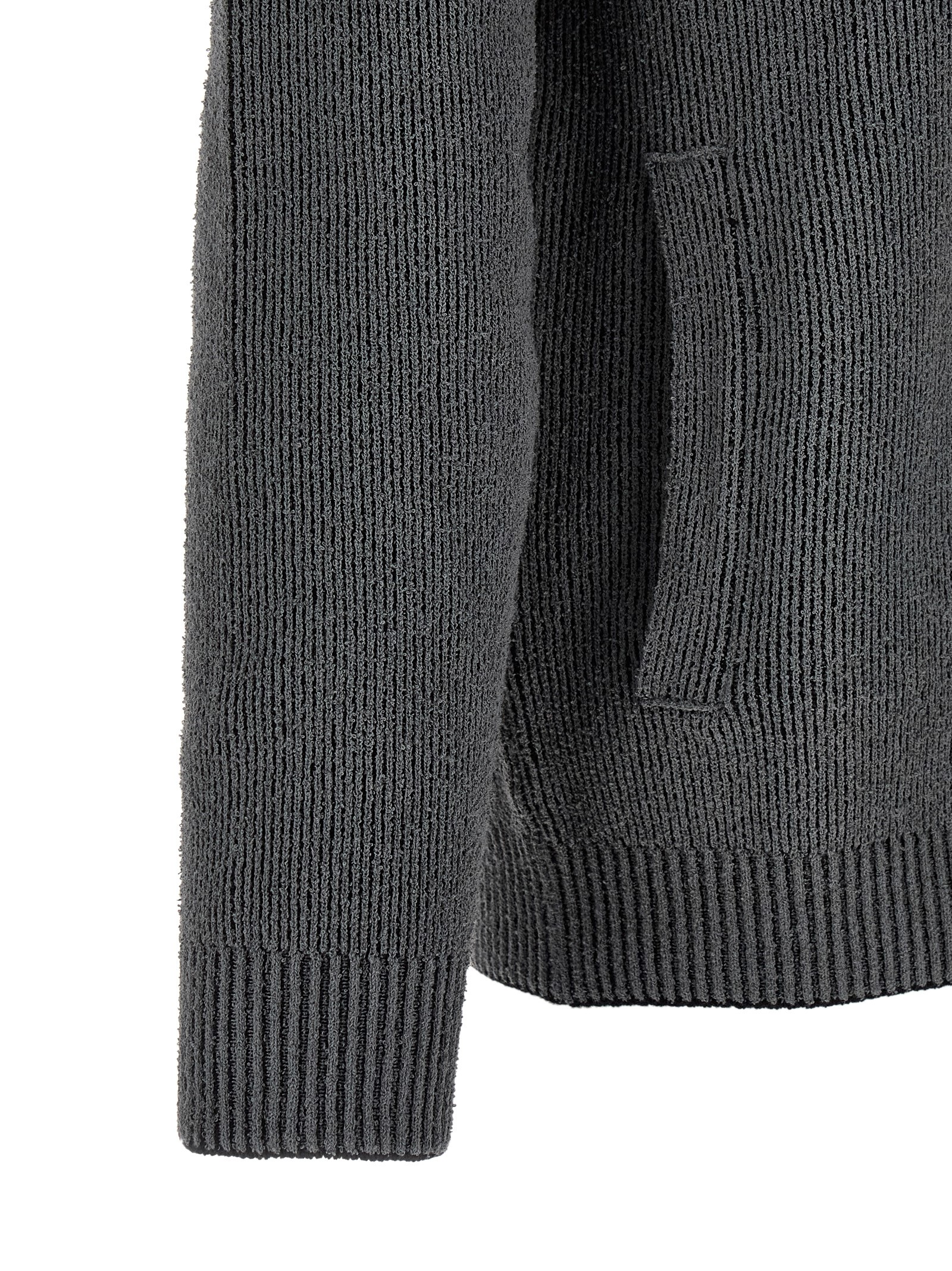 5100034' plated ribbed 14 bouclé cotton sweater with high neck, front zip closure, pockets, long raglan sleeves with cuffs and logo badge, and band on the hem.