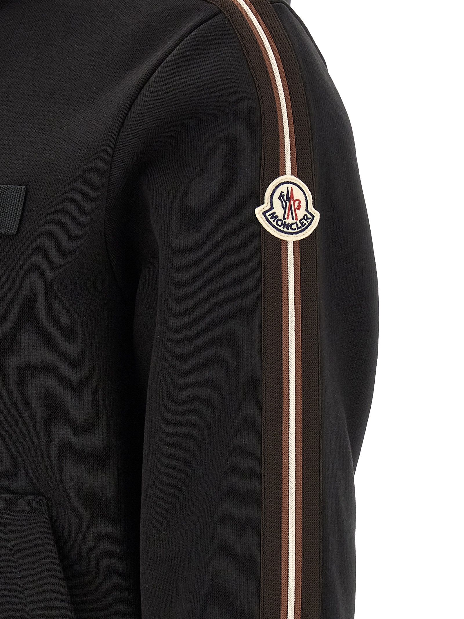 Brushed cotton sweatshirt, adjustable tone-on-tone nylon hood, tone-on-tone embroidered logo patch and front zip closure, pockets, long cuffed sleeves, tricolor finish and felt logo patch, headband.