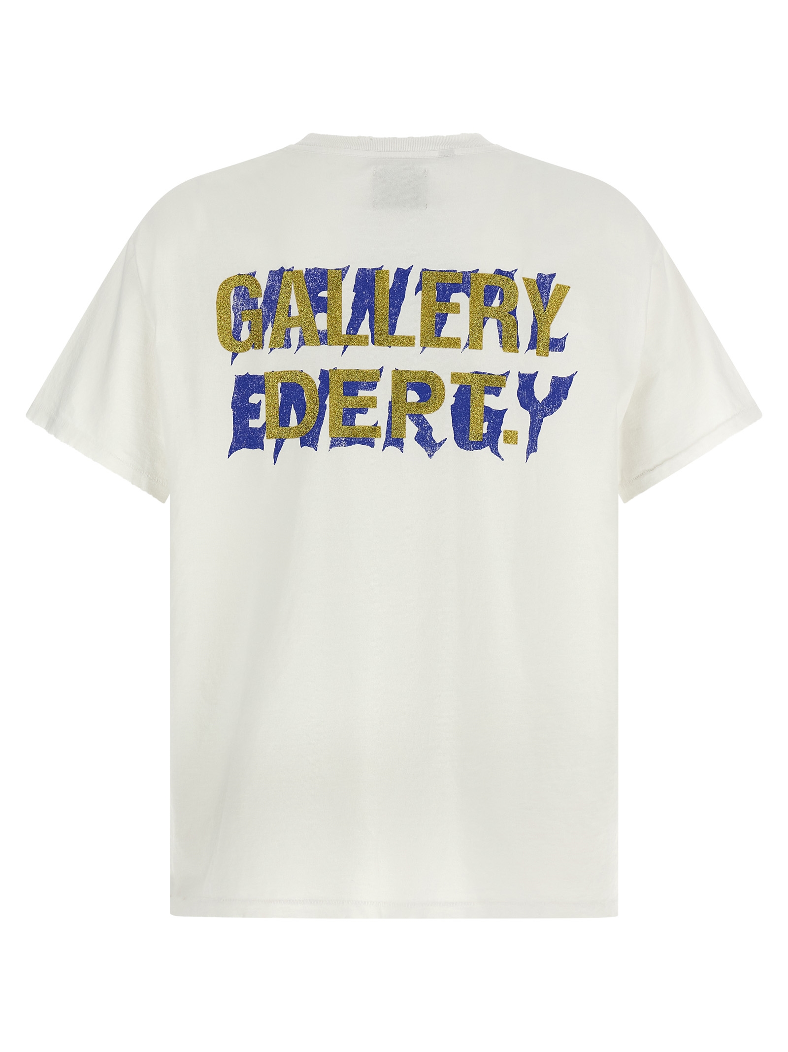 'Wisdom' used-effect cotton T-shirt with front 'Mental Energy' print, 'GD ENGLISH' logo print with glitter at the back, crew neck, short sleeves with dropped shoulders.