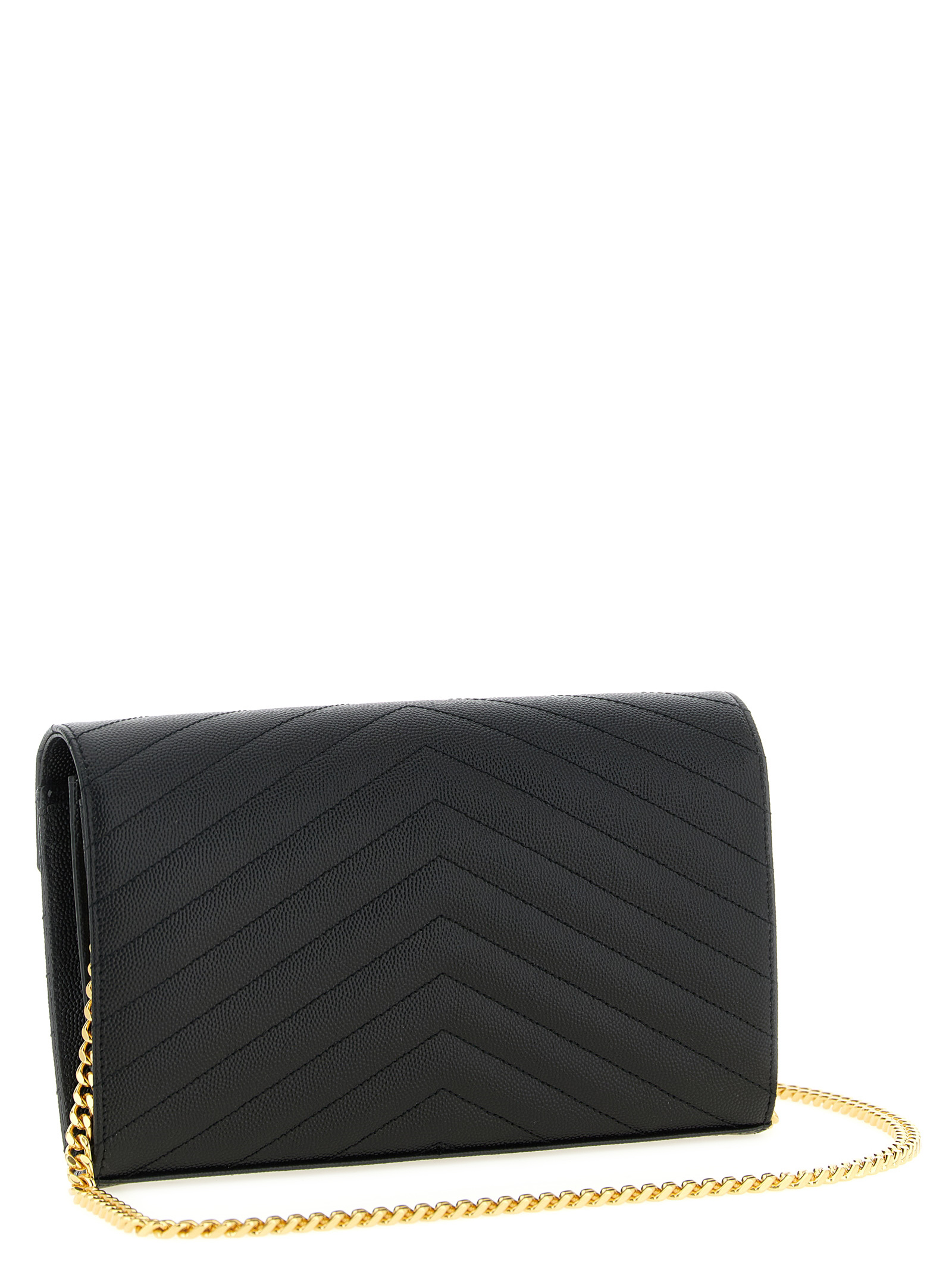 Saint Laurent iconic matelassé grain de poudre leather bag featuring a gold metal logo and a chain shoulder strap.
