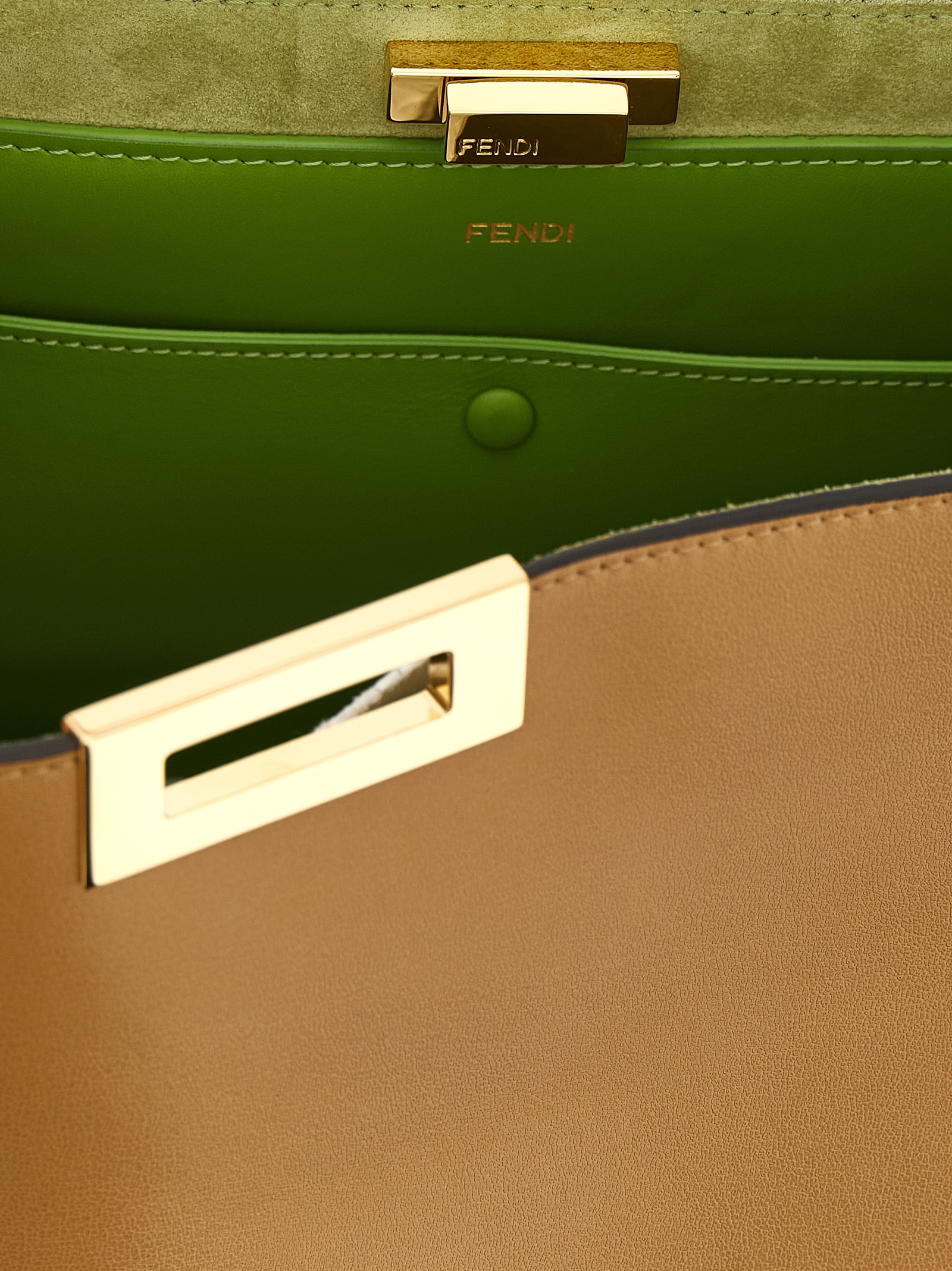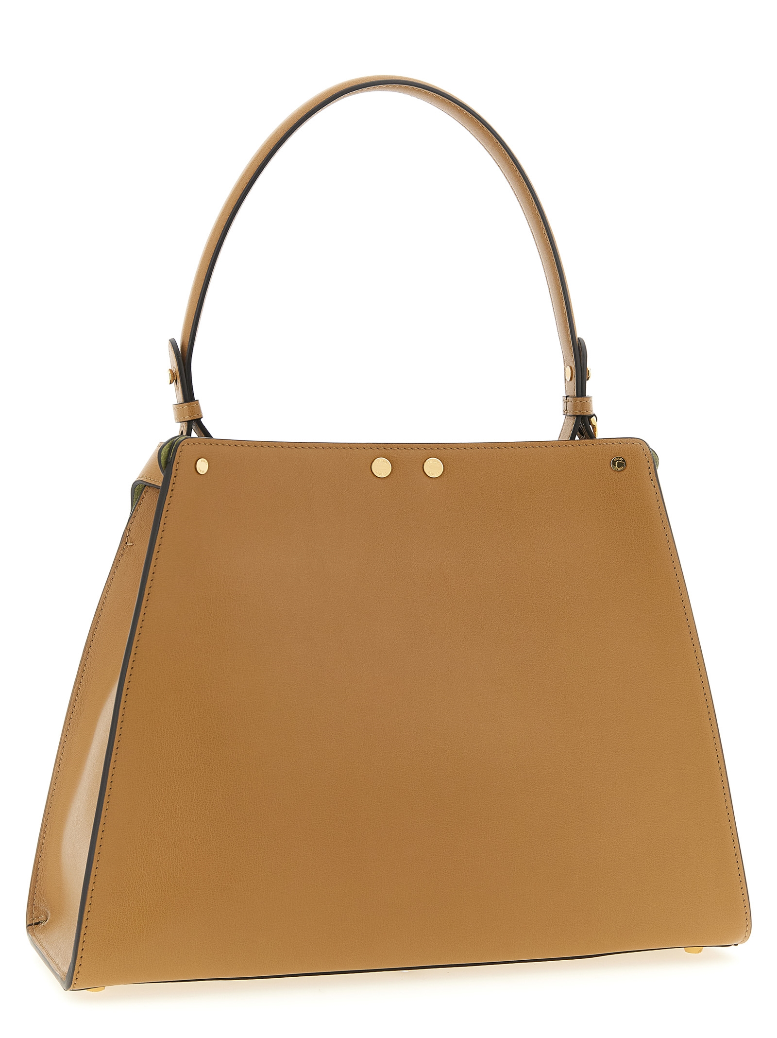Medium 'Fendi Way' semi-gloss calf leather handbag with contrast suede lining, iconic metal swivel closure, adjustable handle, rigid base with metal feet.