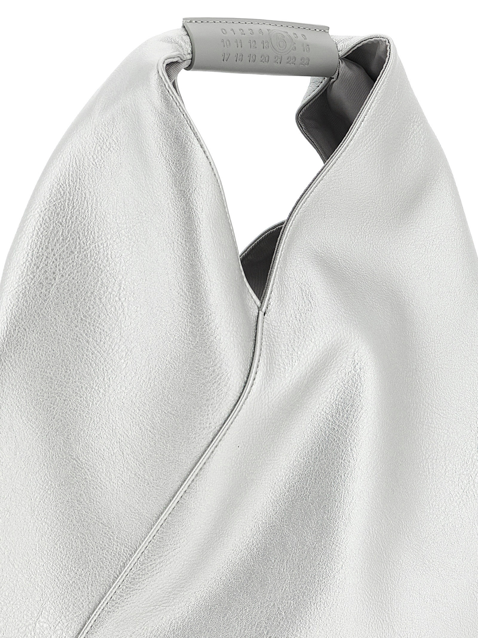 'Japanese Small' handbag in hammered laminated leather-effect fabric, fixed smooth leather handle with embossed 'Numeric Signature MM6', inner snap button closure, back 'White stitch line', origami inspired triangle pleats with Pressure.