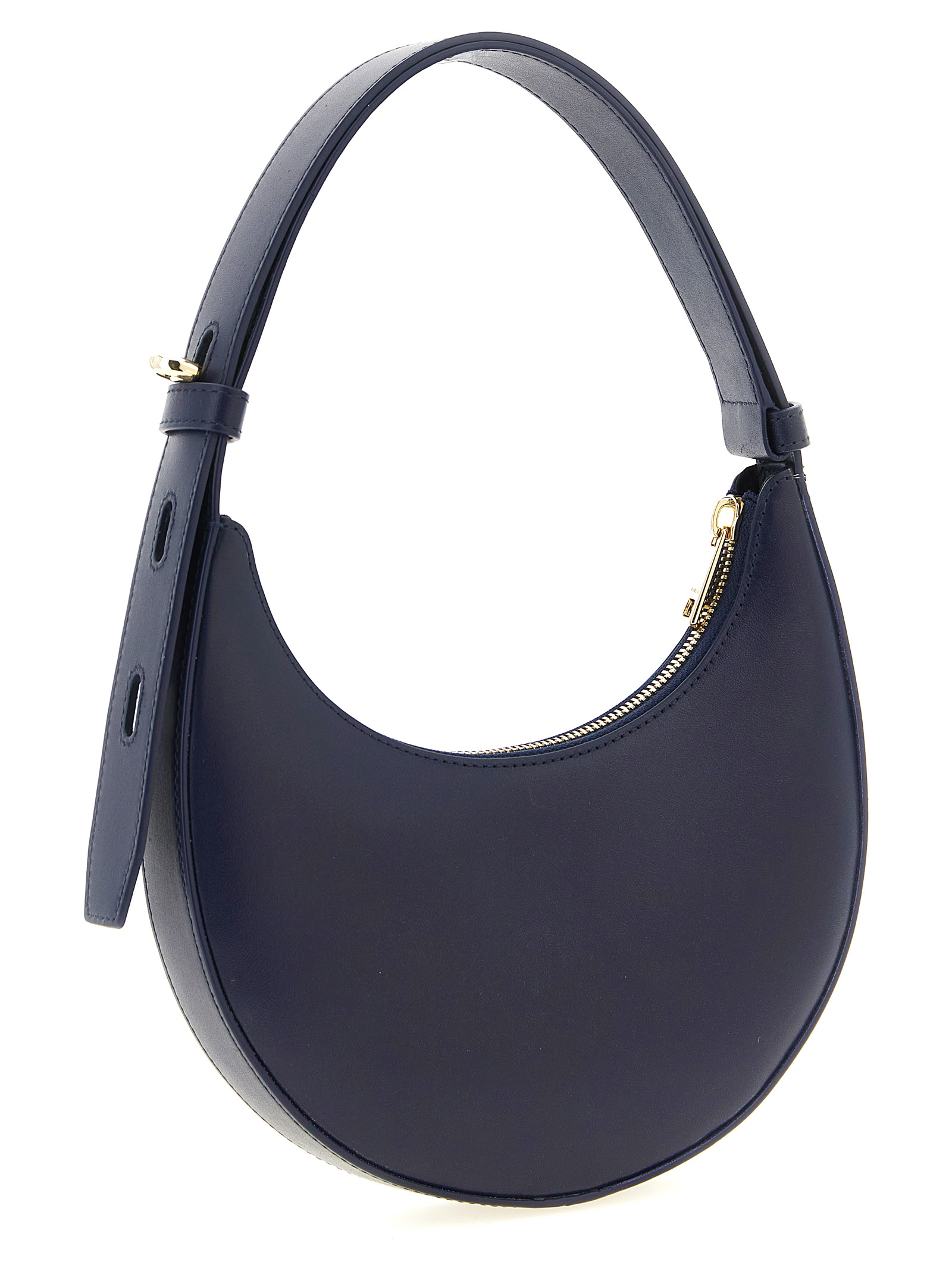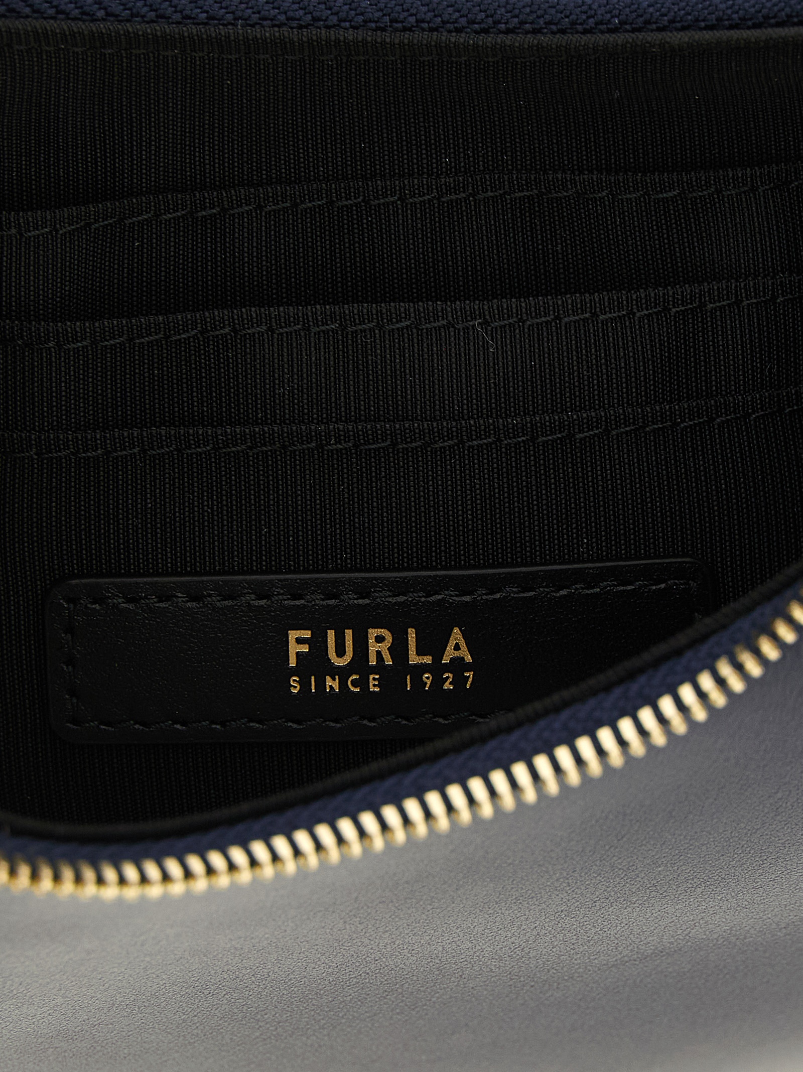 'Furla Delizia' mini leather shoulder bag with a silky and smooth touch, rigid crescent structure, front embossed logo, top zip closure, adjustable handle with metal swivel mechanism.