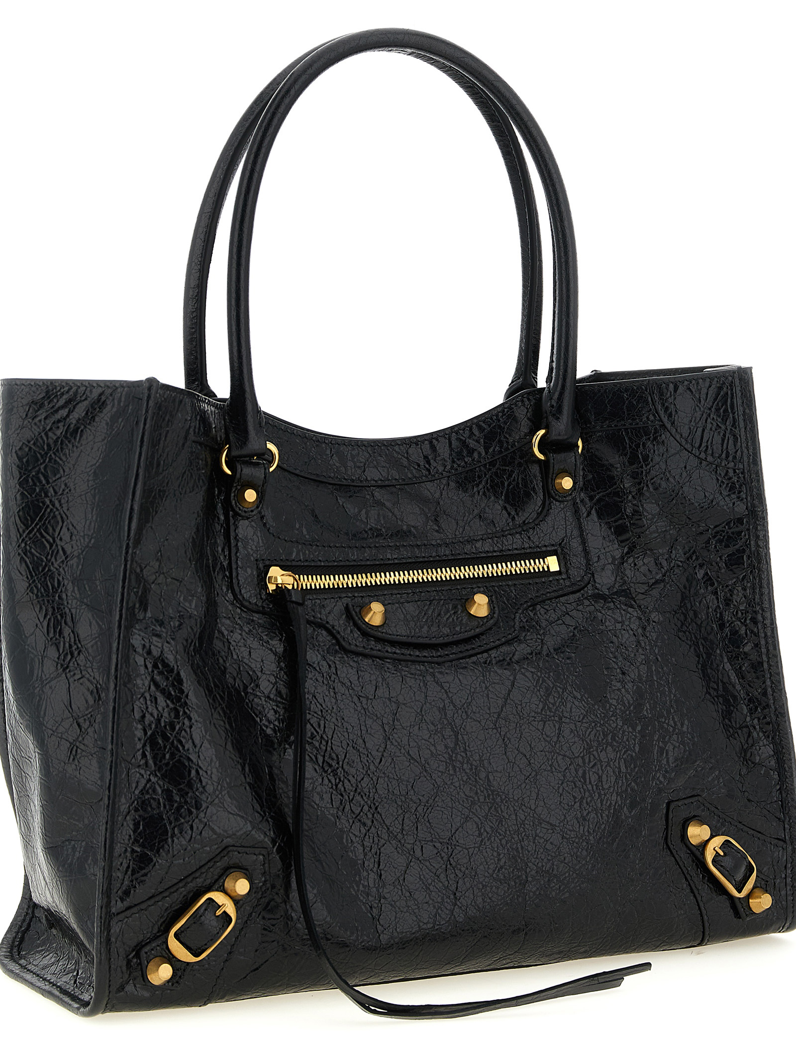 Arena Storico 'Le City S' lambskin shopping bag with antiqued gold studs, double fixed handle, internal magnetic closure, front zip pocket, cotton canvas lining, adjustable and removable shoulder strap.