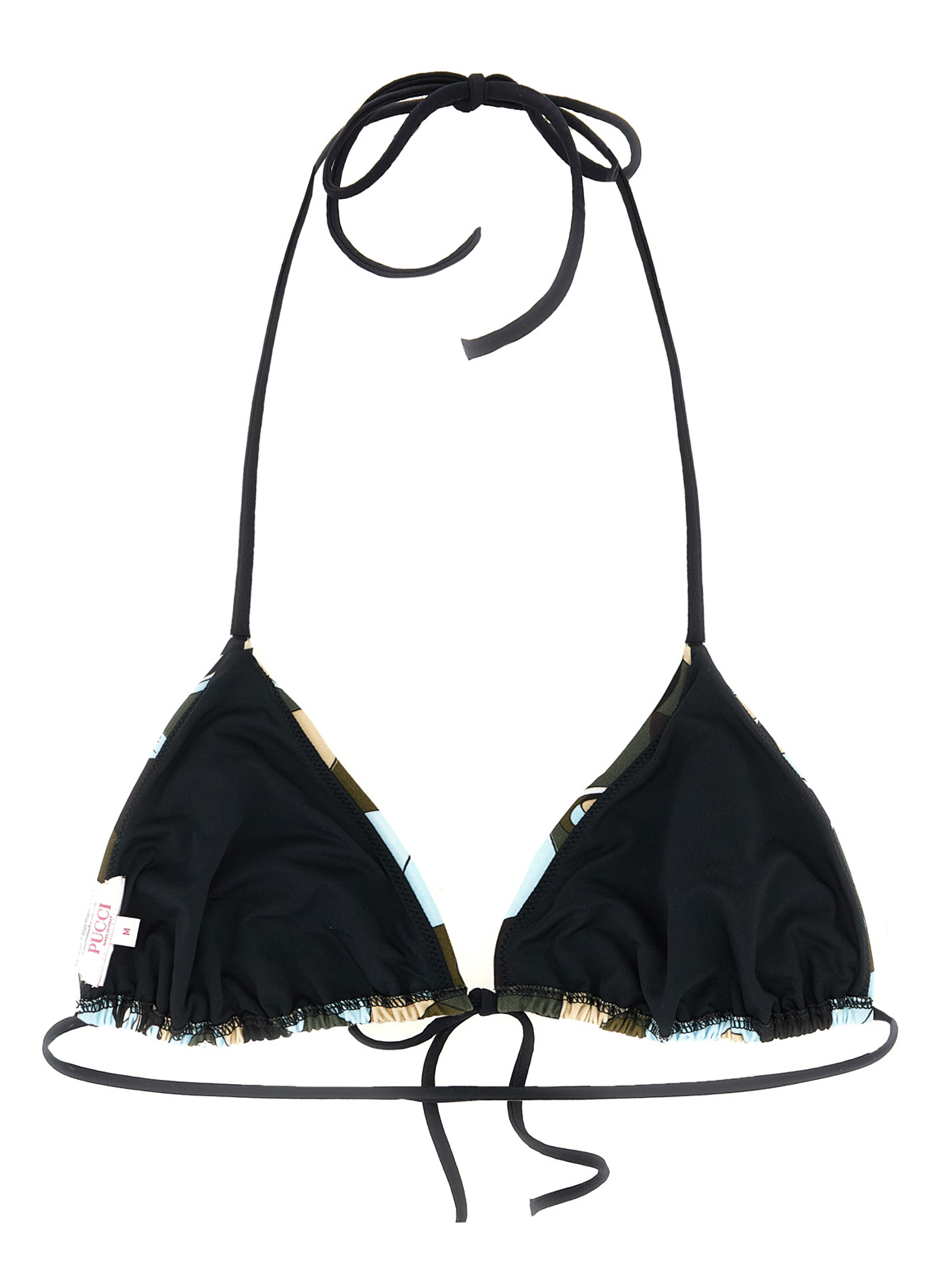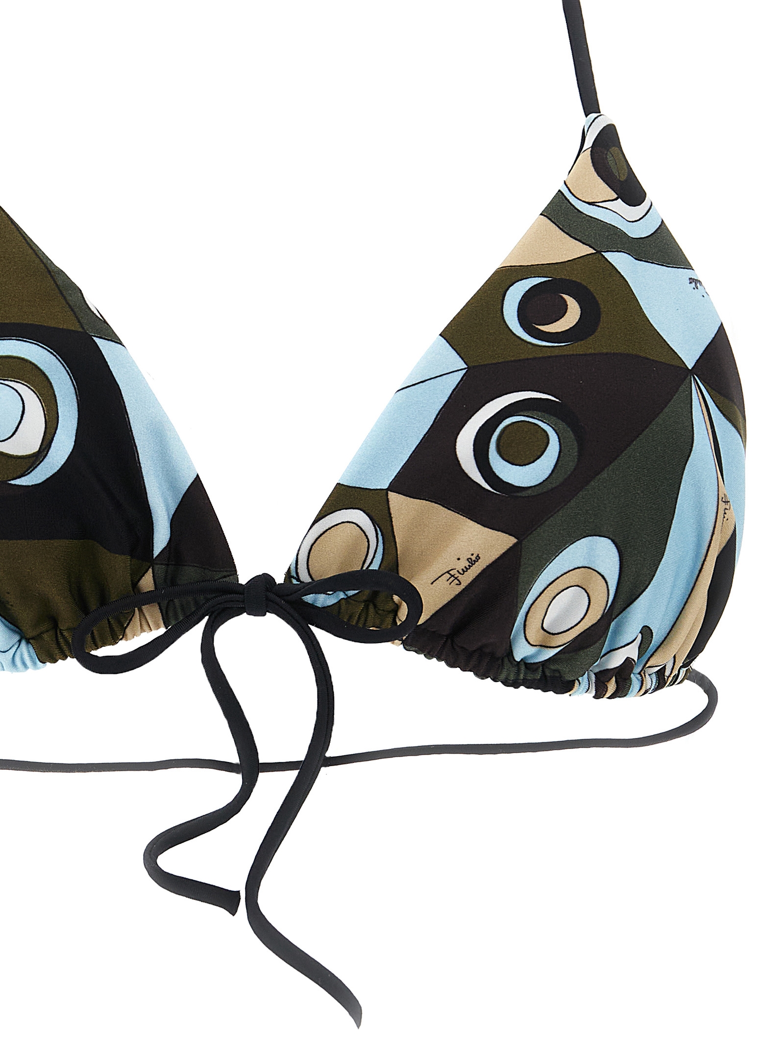 Triangle Lycra bikini top with 'Occhi' print, front knot closure and thin adjustable straps at the neck.