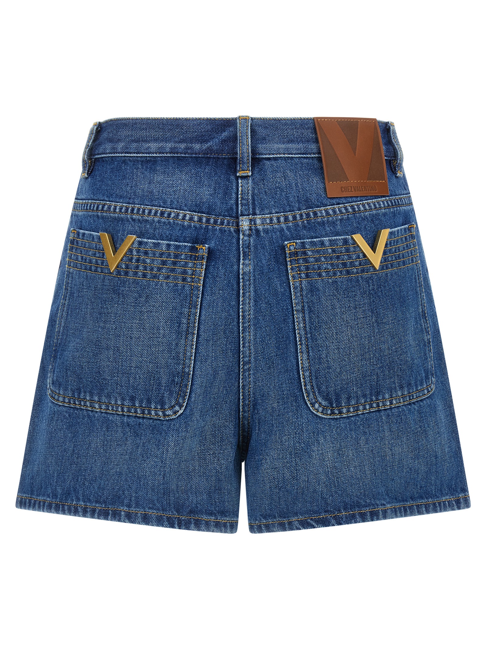 Solid denim shorts medium stone washed with contrast stitching, zip and front button closure, pockets, VGold metallic antiqued effect detail on back pockets.