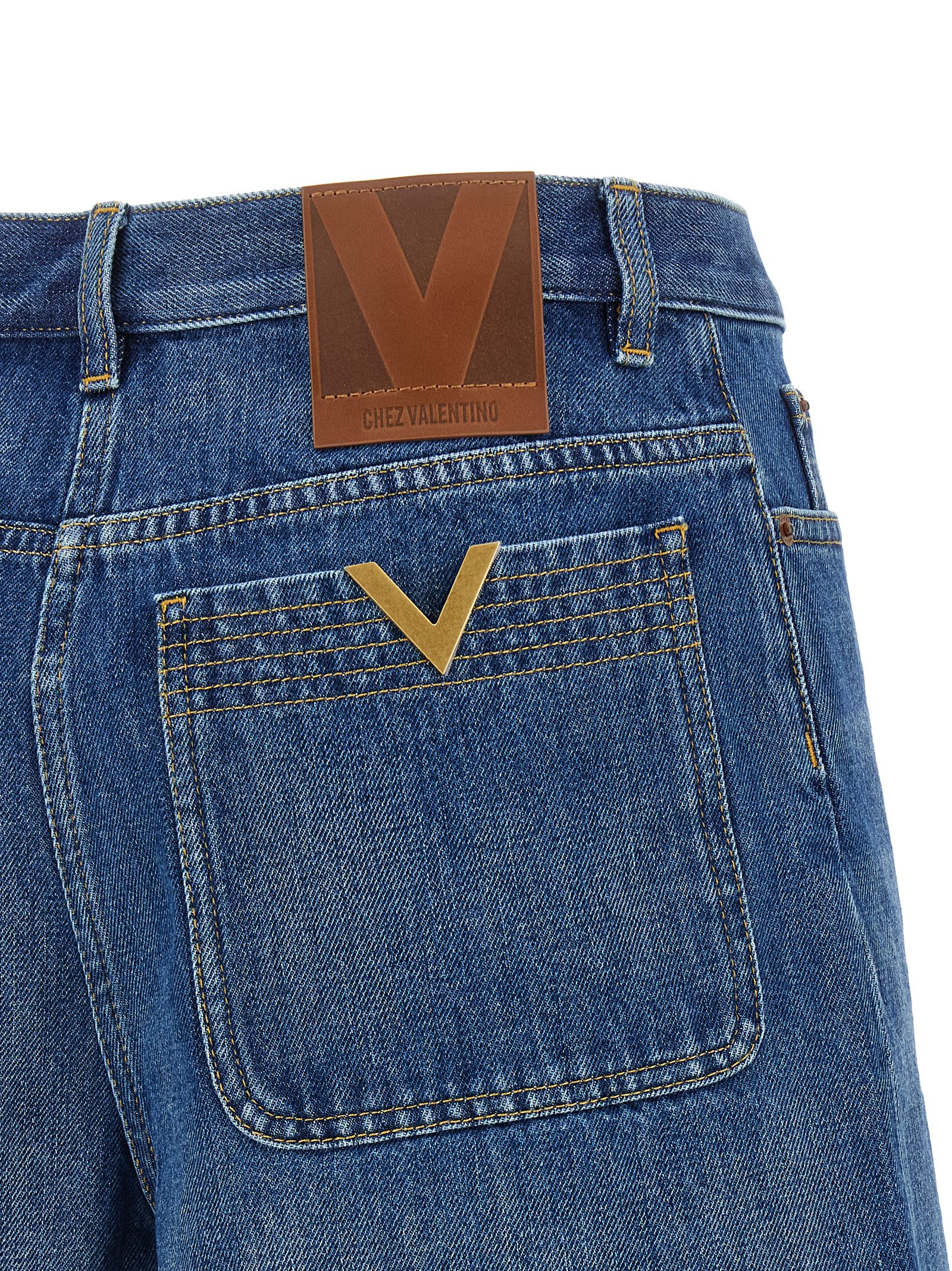 Solid denim shorts medium stone washed with contrast stitching, zip and front button closure, pockets, VGold metallic antiqued effect detail on back pockets.