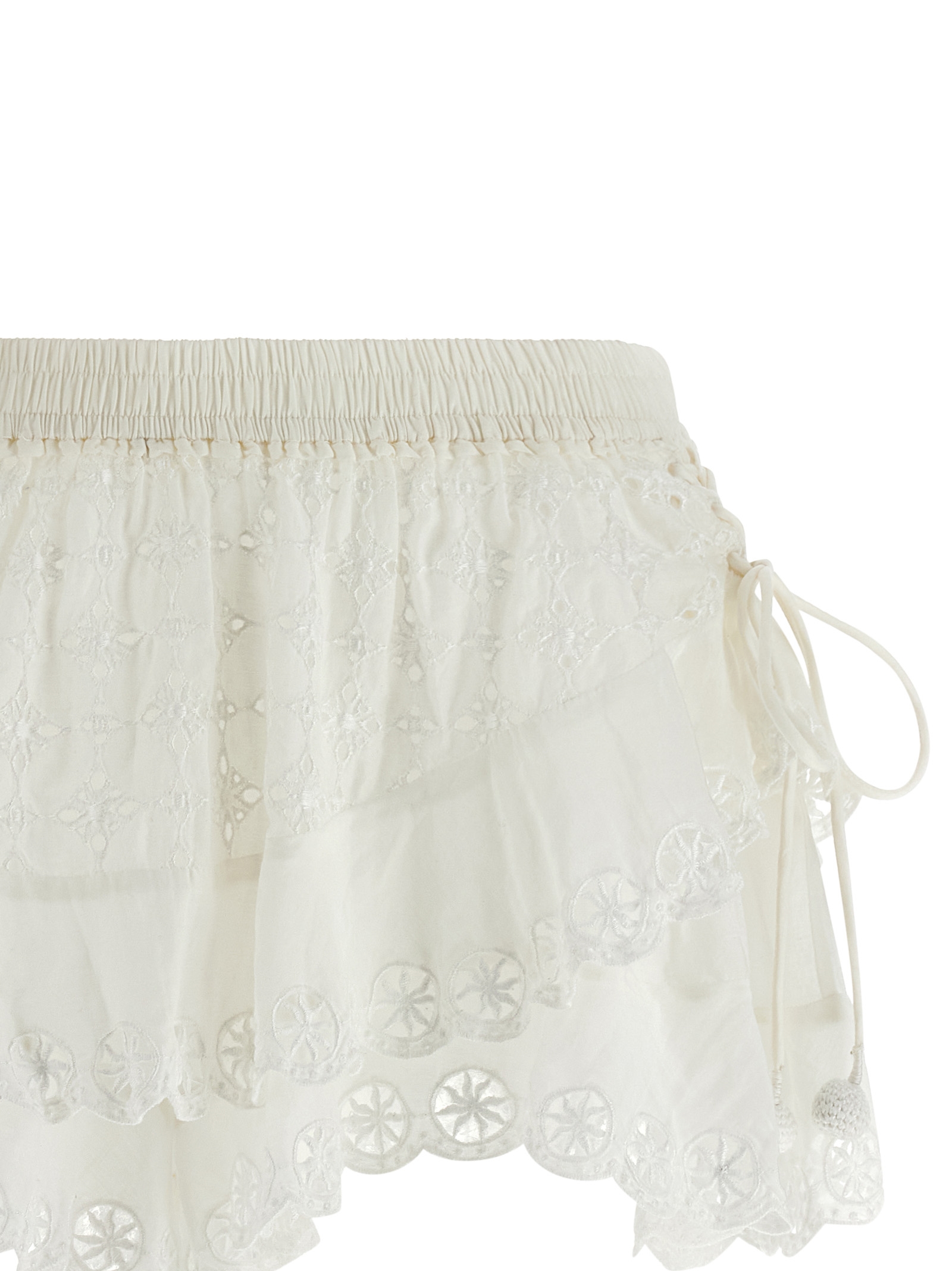 'Neis' cotton shorts, skort model with cotton and lace ruffles with embroideries, elastic waistband, lanyards on the sides to be tied with ponpons.